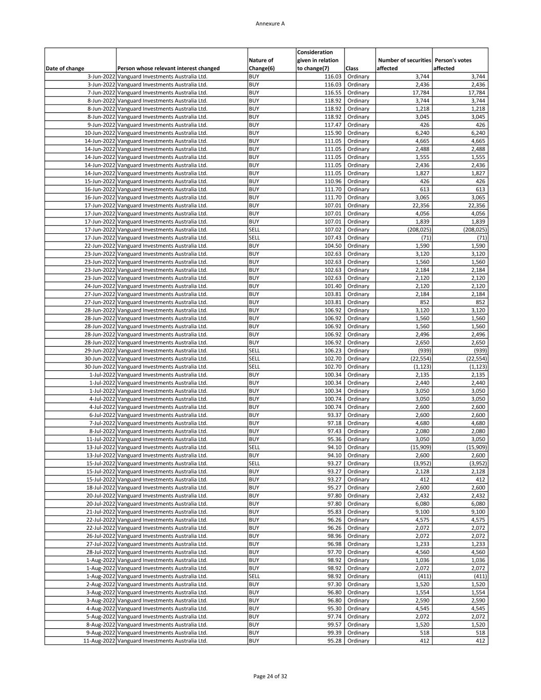 Annexure A Date of change Person whose relevant interest changed Nature of Change(6) Consideration given in relation to change(7) Class Number of securities affected Person's votes affected 3-Jun-2022 Vanguard Investments Australia Ltd. BUY 116.03 Ordinary 3,744 3,744 3-Jun-2022 Vanguard Investments Australia Ltd. BUY 116.03 Ordinary 2,436 2,436 7-Jun-2022 Vanguard Investments Australia Ltd. BUY 116.55 Ordinary 17,784 17,784 8-Jun-2022 Vanguard Investments Australia Ltd. BUY 118.92 Ordinary 3,744 3,744 8-Jun-2022 Vanguard Investments Australia Ltd. BUY 118.92 Ordinary 1,218 1,218 8-Jun-2022 Vanguard Investments Australia Ltd. BUY 118.92 Ordinary 3,045 3,045 9-Jun-2022 Vanguard Investments Australia Ltd. BUY 117.47 Ordinary 426 426 10-Jun-2022 Vanguard Investments Australia Ltd. BUY 115.90 Ordinary 6,240 6,240 14-Jun-2022 Vanguard Investments Australia Ltd. BUY 111.05 Ordinary 4,665 4,665 14-Jun-2022 Vanguard Investments Australia Ltd. BUY 111.05 Ordinary 2,488 2,488 14-Jun-2022 Vanguard Investments Australia Ltd. BUY 111.05 Ordinary 1,555 1,555 14-Jun-2022 Vanguard Investments Australia Ltd. BUY 111.05 Ordinary 2,436 2,436 14-Jun-2022 Vanguard Investments Australia Ltd. BUY 111.05 Ordinary 1,827 1,827 15-Jun-2022 Vanguard Investments Australia Ltd. BUY 110.96 Ordinary 426 426 16-Jun-2022 Vanguard Investments Australia Ltd. BUY 111.70 Ordinary 613 613 16-Jun-2022 Vanguard Investments Australia Ltd. BUY 111.70 Ordinary 3,065 3,065 17-Jun-2022 Vanguard Investments Australia Ltd. BUY 107.01 Ordinary 22,356 22,356 17-Jun-2022 Vanguard Investments Australia Ltd. BUY 107.01 Ordinary 4,056 4,056 17-Jun-2022 Vanguard Investments Australia Ltd. BUY 107.01 Ordinary 1,839 1,839 17-Jun-2022 Vanguard Investments Australia Ltd. SELL 107.02 Ordinary (208,025) (208,025) 17-Jun-2022 Vanguard Investments Australia Ltd. SELL 107.43 Ordinary (71) (71) 22-Jun-2022 Vanguard Investments Australia Ltd. BUY 104.50 Ordinary 1,590 1,590 23-Jun-2022 Vanguard Investments Australia Ltd. BUY 102.63 Ordinary 3,120 3,120 23-Jun-2022 Vanguard Investments Australia Ltd. BUY 102.63 Ordinary 1,560 1,560 23-Jun-2022 Vanguard Investments Australia Ltd. BUY 102.63 Ordinary 2,184 2,184 23-Jun-2022 Vanguard Investments Australia Ltd. BUY 102.63 Ordinary 2,120 2,120 24-Jun-2022 Vanguard Investments Australia Ltd. BUY 101.40 Ordinary 2,120 2,120 27-Jun-2022 Vanguard Investments Australia Ltd. BUY 103.81 Ordinary 2,184 2,184 27-Jun-2022 Vanguard Investments Australia Ltd. BUY 103.81 Ordinary 852 852 28-Jun-2022 Vanguard Investments Australia Ltd. BUY 106.92 Ordinary 3,120 3,120 28-Jun-2022 Vanguard Investments Australia Ltd. BUY 106.92 Ordinary 1,560 1,560 28-Jun-2022 Vanguard Investments Australia Ltd. BUY 106.92 Ordinary 1,560 1,560 28-Jun-2022 Vanguard Investments Australia Ltd. BUY 106.92 Ordinary 2,496 2,496 28-Jun-2022 Vanguard Investments Australia Ltd. BUY 106.92 Ordinary 2,650 2,650 29-Jun-2022 Vanguard Investments Australia Ltd. SELL 106.23 Ordinary (939) (939) 30-Jun-2022 Vanguard Investments Australia Ltd. SELL 102.70 Ordinary (22,554) (22,554) 30-Jun-2022 Vanguard Investments Australia Ltd. SELL 102.70 Ordinary (1,123) (1,123) 1-Jul-2022 Vanguard Investments Australia Ltd. BUY 100.34 Ordinary 2,135 2,135 1-Jul-2022 Vanguard Investments Australia Ltd. BUY 100.34 Ordinary 2,440 2,440 1-Jul-2022 Vanguard Investments Australia Ltd. BUY 100.34 Ordinary 3,050 3,050 4-Jul-2022 Vanguard Investments Australia Ltd. BUY 100.74 Ordinary 3,050 3,050 4-Jul-2022 Vanguard Investments Australia Ltd. BUY 100.74 Ordinary 2,600 2,600 6-Jul-2022 Vanguard Investments Australia Ltd. BUY 93.37 Ordinary 2,600 2,600 7-Jul-2022 Vanguard Investments Australia Ltd. BUY 97.18 Ordinary 4,680 4,680 8-Jul-2022 Vanguard Investments Australia Ltd. BUY 97.43 Ordinary 2,080 2,080 11-Jul-2022 Vanguard Investments Australia Ltd. BUY 95.36 Ordinary 3,050 3,050 13-Jul-2022 Vanguard Investments Australia Ltd. SELL 94.10 Ordinary (15,909) (15,909) 13-Jul-2022 Vanguard Investments Australia Ltd. BUY 94.10 Ordinary 2,600 2,600 15-Jul-2022 Vanguard Investments Australia Ltd. SELL 93.27 Ordinary (3,952) (3,952) 15-Jul-2022 Vanguard Investments Australia Ltd. BUY 93.27 Ordinary 2,128 2,128 15-Jul-2022 Vanguard Investments Australia Ltd. BUY 93.27 Ordinary 412 412 18-Jul-2022 Vanguard Investments Australia Ltd. BUY 95.27 Ordinary 2,600 2,600 20-Jul-2022 Vanguard Investments Australia Ltd. BUY 97.80 Ordinary 2,432 2,432 20-Jul-2022 Vanguard Investments Australia Ltd. BUY 97.80 Ordinary 6,080 6,080 21-Jul-2022 Vanguard Investments Australia Ltd. BUY 95.83 Ordinary 9,100 9,100 22-Jul-2022 Vanguard Investments Australia Ltd. BUY 96.26 Ordinary 4,575 4,575 22-Jul-2022 Vanguard Investments Australia Ltd. BUY 96.26 Ordinary 2,072 2,072 26-Jul-2022 Vanguard Investments Australia Ltd. BUY 98.96 Ordinary 2,072 2,072 27-Jul-2022 Vanguard Investments Australia Ltd. BUY 96.98 Ordinary 1,233 1,233 28-Jul-2022 Vanguard Investments Australia Ltd. BUY 97.70 Ordinary 4,560 4,560 1-Aug-2022 Vanguard Investments Australia Ltd. BUY 98.92 Ordinary 1,036 1,036 1-Aug-2022 Vanguard Investments Australia Ltd. BUY 98.92 Ordinary 2,072 2,072 1-Aug-2022 Vanguard Investments Australia Ltd. SELL 98.92 Ordinary (411) (411) 2-Aug-2022 Vanguard Investments Australia Ltd. BUY 97.30 Ordinary 1,520 1,520 3-Aug-2022 Vanguard Investments Australia Ltd. BUY 96.80 Ordinary 1,554 1,554 3-Aug-2022 Vanguard Investments Australia Ltd. BUY 96.80 Ordinary 2,590 2,590 4-Aug-2022 Vanguard Investments Australia Ltd. BUY 95.30 Ordinary 4,545 4,545 5-Aug-2022 Vanguard Investments Australia Ltd. BUY 97.74 Ordinary 2,072 2,072 8-Aug-2022 Vanguard Investments Australia Ltd. BUY 99.57 Ordinary 1,520 1,520 9-Aug-2022 Vanguard Investments Australia Ltd. BUY 99.39 Ordinary 518 518 11-Aug-2022 Vanguard Investments Australia Ltd. BUY 95.28 Ordinary 412 412 Page 24 of 32