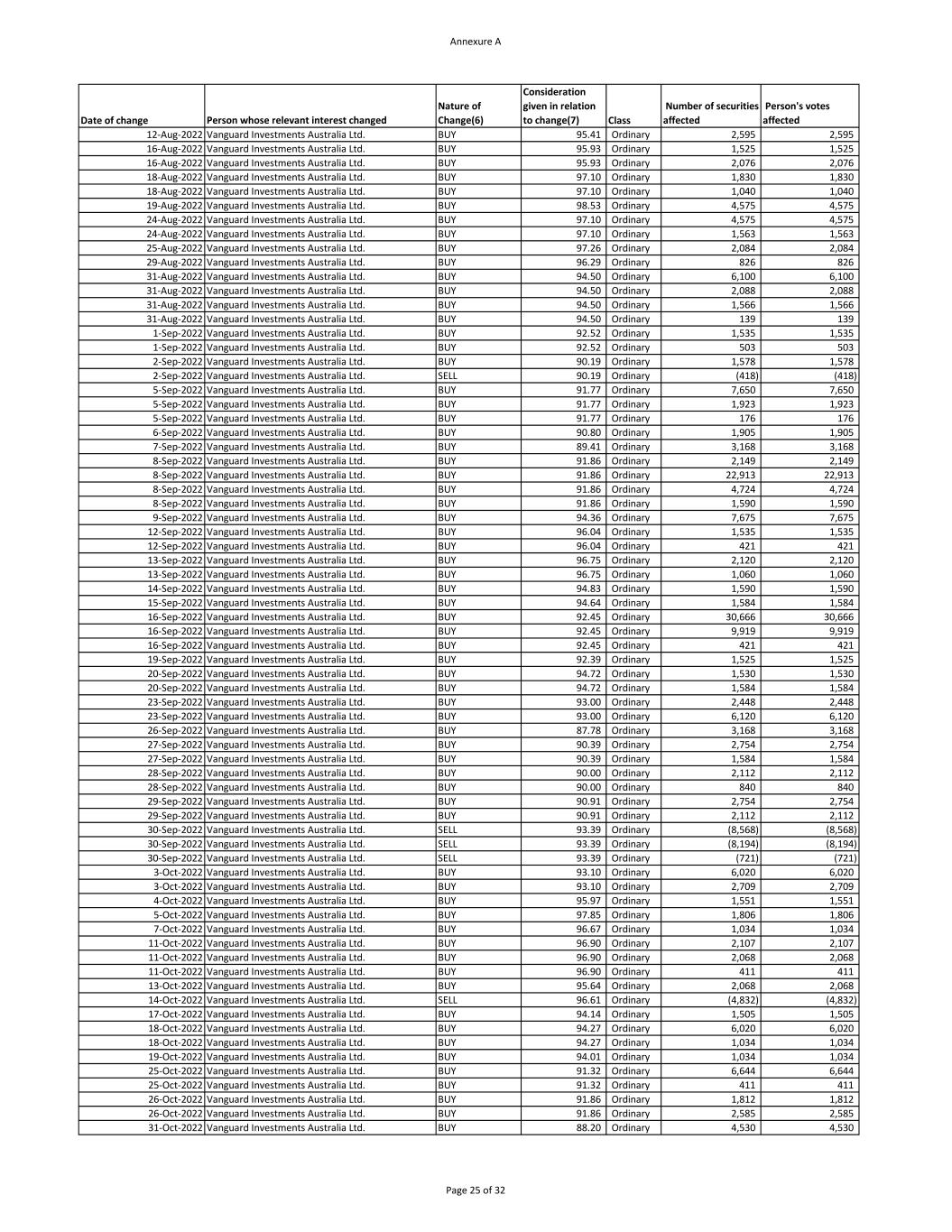 Annexure A Date of change Person whose relevant interest changed Nature of Change(6) Consideration given in relation to change(7) Class Number of securities affected Person's votes affected 12-Aug-2022 Vanguard Investments Australia Ltd. BUY 95.41 Ordinary 2,595 2,595 16-Aug-2022 Vanguard Investments Australia Ltd. BUY 95.93 Ordinary 1,525 1,525 16-Aug-2022 Vanguard Investments Australia Ltd. BUY 95.93 Ordinary 2,076 2,076 18-Aug-2022 Vanguard Investments Australia Ltd. BUY 97.10 Ordinary 1,830 1,830 18-Aug-2022 Vanguard Investments Australia Ltd. BUY 97.10 Ordinary 1,040 1,040 19-Aug-2022 Vanguard Investments Australia Ltd. BUY 98.53 Ordinary 4,575 4,575 24-Aug-2022 Vanguard Investments Australia Ltd. BUY 97.10 Ordinary 4,575 4,575 24-Aug-2022 Vanguard Investments Australia Ltd. BUY 97.10 Ordinary 1,563 1,563 25-Aug-2022 Vanguard Investments Australia Ltd. BUY 97.26 Ordinary 2,084 2,084 29-Aug-2022 Vanguard Investments Australia Ltd. BUY 96.29 Ordinary 826 826 31-Aug-2022 Vanguard Investments Australia Ltd. BUY 94.50 Ordinary 6,100 6,100 31-Aug-2022 Vanguard Investments Australia Ltd. BUY 94.50 Ordinary 2,088 2,088 31-Aug-2022 Vanguard Investments Australia Ltd. BUY 94.50 Ordinary 1,566 1,566 31-Aug-2022 Vanguard Investments Australia Ltd. BUY 94.50 Ordinary 139 139 1-Sep-2022 Vanguard Investments Australia Ltd. BUY 92.52 Ordinary 1,535 1,535 1-Sep-2022 Vanguard Investments Australia Ltd. BUY 92.52 Ordinary 503 503 2-Sep-2022 Vanguard Investments Australia Ltd. BUY 90.19 Ordinary 1,578 1,578 2-Sep-2022 Vanguard Investments Australia Ltd. SELL 90.19 Ordinary (418) (418) 5-Sep-2022 Vanguard Investments Australia Ltd. BUY 91.77 Ordinary 7,650 7,650 5-Sep-2022 Vanguard Investments Australia Ltd. BUY 91.77 Ordinary 1,923 1,923 5-Sep-2022 Vanguard Investments Australia Ltd. BUY 91.77 Ordinary 176 176 6-Sep-2022 Vanguard Investments Australia Ltd. BUY 90.80 Ordinary 1,905 1,905 7-Sep-2022 Vanguard Investments Australia Ltd. BUY 89.41 Ordinary 3,168 3,168 8-Sep-2022 Vanguard Investments Australia Ltd. BUY 91.86 Ordinary 2,149 2,149 8-Sep-2022 Vanguard Investments Australia Ltd. BUY 91.86 Ordinary 22,913 22,913 8-Sep-2022 Vanguard Investments Australia Ltd. BUY 91.86 Ordinary 4,724 4,724 8-Sep-2022 Vanguard Investments Australia Ltd. BUY 91.86 Ordinary 1,590 1,590 9-Sep-2022 Vanguard Investments Australia Ltd. BUY 94.36 Ordinary 7,675 7,675 12-Sep-2022 Vanguard Investments Australia Ltd. BUY 96.04 Ordinary 1,535 1,535 12-Sep-2022 Vanguard Investments Australia Ltd. BUY 96.04 Ordinary 421 421 13-Sep-2022 Vanguard Investments Australia Ltd. BUY 96.75 Ordinary 2,120 2,120 13-Sep-2022 Vanguard Investments Australia Ltd. BUY 96.75 Ordinary 1,060 1,060 14-Sep-2022 Vanguard Investments Australia Ltd. BUY 94.83 Ordinary 1,590 1,590 15-Sep-2022 Vanguard Investments Australia Ltd. BUY 94.64 Ordinary 1,584 1,584 16-Sep-2022 Vanguard Investments Australia Ltd. BUY 92.45 Ordinary 30,666 30,666 16-Sep-2022 Vanguard Investments Australia Ltd. BUY 92.45 Ordinary 9,919 9,919 16-Sep-2022 Vanguard Investments Australia Ltd. BUY 92.45 Ordinary 421 421 19-Sep-2022 Vanguard Investments Australia Ltd. BUY 92.39 Ordinary 1,525 1,525 20-Sep-2022 Vanguard Investments Australia Ltd. BUY 94.72 Ordinary 1,530 1,530 20-Sep-2022 Vanguard Investments Australia Ltd. BUY 94.72 Ordinary 1,584 1,584 23-Sep-2022 Vanguard Investments Australia Ltd. BUY 93.00 Ordinary 2,448 2,448 23-Sep-2022 Vanguard Investments Australia Ltd. BUY 93.00 Ordinary 6,120 6,120 26-Sep-2022 Vanguard Investments Australia Ltd. BUY 87.78 Ordinary 3,168 3,168 27-Sep-2022 Vanguard Investments Australia Ltd. BUY 90.39 Ordinary 2,754 2,754 27-Sep-2022 Vanguard Investments Australia Ltd. BUY 90.39 Ordinary 1,584 1,584 28-Sep-2022 Vanguard Investments Australia Ltd. BUY 90.00 Ordinary 2,112 2,112 28-Sep-2022 Vanguard Investments Australia Ltd. BUY 90.00 Ordinary 840 840 29-Sep-2022 Vanguard Investments Australia Ltd. BUY 90.91 Ordinary 2,754 2,754 29-Sep-2022 Vanguard Investments Australia Ltd. BUY 90.91 Ordinary 2,112 2,112 30-Sep-2022 Vanguard Investments Australia Ltd. SELL 93.39 Ordinary (8,568) (8,568) 30-Sep-2022 Vanguard Investments Australia Ltd. SELL 93.39 Ordinary (8,194) (8,194) 30-Sep-2022 Vanguard Investments Australia Ltd. SELL 93.39 Ordinary (721) (721) 3-Oct-2022 Vanguard Investments Australia Ltd. BUY 93.10 Ordinary 6,020 6,020 3-Oct-2022 Vanguard Investments Australia Ltd. BUY 93.10 Ordinary 2,709 2,709 4-Oct-2022 Vanguard Investments Australia Ltd. BUY 95.97 Ordinary 1,551 1,551 5-Oct-2022 Vanguard Investments Australia Ltd. BUY 97.85 Ordinary 1,806 1,806 7-Oct-2022 Vanguard Investments Australia Ltd. BUY 96.67 Ordinary 1,034 1,034 11-Oct-2022 Vanguard Investments Australia Ltd. BUY 96.90 Ordinary 2,107 2,107 11-Oct-2022 Vanguard Investments Australia Ltd. BUY 96.90 Ordinary 2,068 2,068 11-Oct-2022 Vanguard Investments Australia Ltd. BUY 96.90 Ordinary 411 411 13-Oct-2022 Vanguard Investments Australia Ltd. BUY 95.64 Ordinary 2,068 2,068 14-Oct-2022 Vanguard Investments Australia Ltd. SELL 96.61 Ordinary (4,832) (4,832) 17-Oct-2022 Vanguard Investments Australia Ltd. BUY 94.14 Ordinary 1,505 1,505 18-Oct-2022 Vanguard Investments Australia Ltd. BUY 94.27 Ordinary 6,020 6,020 18-Oct-2022 Vanguard Investments Australia Ltd. BUY 94.27 Ordinary 1,034 1,034 19-Oct-2022 Vanguard Investments Australia Ltd. BUY 94.01 Ordinary 1,034 1,034 25-Oct-2022 Vanguard Investments Australia Ltd. BUY 91.32 Ordinary 6,644 6,644 25-Oct-2022 Vanguard Investments Australia Ltd. BUY 91.32 Ordinary 411 411 26-Oct-2022 Vanguard Investments Australia Ltd. BUY 91.86 Ordinary 1,812 1,812 26-Oct-2022 Vanguard Investments Australia Ltd. BUY 91.86 Ordinary 2,585 2,585 31-Oct-2022 Vanguard Investments Australia Ltd. BUY 88.20 Ordinary 4,530 4,530 Page 25 of 32