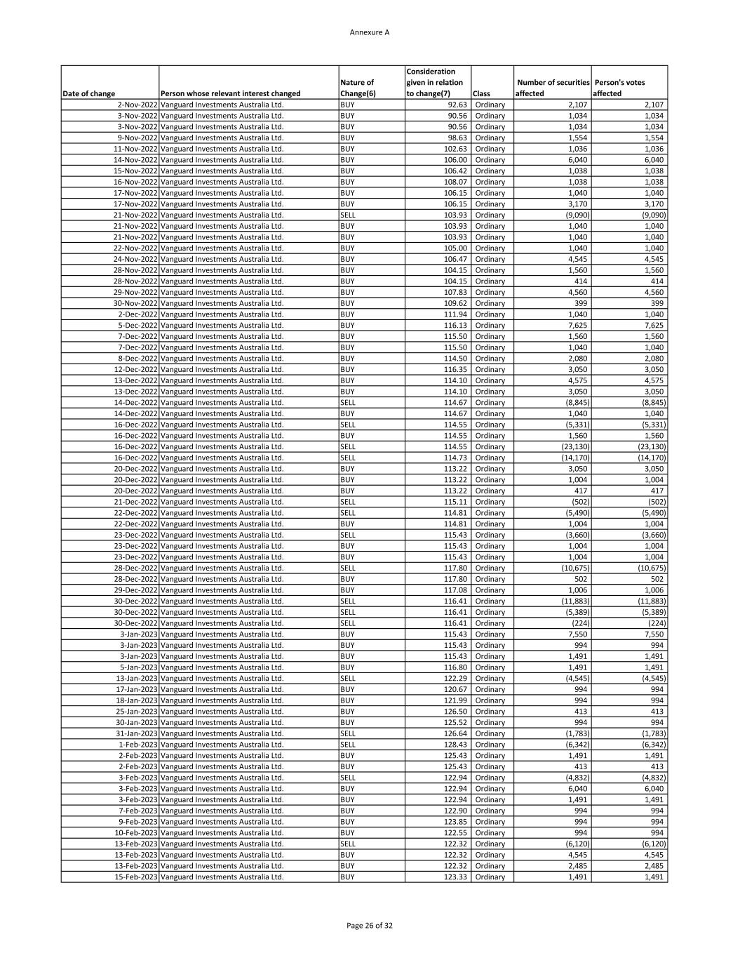 Annexure A Date of change Person whose relevant interest changed Nature of Change(6) Consideration given in relation to change(7) Class Number of securities affected Person's votes affected 2-Nov-2022 Vanguard Investments Australia Ltd. BUY 92.63 Ordinary 2,107 2,107 3-Nov-2022 Vanguard Investments Australia Ltd. BUY 90.56 Ordinary 1,034 1,034 3-Nov-2022 Vanguard Investments Australia Ltd. BUY 90.56 Ordinary 1,034 1,034 9-Nov-2022 Vanguard Investments Australia Ltd. BUY 98.63 Ordinary 1,554 1,554 11-Nov-2022 Vanguard Investments Australia Ltd. BUY 102.63 Ordinary 1,036 1,036 14-Nov-2022 Vanguard Investments Australia Ltd. BUY 106.00 Ordinary 6,040 6,040 15-Nov-2022 Vanguard Investments Australia Ltd. BUY 106.42 Ordinary 1,038 1,038 16-Nov-2022 Vanguard Investments Australia Ltd. BUY 108.07 Ordinary 1,038 1,038 17-Nov-2022 Vanguard Investments Australia Ltd. BUY 106.15 Ordinary 1,040 1,040 17-Nov-2022 Vanguard Investments Australia Ltd. BUY 106.15 Ordinary 3,170 3,170 21-Nov-2022 Vanguard Investments Australia Ltd. SELL 103.93 Ordinary (9,090) (9,090) 21-Nov-2022 Vanguard Investments Australia Ltd. BUY 103.93 Ordinary 1,040 1,040 21-Nov-2022 Vanguard Investments Australia Ltd. BUY 103.93 Ordinary 1,040 1,040 22-Nov-2022 Vanguard Investments Australia Ltd. BUY 105.00 Ordinary 1,040 1,040 24-Nov-2022 Vanguard Investments Australia Ltd. BUY 106.47 Ordinary 4,545 4,545 28-Nov-2022 Vanguard Investments Australia Ltd. BUY 104.15 Ordinary 1,560 1,560 28-Nov-2022 Vanguard Investments Australia Ltd. BUY 104.15 Ordinary 414 414 29-Nov-2022 Vanguard Investments Australia Ltd. BUY 107.83 Ordinary 4,560 4,560 30-Nov-2022 Vanguard Investments Australia Ltd. BUY 109.62 Ordinary 399 399 2-Dec-2022 Vanguard Investments Australia Ltd. BUY 111.94 Ordinary 1,040 1,040 5-Dec-2022 Vanguard Investments Australia Ltd. BUY 116.13 Ordinary 7,625 7,625 7-Dec-2022 Vanguard Investments Australia Ltd. BUY 115.50 Ordinary 1,560 1,560 7-Dec-2022 Vanguard Investments Australia Ltd. BUY 115.50 Ordinary 1,040 1,040 8-Dec-2022 Vanguard Investments Australia Ltd. BUY 114.50 Ordinary 2,080 2,080 12-Dec-2022 Vanguard Investments Australia Ltd. BUY 116.35 Ordinary 3,050 3,050 13-Dec-2022 Vanguard Investments Australia Ltd. BUY 114.10 Ordinary 4,575 4,575 13-Dec-2022 Vanguard Investments Australia Ltd. BUY 114.10 Ordinary 3,050 3,050 14-Dec-2022 Vanguard Investments Australia Ltd. SELL 114.67 Ordinary (8,845) (8,845) 14-Dec-2022 Vanguard Investments Australia Ltd. BUY 114.67 Ordinary 1,040 1,040 16-Dec-2022 Vanguard Investments Australia Ltd. SELL 114.55 Ordinary (5,331) (5,331) 16-Dec-2022 Vanguard Investments Australia Ltd. BUY 114.55 Ordinary 1,560 1,560 16-Dec-2022 Vanguard Investments Australia Ltd. SELL 114.55 Ordinary (23,130) (23,130) 16-Dec-2022 Vanguard Investments Australia Ltd. SELL 114.73 Ordinary (14,170) (14,170) 20-Dec-2022 Vanguard Investments Australia Ltd. BUY 113.22 Ordinary 3,050 3,050 20-Dec-2022 Vanguard Investments Australia Ltd. BUY 113.22 Ordinary 1,004 1,004 20-Dec-2022 Vanguard Investments Australia Ltd. BUY 113.22 Ordinary 417 417 21-Dec-2022 Vanguard Investments Australia Ltd. SELL 115.11 Ordinary (502) (502) 22-Dec-2022 Vanguard Investments Australia Ltd. SELL 114.81 Ordinary (5,490) (5,490) 22-Dec-2022 Vanguard Investments Australia Ltd. BUY 114.81 Ordinary 1,004 1,004 23-Dec-2022 Vanguard Investments Australia Ltd. SELL 115.43 Ordinary (3,660) (3,660) 23-Dec-2022 Vanguard Investments Australia Ltd. BUY 115.43 Ordinary 1,004 1,004 23-Dec-2022 Vanguard Investments Australia Ltd. BUY 115.43 Ordinary 1,004 1,004 28-Dec-2022 Vanguard Investments Australia Ltd. SELL 117.80 Ordinary (10,675) (10,675) 28-Dec-2022 Vanguard Investments Australia Ltd. BUY 117.80 Ordinary 502 502 29-Dec-2022 Vanguard Investments Australia Ltd. BUY 117.08 Ordinary 1,006 1,006 30-Dec-2022 Vanguard Investments Australia Ltd. SELL 116.41 Ordinary (11,883) (11,883) 30-Dec-2022 Vanguard Investments Australia Ltd. SELL 116.41 Ordinary (5,389) (5,389) 30-Dec-2022 Vanguard Investments Australia Ltd. SELL 116.41 Ordinary (224) (224) 3-Jan-2023 Vanguard Investments Australia Ltd. BUY 115.43 Ordinary 7,550 7,550 3-Jan-2023 Vanguard Investments Australia Ltd. BUY 115.43 Ordinary 994 994 3-Jan-2023 Vanguard Investments Australia Ltd. BUY 115.43 Ordinary 1,491 1,491 5-Jan-2023 Vanguard Investments Australia Ltd. BUY 116.80 Ordinary 1,491 1,491 13-Jan-2023 Vanguard Investments Australia Ltd. SELL 122.29 Ordinary (4,545) (4,545) 17-Jan-2023 Vanguard Investments Australia Ltd. BUY 120.67 Ordinary 994 994 18-Jan-2023 Vanguard Investments Australia Ltd. BUY 121.99 Ordinary 994 994 25-Jan-2023 Vanguard Investments Australia Ltd. BUY 126.50 Ordinary 413 413 30-Jan-2023 Vanguard Investments Australia Ltd. BUY 125.52 Ordinary 994 994 31-Jan-2023 Vanguard Investments Australia Ltd. SELL 126.64 Ordinary (1,783) (1,783) 1-Feb-2023 Vanguard Investments Australia Ltd. SELL 128.43 Ordinary (6,342) (6,342) 2-Feb-2023 Vanguard Investments Australia Ltd. BUY 125.43 Ordinary 1,491 1,491 2-Feb-2023 Vanguard Investments Australia Ltd. BUY 125.43 Ordinary 413 413 3-Feb-2023 Vanguard Investments Australia Ltd. SELL 122.94 Ordinary (4,832) (4,832) 3-Feb-2023 Vanguard Investments Australia Ltd. BUY 122.94 Ordinary 6,040 6,040 3-Feb-2023 Vanguard Investments Australia Ltd. BUY 122.94 Ordinary 1,491 1,491 7-Feb-2023 Vanguard Investments Australia Ltd. BUY 122.90 Ordinary 994 994 9-Feb-2023 Vanguard Investments Australia Ltd. BUY 123.85 Ordinary 994 994 10-Feb-2023 Vanguard Investments Australia Ltd. BUY 122.55 Ordinary 994 994 13-Feb-2023 Vanguard Investments Australia Ltd. SELL 122.32 Ordinary (6,120) (6,120) 13-Feb-2023 Vanguard Investments Australia Ltd. BUY 122.32 Ordinary 4,545 4,545 13-Feb-2023 Vanguard Investments Australia Ltd. BUY 122.32 Ordinary 2,485 2,485 15-Feb-2023 Vanguard Investments Australia Ltd. BUY 123.33 Ordinary 1,491 1,491 Page 26 of 32
