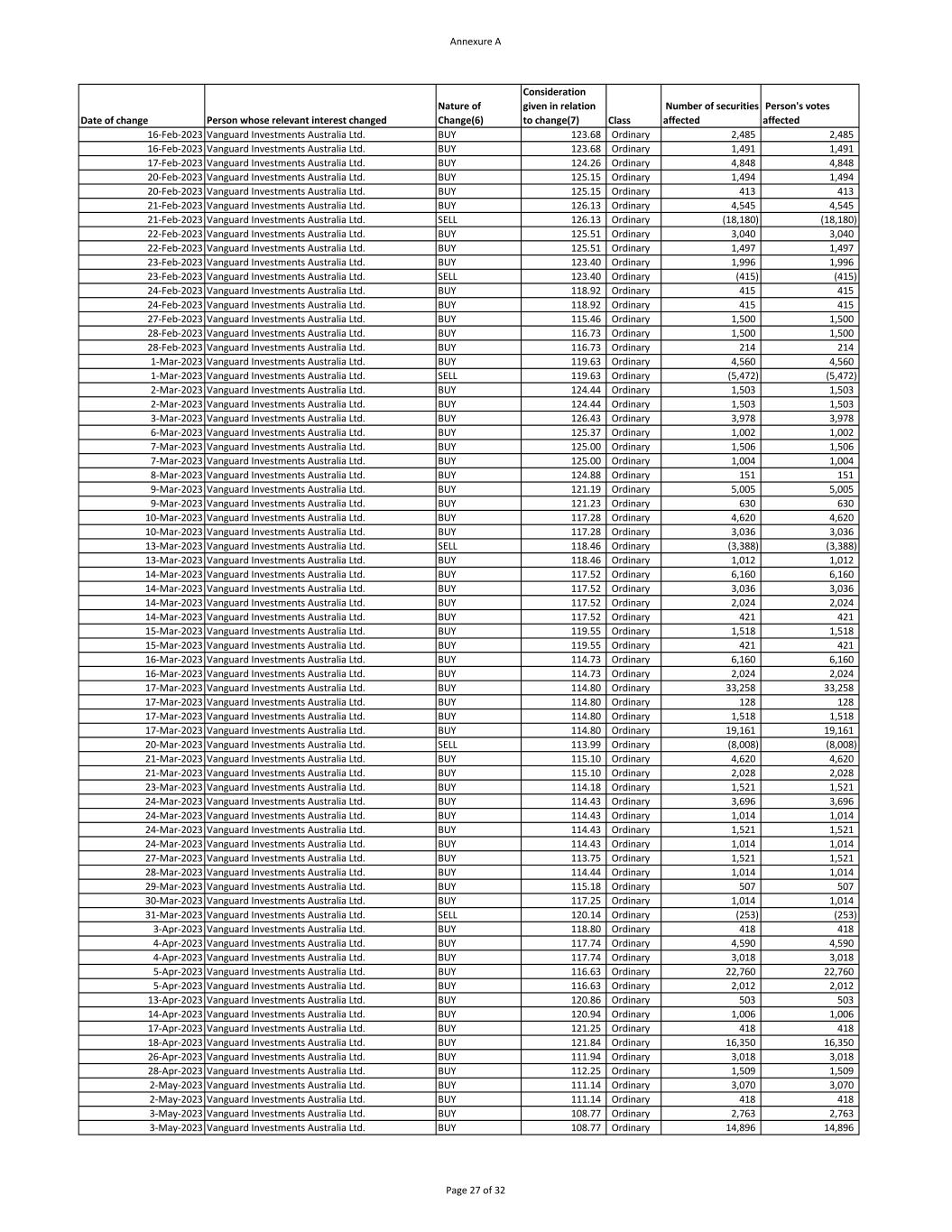 Annexure A Date of change Person whose relevant interest changed Nature of Change(6) Consideration given in relation to change(7) Class Number of securities affected Person's votes affected 16-Feb-2023 Vanguard Investments Australia Ltd. BUY 123.68 Ordinary 2,485 2,485 16-Feb-2023 Vanguard Investments Australia Ltd. BUY 123.68 Ordinary 1,491 1,491 17-Feb-2023 Vanguard Investments Australia Ltd. BUY 124.26 Ordinary 4,848 4,848 20-Feb-2023 Vanguard Investments Australia Ltd. BUY 125.15 Ordinary 1,494 1,494 20-Feb-2023 Vanguard Investments Australia Ltd. BUY 125.15 Ordinary 413 413 21-Feb-2023 Vanguard Investments Australia Ltd. BUY 126.13 Ordinary 4,545 4,545 21-Feb-2023 Vanguard Investments Australia Ltd. SELL 126.13 Ordinary (18,180) (18,180) 22-Feb-2023 Vanguard Investments Australia Ltd. BUY 125.51 Ordinary 3,040 3,040 22-Feb-2023 Vanguard Investments Australia Ltd. BUY 125.51 Ordinary 1,497 1,497 23-Feb-2023 Vanguard Investments Australia Ltd. BUY 123.40 Ordinary 1,996 1,996 23-Feb-2023 Vanguard Investments Australia Ltd. SELL 123.40 Ordinary (415) (415) 24-Feb-2023 Vanguard Investments Australia Ltd. BUY 118.92 Ordinary 415 415 24-Feb-2023 Vanguard Investments Australia Ltd. BUY 118.92 Ordinary 415 415 27-Feb-2023 Vanguard Investments Australia Ltd. BUY 115.46 Ordinary 1,500 1,500 28-Feb-2023 Vanguard Investments Australia Ltd. BUY 116.73 Ordinary 1,500 1,500 28-Feb-2023 Vanguard Investments Australia Ltd. BUY 116.73 Ordinary 214 214 1-Mar-2023 Vanguard Investments Australia Ltd. BUY 119.63 Ordinary 4,560 4,560 1-Mar-2023 Vanguard Investments Australia Ltd. SELL 119.63 Ordinary (5,472) (5,472) 2-Mar-2023 Vanguard Investments Australia Ltd. BUY 124.44 Ordinary 1,503 1,503 2-Mar-2023 Vanguard Investments Australia Ltd. BUY 124.44 Ordinary 1,503 1,503 3-Mar-2023 Vanguard Investments Australia Ltd. BUY 126.43 Ordinary 3,978 3,978 6-Mar-2023 Vanguard Investments Australia Ltd. BUY 125.37 Ordinary 1,002 1,002 7-Mar-2023 Vanguard Investments Australia Ltd. BUY 125.00 Ordinary 1,506 1,506 7-Mar-2023 Vanguard Investments Australia Ltd. BUY 125.00 Ordinary 1,004 1,004 8-Mar-2023 Vanguard Investments Australia Ltd. BUY 124.88 Ordinary 151 151 9-Mar-2023 Vanguard Investments Australia Ltd. BUY 121.19 Ordinary 5,005 5,005 9-Mar-2023 Vanguard Investments Australia Ltd. BUY 121.23 Ordinary 630 630 10-Mar-2023 Vanguard Investments Australia Ltd. BUY 117.28 Ordinary 4,620 4,620 10-Mar-2023 Vanguard Investments Australia Ltd. BUY 117.28 Ordinary 3,036 3,036 13-Mar-2023 Vanguard Investments Australia Ltd. SELL 118.46 Ordinary (3,388) (3,388) 13-Mar-2023 Vanguard Investments Australia Ltd. BUY 118.46 Ordinary 1,012 1,012 14-Mar-2023 Vanguard Investments Australia Ltd. BUY 117.52 Ordinary 6,160 6,160 14-Mar-2023 Vanguard Investments Australia Ltd. BUY 117.52 Ordinary 3,036 3,036 14-Mar-2023 Vanguard Investments Australia Ltd. BUY 117.52 Ordinary 2,024 2,024 14-Mar-2023 Vanguard Investments Australia Ltd. BUY 117.52 Ordinary 421 421 15-Mar-2023 Vanguard Investments Australia Ltd. BUY 119.55 Ordinary 1,518 1,518 15-Mar-2023 Vanguard Investments Australia Ltd. BUY 119.55 Ordinary 421 421 16-Mar-2023 Vanguard Investments Australia Ltd. BUY 114.73 Ordinary 6,160 6,160 16-Mar-2023 Vanguard Investments Australia Ltd. BUY 114.73 Ordinary 2,024 2,024 17-Mar-2023 Vanguard Investments Australia Ltd. BUY 114.80 Ordinary 33,258 33,258 17-Mar-2023 Vanguard Investments Australia Ltd. BUY 114.80 Ordinary 128 128 17-Mar-2023 Vanguard Investments Australia Ltd. BUY 114.80 Ordinary 1,518 1,518 17-Mar-2023 Vanguard Investments Australia Ltd. BUY 114.80 Ordinary 19,161 19,161 20-Mar-2023 Vanguard Investments Australia Ltd. SELL 113.99 Ordinary (8,008) (8,008) 21-Mar-2023 Vanguard Investments Australia Ltd. BUY 115.10 Ordinary 4,620 4,620 21-Mar-2023 Vanguard Investments Australia Ltd. BUY 115.10 Ordinary 2,028 2,028 23-Mar-2023 Vanguard Investments Australia Ltd. BUY 114.18 Ordinary 1,521 1,521 24-Mar-2023 Vanguard Investments Australia Ltd. BUY 114.43 Ordinary 3,696 3,696 24-Mar-2023 Vanguard Investments Australia Ltd. BUY 114.43 Ordinary 1,014 1,014 24-Mar-2023 Vanguard Investments Australia Ltd. BUY 114.43 Ordinary 1,521 1,521 24-Mar-2023 Vanguard Investments Australia Ltd. BUY 114.43 Ordinary 1,014 1,014 27-Mar-2023 Vanguard Investments Australia Ltd. BUY 113.75 Ordinary 1,521 1,521 28-Mar-2023 Vanguard Investments Australia Ltd. BUY 114.44 Ordinary 1,014 1,014 29-Mar-2023 Vanguard Investments Australia Ltd. BUY 115.18 Ordinary 507 507 30-Mar-2023 Vanguard Investments Australia Ltd. BUY 117.25 Ordinary 1,014 1,014 31-Mar-2023 Vanguard Investments Australia Ltd. SELL 120.14 Ordinary (253) (253) 3-Apr-2023 Vanguard Investments Australia Ltd. BUY 118.80 Ordinary 418 418 4-Apr-2023 Vanguard Investments Australia Ltd. BUY 117.74 Ordinary 4,590 4,590 4-Apr-2023 Vanguard Investments Australia Ltd. BUY 117.74 Ordinary 3,018 3,018 5-Apr-2023 Vanguard Investments Australia Ltd. BUY 116.63 Ordinary 22,760 22,760 5-Apr-2023 Vanguard Investments Australia Ltd. BUY 116.63 Ordinary 2,012 2,012 13-Apr-2023 Vanguard Investments Australia Ltd. BUY 120.86 Ordinary 503 503 14-Apr-2023 Vanguard Investments Australia Ltd. BUY 120.94 Ordinary 1,006 1,006 17-Apr-2023 Vanguard Investments Australia Ltd. BUY 121.25 Ordinary 418 418 18-Apr-2023 Vanguard Investments Australia Ltd. BUY 121.84 Ordinary 16,350 16,350 26-Apr-2023 Vanguard Investments Australia Ltd. BUY 111.94 Ordinary 3,018 3,018 28-Apr-2023 Vanguard Investments Australia Ltd. BUY 112.25 Ordinary 1,509 1,509 2-May-2023 Vanguard Investments Australia Ltd. BUY 111.14 Ordinary 3,070 3,070 2-May-2023 Vanguard Investments Australia Ltd. BUY 111.14 Ordinary 418 418 3-May-2023 Vanguard Investments Australia Ltd. BUY 108.77 Ordinary 2,763 2,763 3-May-2023 Vanguard Investments Australia Ltd. BUY 108.77 Ordinary 14,896 14,896 Page 27 of 32