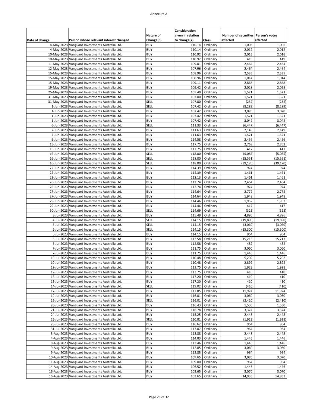 Annexure A Date of change Person whose relevant interest changed Nature of Change(6) Consideration given in relation to change(7) Class Number of securities affected Person's votes affected 4-May-2023 Vanguard Investments Australia Ltd. BUY 110.14 Ordinary 1,006 1,006 4-May-2023 Vanguard Investments Australia Ltd. BUY 110.14 Ordinary 2,012 2,012 10-May-2023 Vanguard Investments Australia Ltd. BUY 110.92 Ordinary 2,016 2,016 10-May-2023 Vanguard Investments Australia Ltd. BUY 110.92 Ordinary 419 419 11-May-2023 Vanguard Investments Australia Ltd. BUY 109.01 Ordinary 2,464 2,464 12-May-2023 Vanguard Investments Australia Ltd. BUY 107.96 Ordinary 2,464 2,464 15-May-2023 Vanguard Investments Australia Ltd. BUY 108.96 Ordinary 2,535 2,535 15-May-2023 Vanguard Investments Australia Ltd. BUY 108.96 Ordinary 1,014 1,014 15-May-2023 Vanguard Investments Australia Ltd. BUY 109.11 Ordinary 2,868 2,868 19-May-2023 Vanguard Investments Australia Ltd. BUY 109.42 Ordinary 2,028 2,028 25-May-2023 Vanguard Investments Australia Ltd. BUY 105.40 Ordinary 1,521 1,521 31-May-2023 Vanguard Investments Australia Ltd. BUY 107.00 Ordinary 1,521 1,521 31-May-2023 Vanguard Investments Australia Ltd. SELL 107.00 Ordinary (232) (232) 1-Jun-2023 Vanguard Investments Australia Ltd. SELL 107.42 Ordinary (8,289) (8,289) 1-Jun-2023 Vanguard Investments Australia Ltd. BUY 107.42 Ordinary 3,070 3,070 1-Jun-2023 Vanguard Investments Australia Ltd. BUY 107.42 Ordinary 1,521 1,521 1-Jun-2023 Vanguard Investments Australia Ltd. BUY 107.42 Ordinary 3,042 3,042 6-Jun-2023 Vanguard Investments Australia Ltd. SELL 111.33 Ordinary (6,447) (6,447) 7-Jun-2023 Vanguard Investments Australia Ltd. BUY 111.63 Ordinary 2,149 2,149 7-Jun-2023 Vanguard Investments Australia Ltd. BUY 111.63 Ordinary 1,521 1,521 9-Jun-2023 Vanguard Investments Australia Ltd. BUY 114.58 Ordinary 2,456 2,456 15-Jun-2023 Vanguard Investments Australia Ltd. BUY 117.75 Ordinary 2,763 2,763 15-Jun-2023 Vanguard Investments Australia Ltd. BUY 117.75 Ordinary 417 417 16-Jun-2023 Vanguard Investments Australia Ltd. SELL 118.00 Ordinary (5,085) (5,085) 16-Jun-2023 Vanguard Investments Australia Ltd. SELL 118.00 Ordinary (15,551) (15,551) 16-Jun-2023 Vanguard Investments Australia Ltd. SELL 118.00 Ordinary (39,170) (39,170) 22-Jun-2023 Vanguard Investments Australia Ltd. BUY 114.39 Ordinary 974 974 22-Jun-2023 Vanguard Investments Australia Ltd. BUY 114.39 Ordinary 1,461 1,461 23-Jun-2023 Vanguard Investments Australia Ltd. BUY 113.13 Ordinary 1,461 1,461 26-Jun-2023 Vanguard Investments Australia Ltd. BUY 112.74 Ordinary 2,464 2,464 26-Jun-2023 Vanguard Investments Australia Ltd. BUY 112.74 Ordinary 974 974 27-Jun-2023 Vanguard Investments Australia Ltd. BUY 114.64 Ordinary 2,772 2,772 27-Jun-2023 Vanguard Investments Australia Ltd. BUY 114.64 Ordinary 1,948 1,948 29-Jun-2023 Vanguard Investments Australia Ltd. BUY 114.46 Ordinary 1,952 1,952 29-Jun-2023 Vanguard Investments Australia Ltd. BUY 114.46 Ordinary 417 417 30-Jun-2023 Vanguard Investments Australia Ltd. SELL 114.69 Ordinary (323) (323) 3-Jul-2023 Vanguard Investments Australia Ltd. BUY 115.49 Ordinary 4,896 4,896 4-Jul-2023 Vanguard Investments Australia Ltd. SELL 114.15 Ordinary (19,890) (19,890) 5-Jul-2023 Vanguard Investments Australia Ltd. SELL 114.15 Ordinary (3,060) (3,060) 5-Jul-2023 Vanguard Investments Australia Ltd. SELL 114.15 Ordinary (15,300) (15,300) 5-Jul-2023 Vanguard Investments Australia Ltd. BUY 114.15 Ordinary 964 964 6-Jul-2023 Vanguard Investments Australia Ltd. BUY 112.58 Ordinary 15,213 15,213 6-Jul-2023 Vanguard Investments Australia Ltd. BUY 112.58 Ordinary 482 482 7-Jul-2023 Vanguard Investments Australia Ltd. BUY 111.75 Ordinary 3,060 3,060 7-Jul-2023 Vanguard Investments Australia Ltd. BUY 111.75 Ordinary 1,446 1,446 10-Jul-2023 Vanguard Investments Australia Ltd. BUY 110.48 Ordinary 5,202 5,202 10-Jul-2023 Vanguard Investments Australia Ltd. BUY 110.48 Ordinary 2,892 2,892 12-Jul-2023 Vanguard Investments Australia Ltd. BUY 113.75 Ordinary 1,928 1,928 12-Jul-2023 Vanguard Investments Australia Ltd. BUY 113.75 Ordinary 410 410 13-Jul-2023 Vanguard Investments Australia Ltd. BUY 117.20 Ordinary 410 410 13-Jul-2023 Vanguard Investments Australia Ltd. BUY 117.20 Ordinary 410 410 14-Jul-2023 Vanguard Investments Australia Ltd. SELL 119.02 Ordinary (410) (410) 17-Jul-2023 Vanguard Investments Australia Ltd. BUY 117.85 Ordinary 11,974 11,974 19-Jul-2023 Vanguard Investments Australia Ltd. BUY 116.01 Ordinary 3,060 3,060 19-Jul-2023 Vanguard Investments Australia Ltd. SELL 116.01 Ordinary (2,410) (2,410) 20-Jul-2023 Vanguard Investments Australia Ltd. BUY 116.43 Ordinary 1,530 1,530 21-Jul-2023 Vanguard Investments Australia Ltd. BUY 116.78 Ordinary 3,374 3,374 24-Jul-2023 Vanguard Investments Australia Ltd. BUY 115.25 Ordinary 2,448 2,448 26-Jul-2023 Vanguard Investments Australia Ltd. SELL 120.81 Ordinary (1,928) (1,928) 28-Jul-2023 Vanguard Investments Australia Ltd. BUY 116.62 Ordinary 964 964 31-Jul-2023 Vanguard Investments Australia Ltd. BUY 117.07 Ordinary 964 964 3-Aug-2023 Vanguard Investments Australia Ltd. BUY 113.88 Ordinary 2,448 2,448 4-Aug-2023 Vanguard Investments Australia Ltd. BUY 114.83 Ordinary 1,446 1,446 8-Aug-2023 Vanguard Investments Australia Ltd. BUY 113.46 Ordinary 1,446 1,446 9-Aug-2023 Vanguard Investments Australia Ltd. BUY 112.85 Ordinary 3,060 3,060 9-Aug-2023 Vanguard Investments Australia Ltd. BUY 112.85 Ordinary 964 964 10-Aug-2023 Vanguard Investments Australia Ltd. BUY 109.65 Ordinary 3,070 3,070 11-Aug-2023 Vanguard Investments Australia Ltd. BUY 109.00 Ordinary 964 964 14-Aug-2023 Vanguard Investments Australia Ltd. BUY 106.52 Ordinary 1,446 1,446 16-Aug-2023 Vanguard Investments Australia Ltd. BUY 103.65 Ordinary 3,070 3,070 16-Aug-2023 Vanguard Investments Australia Ltd. BUY 103.65 Ordinary 14,933 14,933 Page 28 of 32
