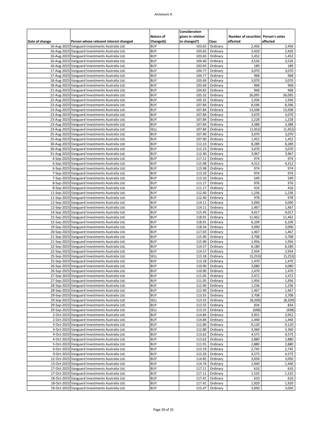 Annexure A Date of change Person whose relevant interest changed Nature of Change(6) Consideration given in relation to change(7) Class Number of securities affected Person's votes affected 16-Aug-2023 Vanguard Investments Australia Ltd. BUY 103.65 Ordinary 2,456 2,456 16-Aug-2023 Vanguard Investments Australia Ltd. BUY 103.65 Ordinary 2,420 2,420 16-Aug-2023 Vanguard Investments Australia Ltd. BUY 103.65 Ordinary 1,452 1,452 16-Aug-2023 Vanguard Investments Australia Ltd. BUY 104.40 Ordinary 3,526 3,526 16-Aug-2023 Vanguard Investments Australia Ltd. BUY 103.65 Ordinary 189 189 17-Aug-2023 Vanguard Investments Australia Ltd. BUY 104.77 Ordinary 3,070 3,070 17-Aug-2023 Vanguard Investments Australia Ltd. BUY 104.77 Ordinary 968 968 18-Aug-2023 Vanguard Investments Australia Ltd. BUY 105.69 Ordinary 3,070 3,070 18-Aug-2023 Vanguard Investments Australia Ltd. BUY 105.69 Ordinary 968 968 21-Aug-2023 Vanguard Investments Australia Ltd. BUY 104.82 Ordinary 968 968 22-Aug-2023 Vanguard Investments Australia Ltd. BUY 105.32 Ordinary 26,095 26,095 22-Aug-2023 Vanguard Investments Australia Ltd. BUY 105.32 Ordinary 1,936 1,936 23-Aug-2023 Vanguard Investments Australia Ltd. BUY 107.84 Ordinary 8,596 8,596 23-Aug-2023 Vanguard Investments Australia Ltd. BUY 107.84 Ordinary 13,508 13,508 23-Aug-2023 Vanguard Investments Australia Ltd. BUY 107.84 Ordinary 3,070 3,070 23-Aug-2023 Vanguard Investments Australia Ltd. BUY 107.84 Ordinary 1,228 1,228 23-Aug-2023 Vanguard Investments Australia Ltd. BUY 107.84 Ordinary 3,388 3,388 23-Aug-2023 Vanguard Investments Australia Ltd. SELL 107.84 Ordinary (1,452) (1,452) 25-Aug-2023 Vanguard Investments Australia Ltd. BUY 107.90 Ordinary 3,070 3,070 25-Aug-2023 Vanguard Investments Australia Ltd. BUY 107.90 Ordinary 1,452 1,452 30-Aug-2023 Vanguard Investments Australia Ltd. BUY 112.23 Ordinary 8,289 8,289 30-Aug-2023 Vanguard Investments Australia Ltd. BUY 112.23 Ordinary 3,070 3,070 31-Aug-2023 Vanguard Investments Australia Ltd. BUY 112.40 Ordinary 3,967 3,967 4-Sep-2023 Vanguard Investments Australia Ltd. BUY 117.12 Ordinary 974 974 6-Sep-2023 Vanguard Investments Australia Ltd. BUY 115.98 Ordinary 4,312 4,312 6-Sep-2023 Vanguard Investments Australia Ltd. BUY 115.98 Ordinary 974 974 7-Sep-2023 Vanguard Investments Australia Ltd. BUY 113.10 Ordinary 976 976 7-Sep-2023 Vanguard Investments Australia Ltd. BUY 113.10 Ordinary 549 549 8-Sep-2023 Vanguard Investments Australia Ltd. BUY 111.17 Ordinary 976 976 8-Sep-2023 Vanguard Investments Australia Ltd. BUY 111.17 Ordinary 416 416 11-Sep-2023 Vanguard Investments Australia Ltd. BUY 112.40 Ordinary 1,236 1,236 11-Sep-2023 Vanguard Investments Australia Ltd. BUY 112.40 Ordinary 978 978 12-Sep-2023 Vanguard Investments Australia Ltd. BUY 114.11 Ordinary 3,090 3,090 12-Sep-2023 Vanguard Investments Australia Ltd. BUY 114.11 Ordinary 1,467 1,467 14-Sep-2023 Vanguard Investments Australia Ltd. BUY 115.45 Ordinary 4,017 4,017 15-Sep-2023 Vanguard Investments Australia Ltd. BUY 118.91 Ordinary 11,462 11,462 15-Sep-2023 Vanguard Investments Australia Ltd. BUY 118.91 Ordinary 6,109 6,109 19-Sep-2023 Vanguard Investments Australia Ltd. BUY 118.54 Ordinary 3,090 3,090 20-Sep-2023 Vanguard Investments Australia Ltd. BUY 117.03 Ordinary 1,467 1,467 21-Sep-2023 Vanguard Investments Australia Ltd. BUY 115.90 Ordinary 3,708 3,708 21-Sep-2023 Vanguard Investments Australia Ltd. BUY 115.90 Ordinary 1,956 1,956 22-Sep-2023 Vanguard Investments Australia Ltd. BUY 114.57 Ordinary 6,180 6,180 22-Sep-2023 Vanguard Investments Australia Ltd. BUY 114.57 Ordinary 2,934 2,934 25-Sep-2023 Vanguard Investments Australia Ltd. SELL 113.18 Ordinary (5,253) (5,253) 25-Sep-2023 Vanguard Investments Australia Ltd. BUY 113.18 Ordinary 1,470 1,470 26-Sep-2023 Vanguard Investments Australia Ltd. BUY 110.90 Ordinary 3,080 3,080 26-Sep-2023 Vanguard Investments Australia Ltd. BUY 110.90 Ordinary 1,470 1,470 27-Sep-2023 Vanguard Investments Australia Ltd. BUY 111.05 Ordinary 2,472 2,472 27-Sep-2023 Vanguard Investments Australia Ltd. BUY 111.05 Ordinary 1,956 1,956 28-Sep-2023 Vanguard Investments Australia Ltd. BUY 112.40 Ordinary 1,236 1,236 28-Sep-2023 Vanguard Investments Australia Ltd. BUY 112.40 Ordinary 1,467 1,467 29-Sep-2023 Vanguard Investments Australia Ltd. BUY 113.55 Ordinary 3,708 3,708 29-Sep-2023 Vanguard Investments Australia Ltd. SELL 113.55 Ordinary (8,209) (8,209) 29-Sep-2023 Vanguard Investments Australia Ltd. BUY 113.55 Ordinary 834 834 29-Sep-2023 Vanguard Investments Australia Ltd. SELL 113.55 Ordinary (698) (698) 2-Oct-2023 Vanguard Investments Australia Ltd. BUY 114.84 Ordinary 3,952 3,952 2-Oct-2023 Vanguard Investments Australia Ltd. BUY 114.84 Ordinary 1,440 1,440 3-Oct-2023 Vanguard Investments Australia Ltd. BUY 112.80 Ordinary 9,120 9,120 3-Oct-2023 Vanguard Investments Australia Ltd. BUY 112.80 Ordinary 3,360 3,360 4-Oct-2023 Vanguard Investments Australia Ltd. BUY 113.62 Ordinary 4,575 4,575 4-Oct-2023 Vanguard Investments Australia Ltd. BUY 113.62 Ordinary 2,880 2,880 5-Oct-2023 Vanguard Investments Australia Ltd. BUY 111.91 Ordinary 2,880 2,880 6-Oct-2023 Vanguard Investments Australia Ltd. BUY 113.19 Ordinary 2,745 2,745 9-Oct-2023 Vanguard Investments Australia Ltd. BUY 113.20 Ordinary 4,575 4,575 12-Oct-2023 Vanguard Investments Australia Ltd. BUY 114.85 Ordinary 3,050 3,050 13-Oct-2023 Vanguard Investments Australia Ltd. BUY 114.74 Ordinary 1,440 1,440 17-Oct-2023 Vanguard Investments Australia Ltd. BUY 117.11 Ordinary 610 610 17-Oct-2023 Vanguard Investments Australia Ltd. BUY 117.11 Ordinary 1,525 1,525 18-Oct-2023 Vanguard Investments Australia Ltd. BUY 117.41 Ordinary 610 610 18-Oct-2023 Vanguard Investments Australia Ltd. BUY 117.41 Ordinary 1,920 1,920 19-Oct-2023 Vanguard Investments Australia Ltd. BUY 115.47 Ordinary 3,050 3,050 Page 29 of 32
