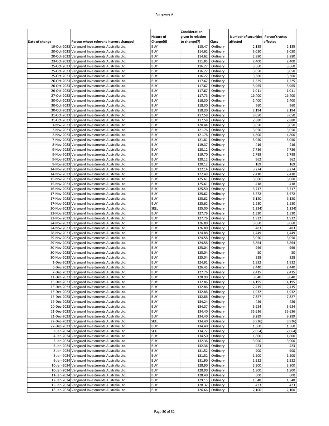 Annexure A Date of change Person whose relevant interest changed Nature of Change(6) Consideration given in relation to change(7) Class Number of securities affected Person's votes affected 19-Oct-2023 Vanguard Investments Australia Ltd. BUY 115.47 Ordinary 2,135 2,135 20-Oct-2023 Vanguard Investments Australia Ltd. BUY 114.62 Ordinary 3,050 3,050 20-Oct-2023 Vanguard Investments Australia Ltd. BUY 114.62 Ordinary 2,880 2,880 23-Oct-2023 Vanguard Investments Australia Ltd. BUY 111.85 Ordinary 2,400 2,400 25-Oct-2023 Vanguard Investments Australia Ltd. BUY 116.27 Ordinary 3,660 3,660 25-Oct-2023 Vanguard Investments Australia Ltd. BUY 116.27 Ordinary 3,050 3,050 25-Oct-2023 Vanguard Investments Australia Ltd. BUY 116.27 Ordinary 3,360 3,360 26-Oct-2023 Vanguard Investments Australia Ltd. BUY 117.67 Ordinary 1,525 1,525 26-Oct-2023 Vanguard Investments Australia Ltd. BUY 117.67 Ordinary 3,965 3,965 26-Oct-2023 Vanguard Investments Australia Ltd. BUY 117.67 Ordinary 1,011 1,011 27-Oct-2023 Vanguard Investments Australia Ltd. BUY 117.73 Ordinary 16,400 16,400 30-Oct-2023 Vanguard Investments Australia Ltd. BUY 118.30 Ordinary 2,400 2,400 30-Oct-2023 Vanguard Investments Australia Ltd. BUY 118.30 Ordinary 960 960 30-Oct-2023 Vanguard Investments Australia Ltd. BUY 118.30 Ordinary 2,194 2,194 31-Oct-2023 Vanguard Investments Australia Ltd. BUY 117.58 Ordinary 3,050 3,050 31-Oct-2023 Vanguard Investments Australia Ltd. BUY 117.58 Ordinary 2,880 2,880 1-Nov-2023 Vanguard Investments Australia Ltd. BUY 120.44 Ordinary 3,050 3,050 2-Nov-2023 Vanguard Investments Australia Ltd. BUY 121.76 Ordinary 3,050 3,050 2-Nov-2023 Vanguard Investments Australia Ltd. BUY 121.76 Ordinary 4,800 4,800 7-Nov-2023 Vanguard Investments Australia Ltd. BUY 121.81 Ordinary 3,050 3,050 8-Nov-2023 Vanguard Investments Australia Ltd. BUY 119.37 Ordinary 416 416 9-Nov-2023 Vanguard Investments Australia Ltd. BUY 120.12 Ordinary 7,736 7,736 9-Nov-2023 Vanguard Investments Australia Ltd. BUY 119.70 Ordinary 2,788 2,788 9-Nov-2023 Vanguard Investments Australia Ltd. BUY 120.12 Ordinary 962 962 9-Nov-2023 Vanguard Investments Australia Ltd. BUY 120.12 Ordinary 169 169 14-Nov-2023 Vanguard Investments Australia Ltd. BUY 122.14 Ordinary 3,274 3,274 14-Nov-2023 Vanguard Investments Australia Ltd. BUY 122.49 Ordinary 2,410 2,410 15-Nov-2023 Vanguard Investments Australia Ltd. BUY 125.61 Ordinary 3,060 3,060 15-Nov-2023 Vanguard Investments Australia Ltd. BUY 125.61 Ordinary 418 418 16-Nov-2023 Vanguard Investments Australia Ltd. BUY 125.50 Ordinary 3,717 3,717 17-Nov-2023 Vanguard Investments Australia Ltd. BUY 125.62 Ordinary 3,672 3,672 17-Nov-2023 Vanguard Investments Australia Ltd. BUY 125.62 Ordinary 6,120 6,120 17-Nov-2023 Vanguard Investments Australia Ltd. BUY 125.62 Ordinary 1,530 1,530 20-Nov-2023 Vanguard Investments Australia Ltd. SELL 125.00 Ordinary (1,224) (1,224) 22-Nov-2023 Vanguard Investments Australia Ltd. BUY 127.76 Ordinary 1,530 1,530 22-Nov-2023 Vanguard Investments Australia Ltd. BUY 127.76 Ordinary 1,932 1,932 24-Nov-2023 Vanguard Investments Australia Ltd. BUY 126.80 Ordinary 3,060 3,060 24-Nov-2023 Vanguard Investments Australia Ltd. BUY 126.80 Ordinary 483 483 28-Nov-2023 Vanguard Investments Australia Ltd. BUY 124.88 Ordinary 1,449 1,449 29-Nov-2023 Vanguard Investments Australia Ltd. BUY 124.58 Ordinary 3,050 3,050 29-Nov-2023 Vanguard Investments Australia Ltd. BUY 124.58 Ordinary 3,864 3,864 30-Nov-2023 Vanguard Investments Australia Ltd. BUY 125.04 Ordinary 966 966 30-Nov-2023 Vanguard Investments Australia Ltd. BUY 125.04 Ordinary 50 50 30-Nov-2023 Vanguard Investments Australia Ltd. BUY 125.04 Ordinary 828 828 1-Dec-2023 Vanguard Investments Australia Ltd. BUY 124.91 Ordinary 1,932 1,932 6-Dec-2023 Vanguard Investments Australia Ltd. BUY 126.45 Ordinary 2,440 2,440 7-Dec-2023 Vanguard Investments Australia Ltd. BUY 127.76 Ordinary 2,415 2,415 11-Dec-2023 Vanguard Investments Australia Ltd. BUY 128.90 Ordinary 3,040 3,040 15-Dec-2023 Vanguard Investments Australia Ltd. BUY 132.86 Ordinary 114,195 114,195 15-Dec-2023 Vanguard Investments Australia Ltd. BUY 132.86 Ordinary 2,415 2,415 15-Dec-2023 Vanguard Investments Australia Ltd. BUY 132.86 Ordinary 1,932 1,932 15-Dec-2023 Vanguard Investments Australia Ltd. BUY 132.86 Ordinary 7,327 7,327 19-Dec-2023 Vanguard Investments Australia Ltd. BUY 134.24 Ordinary 426 426 20-Dec-2023 Vanguard Investments Australia Ltd. BUY 134.37 Ordinary 3,624 3,624 21-Dec-2023 Vanguard Investments Australia Ltd. BUY 134.40 Ordinary 35,636 35,636 21-Dec-2023 Vanguard Investments Australia Ltd. BUY 134.40 Ordinary 9,289 9,289 22-Dec-2023 Vanguard Investments Australia Ltd. SELL 134.40 Ordinary (3,926) (3,926) 22-Dec-2023 Vanguard Investments Australia Ltd. BUY 134.40 Ordinary 1,560 1,560 3-Jan-2024 Vanguard Investments Australia Ltd. SELL 134.72 Ordinary (2,064) (2,064) 4-Jan-2024 Vanguard Investments Australia Ltd. BUY 134.50 Ordinary 1,800 1,800 5-Jan-2024 Vanguard Investments Australia Ltd. BUY 132.36 Ordinary 3,900 3,900 5-Jan-2024 Vanguard Investments Australia Ltd. BUY 132.36 Ordinary 423 423 8-Jan-2024 Vanguard Investments Australia Ltd. BUY 131.52 Ordinary 900 900 8-Jan-2024 Vanguard Investments Australia Ltd. BUY 131.52 Ordinary 1,500 1,500 9-Jan-2024 Vanguard Investments Australia Ltd. BUY 131.90 Ordinary 1,922 1,922 10-Jan-2024 Vanguard Investments Australia Ltd. BUY 128.90 Ordinary 3,300 3,300 10-Jan-2024 Vanguard Investments Australia Ltd. BUY 128.90 Ordinary 1,800 1,800 11-Jan-2024 Vanguard Investments Australia Ltd. BUY 128.40 Ordinary 600 600 12-Jan-2024 Vanguard Investments Australia Ltd. BUY 129.15 Ordinary 1,548 1,548 15-Jan-2024 Vanguard Investments Australia Ltd. BUY 128.32 Ordinary 423 423 16-Jan-2024 Vanguard Investments Australia Ltd. BUY 126.66 Ordinary 2,100 2,100 Page 30 of 32