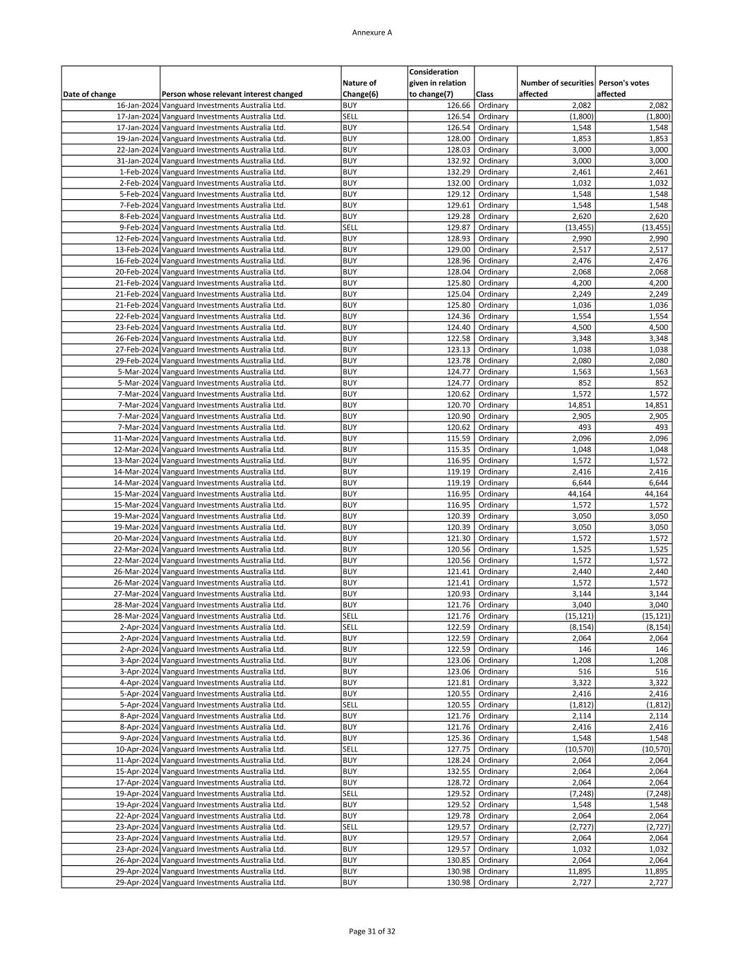Annexure A Date of change Person whose relevant interest changed Nature of Change(6) Consideration given in relation to change(7) Class Number of securities affected Person's votes affected 16-Jan-2024 Vanguard Investments Australia Ltd. BUY 126.66 Ordinary 2,082 2,082 17-Jan-2024 Vanguard Investments Australia Ltd. SELL 126.54 Ordinary (1,800) (1,800) 17-Jan-2024 Vanguard Investments Australia Ltd. BUY 126.54 Ordinary 1,548 1,548 19-Jan-2024 Vanguard Investments Australia Ltd. BUY 128.00 Ordinary 1,853 1,853 22-Jan-2024 Vanguard Investments Australia Ltd. BUY 128.03 Ordinary 3,000 3,000 31-Jan-2024 Vanguard Investments Australia Ltd. BUY 132.92 Ordinary 3,000 3,000 1-Feb-2024 Vanguard Investments Australia Ltd. BUY 132.29 Ordinary 2,461 2,461 2-Feb-2024 Vanguard Investments Australia Ltd. BUY 132.00 Ordinary 1,032 1,032 5-Feb-2024 Vanguard Investments Australia Ltd. BUY 129.12 Ordinary 1,548 1,548 7-Feb-2024 Vanguard Investments Australia Ltd. BUY 129.61 Ordinary 1,548 1,548 8-Feb-2024 Vanguard Investments Australia Ltd. BUY 129.28 Ordinary 2,620 2,620 9-Feb-2024 Vanguard Investments Australia Ltd. SELL 129.87 Ordinary (13,455) (13,455) 12-Feb-2024 Vanguard Investments Australia Ltd. BUY 128.93 Ordinary 2,990 2,990 13-Feb-2024 Vanguard Investments Australia Ltd. BUY 129.00 Ordinary 2,517 2,517 16-Feb-2024 Vanguard Investments Australia Ltd. BUY 128.96 Ordinary 2,476 2,476 20-Feb-2024 Vanguard Investments Australia Ltd. BUY 128.04 Ordinary 2,068 2,068 21-Feb-2024 Vanguard Investments Australia Ltd. BUY 125.80 Ordinary 4,200 4,200 21-Feb-2024 Vanguard Investments Australia Ltd. BUY 125.04 Ordinary 2,249 2,249 21-Feb-2024 Vanguard Investments Australia Ltd. BUY 125.80 Ordinary 1,036 1,036 22-Feb-2024 Vanguard Investments Australia Ltd. BUY 124.36 Ordinary 1,554 1,554 23-Feb-2024 Vanguard Investments Australia Ltd. BUY 124.40 Ordinary 4,500 4,500 26-Feb-2024 Vanguard Investments Australia Ltd. BUY 122.58 Ordinary 3,348 3,348 27-Feb-2024 Vanguard Investments Australia Ltd. BUY 123.13 Ordinary 1,038 1,038 29-Feb-2024 Vanguard Investments Australia Ltd. BUY 123.78 Ordinary 2,080 2,080 5-Mar-2024 Vanguard Investments Australia Ltd. BUY 124.77 Ordinary 1,563 1,563 5-Mar-2024 Vanguard Investments Australia Ltd. BUY 124.77 Ordinary 852 852 7-Mar-2024 Vanguard Investments Australia Ltd. BUY 120.62 Ordinary 1,572 1,572 7-Mar-2024 Vanguard Investments Australia Ltd. BUY 120.70 Ordinary 14,851 14,851 7-Mar-2024 Vanguard Investments Australia Ltd. BUY 120.90 Ordinary 2,905 2,905 7-Mar-2024 Vanguard Investments Australia Ltd. BUY 120.62 Ordinary 493 493 11-Mar-2024 Vanguard Investments Australia Ltd. BUY 115.59 Ordinary 2,096 2,096 12-Mar-2024 Vanguard Investments Australia Ltd. BUY 115.35 Ordinary 1,048 1,048 13-Mar-2024 Vanguard Investments Australia Ltd. BUY 116.95 Ordinary 1,572 1,572 14-Mar-2024 Vanguard Investments Australia Ltd. BUY 119.19 Ordinary 2,416 2,416 14-Mar-2024 Vanguard Investments Australia Ltd. BUY 119.19 Ordinary 6,644 6,644 15-Mar-2024 Vanguard Investments Australia Ltd. BUY 116.95 Ordinary 44,164 44,164 15-Mar-2024 Vanguard Investments Australia Ltd. BUY 116.95 Ordinary 1,572 1,572 19-Mar-2024 Vanguard Investments Australia Ltd. BUY 120.39 Ordinary 3,050 3,050 19-Mar-2024 Vanguard Investments Australia Ltd. BUY 120.39 Ordinary 3,050 3,050 20-Mar-2024 Vanguard Investments Australia Ltd. BUY 121.30 Ordinary 1,572 1,572 22-Mar-2024 Vanguard Investments Australia Ltd. BUY 120.56 Ordinary 1,525 1,525 22-Mar-2024 Vanguard Investments Australia Ltd. BUY 120.56 Ordinary 1,572 1,572 26-Mar-2024 Vanguard Investments Australia Ltd. BUY 121.41 Ordinary 2,440 2,440 26-Mar-2024 Vanguard Investments Australia Ltd. BUY 121.41 Ordinary 1,572 1,572 27-Mar-2024 Vanguard Investments Australia Ltd. BUY 120.93 Ordinary 3,144 3,144 28-Mar-2024 Vanguard Investments Australia Ltd. BUY 121.76 Ordinary 3,040 3,040 28-Mar-2024 Vanguard Investments Australia Ltd. SELL 121.76 Ordinary (15,121) (15,121) 2-Apr-2024 Vanguard Investments Australia Ltd. SELL 122.59 Ordinary (8,154) (8,154) 2-Apr-2024 Vanguard Investments Australia Ltd. BUY 122.59 Ordinary 2,064 2,064 2-Apr-2024 Vanguard Investments Australia Ltd. BUY 122.59 Ordinary 146 146 3-Apr-2024 Vanguard Investments Australia Ltd. BUY 123.06 Ordinary 1,208 1,208 3-Apr-2024 Vanguard Investments Australia Ltd. BUY 123.06 Ordinary 516 516 4-Apr-2024 Vanguard Investments Australia Ltd. BUY 121.81 Ordinary 3,322 3,322 5-Apr-2024 Vanguard Investments Australia Ltd. BUY 120.55 Ordinary 2,416 2,416 5-Apr-2024 Vanguard Investments Australia Ltd. SELL 120.55 Ordinary (1,812) (1,812) 8-Apr-2024 Vanguard Investments Australia Ltd. BUY 121.76 Ordinary 2,114 2,114 8-Apr-2024 Vanguard Investments Australia Ltd. BUY 121.76 Ordinary 2,416 2,416 9-Apr-2024 Vanguard Investments Australia Ltd. BUY 125.36 Ordinary 1,548 1,548 10-Apr-2024 Vanguard Investments Australia Ltd. SELL 127.75 Ordinary (10,570) (10,570) 11-Apr-2024 Vanguard Investments Australia Ltd. BUY 128.24 Ordinary 2,064 2,064 15-Apr-2024 Vanguard Investments Australia Ltd. BUY 132.55 Ordinary 2,064 2,064 17-Apr-2024 Vanguard Investments Australia Ltd. BUY 128.72 Ordinary 2,064 2,064 19-Apr-2024 Vanguard Investments Australia Ltd. SELL 129.52 Ordinary (7,248) (7,248) 19-Apr-2024 Vanguard Investments Australia Ltd. BUY 129.52 Ordinary 1,548 1,548 22-Apr-2024 Vanguard Investments Australia Ltd. BUY 129.78 Ordinary 2,064 2,064 23-Apr-2024 Vanguard Investments Australia Ltd. SELL 129.57 Ordinary (2,727) (2,727) 23-Apr-2024 Vanguard Investments Australia Ltd. BUY 129.57 Ordinary 2,064 2,064 23-Apr-2024 Vanguard Investments Australia Ltd. BUY 129.57 Ordinary 1,032 1,032 26-Apr-2024 Vanguard Investments Australia Ltd. BUY 130.85 Ordinary 2,064 2,064 29-Apr-2024 Vanguard Investments Australia Ltd. BUY 130.98 Ordinary 11,895 11,895 29-Apr-2024 Vanguard Investments Australia Ltd. BUY 130.98 Ordinary 2,727 2,727 Page 31 of 32