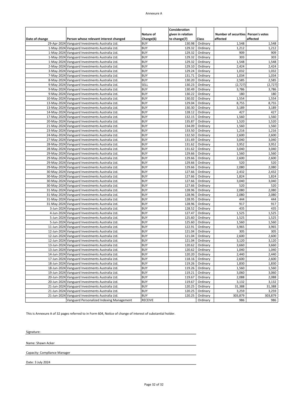 Annexure A Date of change Person whose relevant interest changed Nature of Change(6) Consideration given in relation to change(7) Class Number of securities affected Person's votes affected 29-Apr-2024 Vanguard Investments Australia Ltd. BUY 130.98 Ordinary 1,548 1,548 1-May-2024 Vanguard Investments Australia Ltd. BUY 129.32 Ordinary 1,212 1,212 1-May-2024 Vanguard Investments Australia Ltd. BUY 129.32 Ordinary 909 909 1-May-2024 Vanguard Investments Australia Ltd. BUY 129.32 Ordinary 303 303 1-May-2024 Vanguard Investments Australia Ltd. BUY 129.32 Ordinary 1,548 1,548 2-May-2024 Vanguard Investments Australia Ltd. BUY 129.10 Ordinary 2,424 2,424 3-May-2024 Vanguard Investments Australia Ltd. BUY 129.24 Ordinary 1,032 1,032 7-May-2024 Vanguard Investments Australia Ltd. BUY 131.71 Ordinary 1,034 1,034 8-May-2024 Vanguard Investments Australia Ltd. BUY 130.20 Ordinary 2,585 2,585 9-May-2024 Vanguard Investments Australia Ltd. SELL 130.23 Ordinary (2,727) (2,727) 9-May-2024 Vanguard Investments Australia Ltd. BUY 130.49 Ordinary 3,786 3,786 9-May-2024 Vanguard Investments Australia Ltd. BUY 130.22 Ordinary 180 180 10-May-2024 Vanguard Investments Australia Ltd. BUY 130.02 Ordinary 1,554 1,554 13-May-2024 Vanguard Investments Australia Ltd. BUY 129.04 Ordinary 8,755 8,755 13-May-2024 Vanguard Investments Australia Ltd. BUY 130.30 Ordinary 3,189 3,189 14-May-2024 Vanguard Investments Australia Ltd. BUY 128.12 Ordinary 427 427 17-May-2024 Vanguard Investments Australia Ltd. BUY 132.15 Ordinary 1,560 1,560 20-May-2024 Vanguard Investments Australia Ltd. BUY 135.87 Ordinary 1,520 1,520 21-May-2024 Vanguard Investments Australia Ltd. BUY 134.09 Ordinary 1,560 1,560 23-May-2024 Vanguard Investments Australia Ltd. BUY 133.50 Ordinary 1,216 1,216 24-May-2024 Vanguard Investments Australia Ltd. BUY 132.50 Ordinary 2,600 2,600 27-May-2024 Vanguard Investments Australia Ltd. BUY 131.69 Ordinary 3,040 3,040 28-May-2024 Vanguard Investments Australia Ltd. BUY 131.62 Ordinary 3,952 3,952 28-May-2024 Vanguard Investments Australia Ltd. BUY 131.62 Ordinary 3,040 3,040 29-May-2024 Vanguard Investments Australia Ltd. BUY 129.66 Ordinary 1,560 1,560 29-May-2024 Vanguard Investments Australia Ltd. BUY 129.66 Ordinary 2,600 2,600 29-May-2024 Vanguard Investments Australia Ltd. BUY 129.66 Ordinary 520 520 29-May-2024 Vanguard Investments Australia Ltd. BUY 129.66 Ordinary 2,080 2,080 30-May-2024 Vanguard Investments Australia Ltd. BUY 127.66 Ordinary 2,432 2,432 30-May-2024 Vanguard Investments Australia Ltd. BUY 127.66 Ordinary 1,824 1,824 30-May-2024 Vanguard Investments Australia Ltd. BUY 127.66 Ordinary 3,040 3,040 30-May-2024 Vanguard Investments Australia Ltd. BUY 127.66 Ordinary 520 520 31-May-2024 Vanguard Investments Australia Ltd. BUY 128.96 Ordinary 2,080 2,080 31-May-2024 Vanguard Investments Australia Ltd. BUY 128.96 Ordinary 2,080 2,080 31-May-2024 Vanguard Investments Australia Ltd. BUY 128.95 Ordinary 444 444 31-May-2024 Vanguard Investments Australia Ltd. BUY 128.96 Ordinary 917 917 3-Jun-2024 Vanguard Investments Australia Ltd. BUY 128.52 Ordinary 435 435 4-Jun-2024 Vanguard Investments Australia Ltd. BUY 127.47 Ordinary 1,525 1,525 5-Jun-2024 Vanguard Investments Australia Ltd. BUY 125.60 Ordinary 1,525 1,525 5-Jun-2024 Vanguard Investments Australia Ltd. BUY 125.60 Ordinary 1,560 1,560 11-Jun-2024 Vanguard Investments Australia Ltd. BUY 122.91 Ordinary 3,965 3,965 12-Jun-2024 Vanguard Investments Australia Ltd. BUY 121.04 Ordinary 305 305 12-Jun-2024 Vanguard Investments Australia Ltd. BUY 121.04 Ordinary 2,600 2,600 12-Jun-2024 Vanguard Investments Australia Ltd. BUY 121.04 Ordinary 3,120 3,120 13-Jun-2024 Vanguard Investments Australia Ltd. BUY 120.62 Ordinary 3,660 3,660 13-Jun-2024 Vanguard Investments Australia Ltd. BUY 120.62 Ordinary 1,040 1,040 14-Jun-2024 Vanguard Investments Australia Ltd. BUY 120.20 Ordinary 2,440 2,440 17-Jun-2024 Vanguard Investments Australia Ltd. BUY 118.16 Ordinary 2,600 2,600 18-Jun-2024 Vanguard Investments Australia Ltd. BUY 119.26 Ordinary 1,830 1,830 18-Jun-2024 Vanguard Investments Australia Ltd. BUY 119.26 Ordinary 1,560 1,560 19-Jun-2024 Vanguard Investments Australia Ltd. BUY 119.21 Ordinary 3,060 3,060 20-Jun-2024 Vanguard Investments Australia Ltd. BUY 119.67 Ordinary 2,088 2,088 20-Jun-2024 Vanguard Investments Australia Ltd. BUY 119.67 Ordinary 3,132 3,132 21-Jun-2024 Vanguard Investments Australia Ltd. BUY 120.25 Ordinary 31,388 31,388 21-Jun-2024 Vanguard Investments Australia Ltd. BUY 120.25 Ordinary 3,259 3,259 21-Jun-2024 Vanguard Investments Australia Ltd. BUY 120.25 Ordinary 303,879 303,879 Vanguard Personalized Indexing Management RECEIVE Ordinary 986 986 This is Annexure A of 32 pages referred to in Form 604, Notice of change of interest of substantial holder. Signature: Name: Shawn Acker Capacity: Compliance Manager Date: 3 July 2024 Page 32 of 32