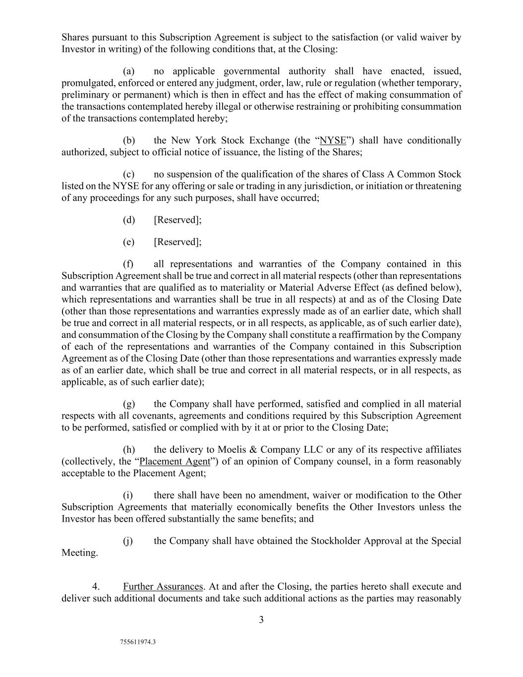 3 755611974.3 Shares pursuant to this Subscription Agreement is subject to the satisfaction (or valid waiver by Investor in writing) of the following conditions that, at the Closing: (a) no applicable governmental authority shall have enacted, issued, promulgated, enforced or entered any judgment, order, law, rule or regulation (whether temporary, preliminary or permanent) which is then in effect and has the effect of making consummation of the transactions contemplated hereby illegal or otherwise restraining or prohibiting consummation of the transactions contemplated hereby; (b) the New York Stock Exchange (the “NYSE”) shall have conditionally authorized, subject to official notice of issuance, the listing of the Shares; (c) no suspension of the qualification of the shares of Class A Common Stock listed on the NYSE for any offering or sale or trading in any jurisdiction, or initiation or threatening of any proceedings for any such purposes, shall have occurred; (d) [Reserved]; (e) [Reserved]; (f) all representations and warranties of the Company contained in this Subscription Agreement shall be true and correct in all material respects (other than representations and warranties that are qualified as to materiality or Material Adverse Effect (as defined below), which representations and warranties shall be true in all respects) at and as of the Closing Date (other than those representations and warranties expressly made as of an earlier date, which shall be true and correct in all material respects, or in all respects, as applicable, as of such earlier date), and consummation of the Closing by the Company shall constitute a reaffirmation by the Company of each of the representations and warranties of the Company contained in this Subscription Agreement as of the Closing Date (other than those representations and warranties expressly made as of an earlier date, which shall be true and correct in all material respects, or in all respects, as applicable, as of such earlier date); (g) the Company shall have performed, satisfied and complied in all material respects with all covenants, agreements and conditions required by this Subscription Agreement to be performed, satisfied or complied with by it at or prior to the Closing Date; (h) the delivery to Moelis & Company LLC or any of its respective affiliates (collectively, the “Placement Agent”) of an opinion of Company counsel, in a form reasonably acceptable to the Placement Agent; (i) there shall have been no amendment, waiver or modification to the Other Subscription Agreements that materially economically benefits the Other Investors unless the Investor has been offered substantially the same benefits; and (j) the Company shall have obtained the Stockholder Approval at the Special Meeting. 4. Further Assurances. At and after the Closing, the parties hereto shall execute and deliver such additional documents and take such additional actions as the parties may reasonably