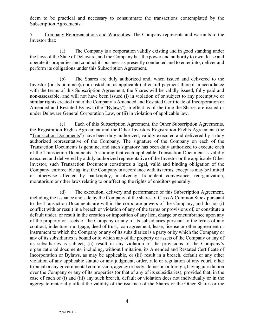 4 755611974.3 deem to be practical and necessary to consummate the transactions contemplated by the Subscription Agreements. 5. Company Representations and Warranties. The Company represents and warrants to the Investor that: (a) The Company is a corporation validly existing and in good standing under the laws of the State of Delaware, and the Company has the power and authority to own, lease and operate its properties and conduct its business as presently conducted and to enter into, deliver and perform its obligations under this Subscription Agreement. (b) The Shares are duly authorized and, when issued and delivered to the Investor (or its nominee(s) or custodian, as applicable) after full payment thereof in accordance with the terms of this Subscription Agreement, the Shares will be validly issued, fully paid and non-assessable, and will not have been issued (i) in violation of or subject to any preemptive or similar rights created under the Company’s Amended and Restated Certificate of Incorporation or Amended and Restated Bylaws (the “Bylaws”) in effect as of the time the Shares are issued or under Delaware General Corporation Law, or (ii) in violation of applicable law. (c) Each of this Subscription Agreement, the Other Subscription Agreements, the Registration Rights Agreement and the Other Investors Registration Rights Agreement (the “Transaction Documents”) have been duly authorized, validly executed and delivered by a duly authorized representative of the Company. The signature of the Company on each of the Transaction Documents is genuine, and such signatory has been duly authorized to execute each of the Transaction Documents. Assuming that each applicable Transaction Document is validly executed and delivered by a duly authorized representative of the Investor or the applicable Other Investor, such Transaction Document constitutes a legal, valid and binding obligation of the Company, enforceable against the Company in accordance with its terms, except as may be limited or otherwise affected by bankruptcy, insolvency, fraudulent conveyance, reorganization, moratorium or other laws relating to or affecting the rights of creditors generally. (d) The execution, delivery and performance of this Subscription Agreement, including the issuance and sale by the Company of the shares of Class A Common Stock pursuant to the Transaction Documents are within the corporate powers of the Company, and do not (i) conflict with or result in a breach or violation of any of the terms or provisions of, or constitute a default under, or result in the creation or imposition of any lien, charge or encumbrance upon any of the property or assets of the Company or any of its subsidiaries pursuant to the terms of any contract, indenture, mortgage, deed of trust, loan agreement, lease, license or other agreement or instrument to which the Company or any of its subsidiaries is a party or by which the Company or any of its subsidiaries is bound or to which any of the property or assets of the Company or any of its subsidiaries is subject, (ii) result in any violation of the provisions of the Company’s organizational documents, including, without limitation, its Amended and Restated Certificate of Incorporation or Bylaws, as may be applicable, or (iii) result in a breach, default or any other violation of any applicable statute or any judgment, order, rule or regulation of any court, other tribunal or any governmental commission, agency or body, domestic or foreign, having jurisdiction over the Company or any of its properties (or that of any of its subsidiaries), provided that, in the case of each of (i) and (iii) any such breach, default or violation does not individually or in the aggregate materially affect the validity of the issuance of the Shares or the Other Shares or the