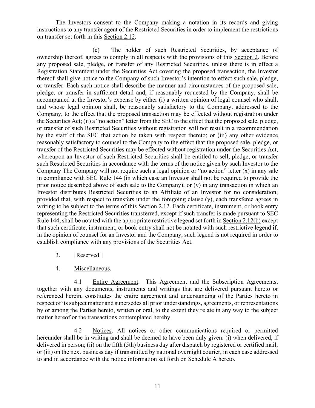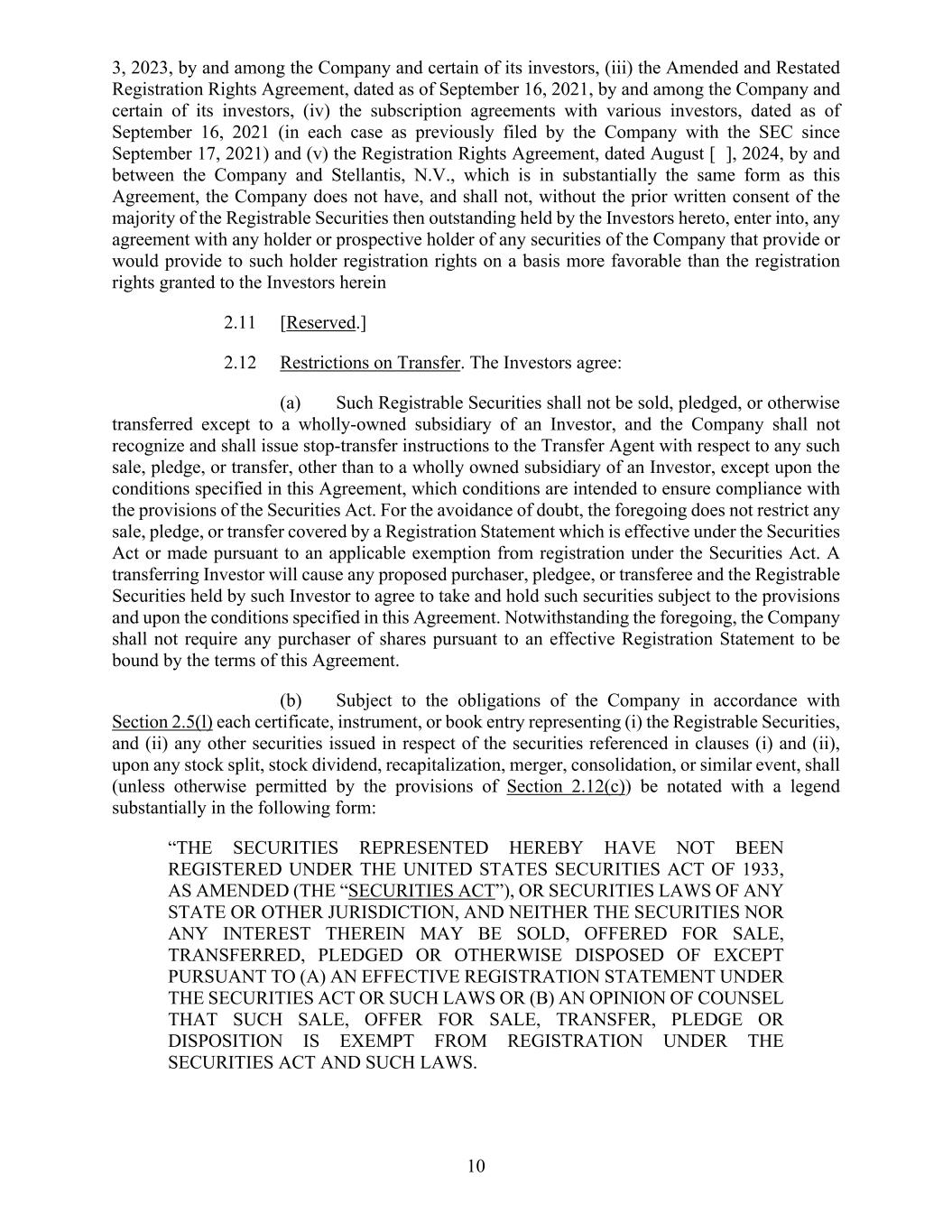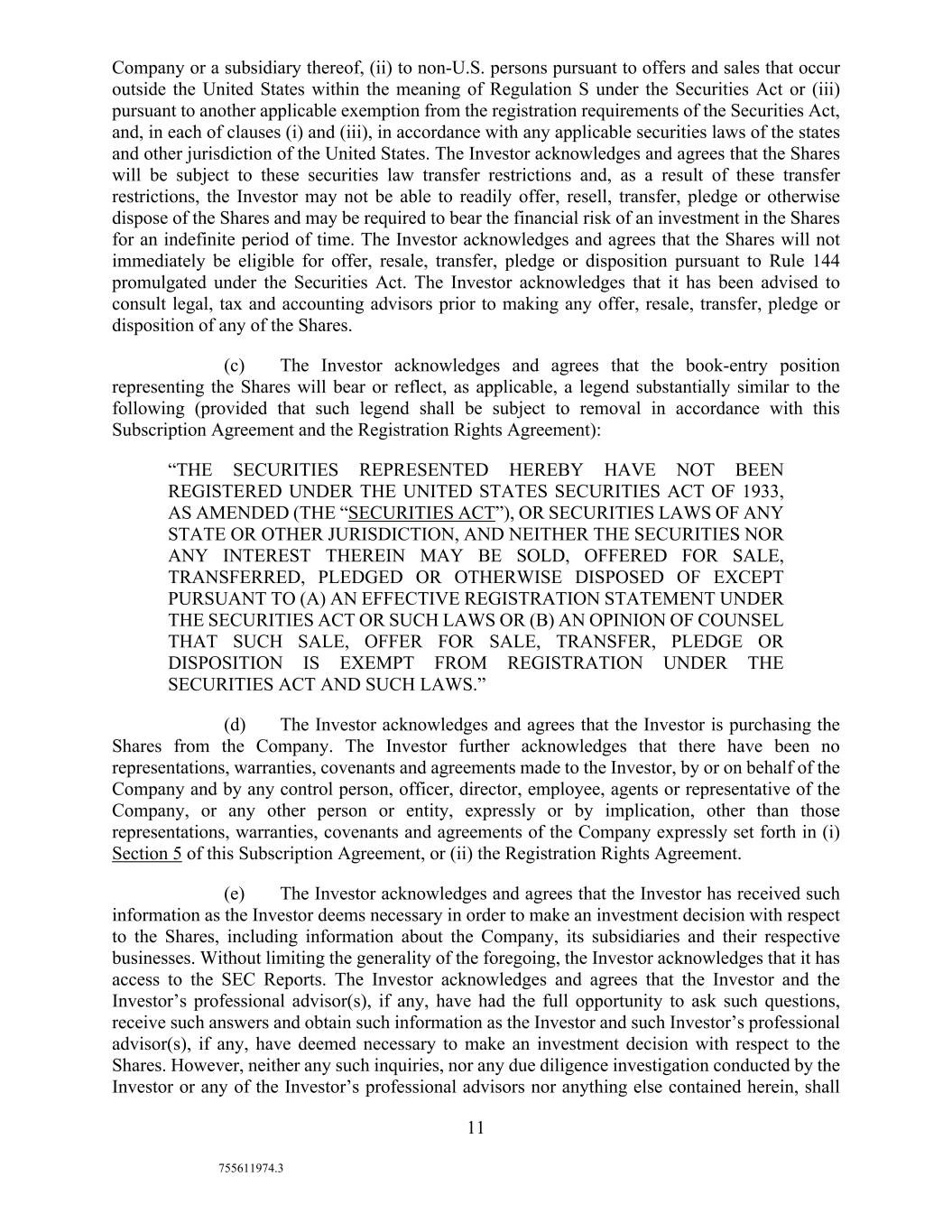 11 755611974.3 Company or a subsidiary thereof, (ii) to non-U.S. persons pursuant to offers and sales that occur outside the United States within the meaning of Regulation S under the Securities Act or (iii) pursuant to another applicable exemption from the registration requirements of the Securities Act, and, in each of clauses (i) and (iii), in accordance with any applicable securities laws of the states and other jurisdiction of the United States. The Investor acknowledges and agrees that the Shares will be subject to these securities law transfer restrictions and, as a result of these transfer restrictions, the Investor may not be able to readily offer, resell, transfer, pledge or otherwise dispose of the Shares and may be required to bear the financial risk of an investment in the Shares for an indefinite period of time. The Investor acknowledges and agrees that the Shares will not immediately be eligible for offer, resale, transfer, pledge or disposition pursuant to Rule 144 promulgated under the Securities Act. The Investor acknowledges that it has been advised to consult legal, tax and accounting advisors prior to making any offer, resale, transfer, pledge or disposition of any of the Shares. (c) The Investor acknowledges and agrees that the book-entry position representing the Shares will bear or reflect, as applicable, a legend substantially similar to the following (provided that such legend shall be subject to removal in accordance with this Subscription Agreement and the Registration Rights Agreement): “THE SECURITIES REPRESENTED HEREBY HAVE NOT BEEN REGISTERED UNDER THE UNITED STATES SECURITIES ACT OF 1933, AS AMENDED (THE “SECURITIES ACT”), OR SECURITIES LAWS OF ANY STATE OR OTHER JURISDICTION, AND NEITHER THE SECURITIES NOR ANY INTEREST THEREIN MAY BE SOLD, OFFERED FOR SALE, TRANSFERRED, PLEDGED OR OTHERWISE DISPOSED OF EXCEPT PURSUANT TO (A) AN EFFECTIVE REGISTRATION STATEMENT UNDER THE SECURITIES ACT OR SUCH LAWS OR (B) AN OPINION OF COUNSEL THAT SUCH SALE, OFFER FOR SALE, TRANSFER, PLEDGE OR DISPOSITION IS EXEMPT FROM REGISTRATION UNDER THE SECURITIES ACT AND SUCH LAWS.” (d) The Investor acknowledges and agrees that the Investor is purchasing the Shares from the Company. The Investor further acknowledges that there have been no representations, warranties, covenants and agreements made to the Investor, by or on behalf of the Company and by any control person, officer, director, employee, agents or representative of the Company, or any other person or entity, expressly or by implication, other than those representations, warranties, covenants and agreements of the Company expressly set forth in (i) Section 5 of this Subscription Agreement, or (ii) the Registration Rights Agreement. (e) The Investor acknowledges and agrees that the Investor has received such information as the Investor deems necessary in order to make an investment decision with respect to the Shares, including information about the Company, its subsidiaries and their respective businesses. Without limiting the generality of the foregoing, the Investor acknowledges that it has access to the SEC Reports. The Investor acknowledges and agrees that the Investor and the Investor’s professional advisor(s), if any, have had the full opportunity to ask such questions, receive such answers and obtain such information as the Investor and such Investor’s professional advisor(s), if any, have deemed necessary to make an investment decision with respect to the Shares. However, neither any such inquiries, nor any due diligence investigation conducted by the Investor or any of the Investor’s professional advisors nor anything else contained herein, shall