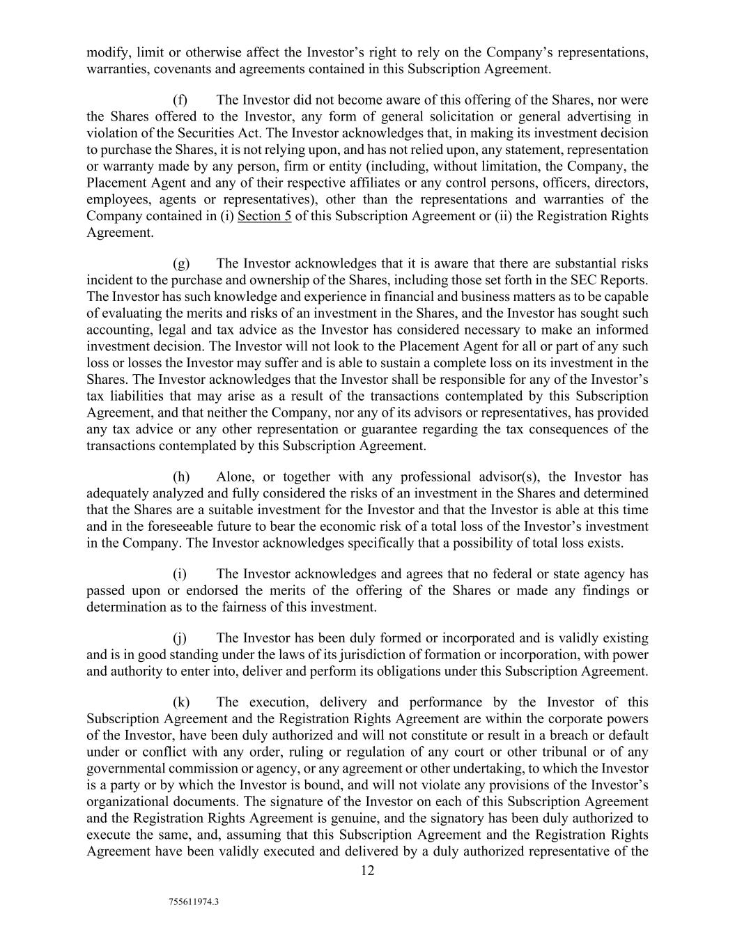 12 755611974.3 modify, limit or otherwise affect the Investor’s right to rely on the Company’s representations, warranties, covenants and agreements contained in this Subscription Agreement. (f) The Investor did not become aware of this offering of the Shares, nor were the Shares offered to the Investor, any form of general solicitation or general advertising in violation of the Securities Act. The Investor acknowledges that, in making its investment decision to purchase the Shares, it is not relying upon, and has not relied upon, any statement, representation or warranty made by any person, firm or entity (including, without limitation, the Company, the Placement Agent and any of their respective affiliates or any control persons, officers, directors, employees, agents or representatives), other than the representations and warranties of the Company contained in (i) Section 5 of this Subscription Agreement or (ii) the Registration Rights Agreement. (g) The Investor acknowledges that it is aware that there are substantial risks incident to the purchase and ownership of the Shares, including those set forth in the SEC Reports. The Investor has such knowledge and experience in financial and business matters as to be capable of evaluating the merits and risks of an investment in the Shares, and the Investor has sought such accounting, legal and tax advice as the Investor has considered necessary to make an informed investment decision. The Investor will not look to the Placement Agent for all or part of any such loss or losses the Investor may suffer and is able to sustain a complete loss on its investment in the Shares. The Investor acknowledges that the Investor shall be responsible for any of the Investor’s tax liabilities that may arise as a result of the transactions contemplated by this Subscription Agreement, and that neither the Company, nor any of its advisors or representatives, has provided any tax advice or any other representation or guarantee regarding the tax consequences of the transactions contemplated by this Subscription Agreement. (h) Alone, or together with any professional advisor(s), the Investor has adequately analyzed and fully considered the risks of an investment in the Shares and determined that the Shares are a suitable investment for the Investor and that the Investor is able at this time and in the foreseeable future to bear the economic risk of a total loss of the Investor’s investment in the Company. The Investor acknowledges specifically that a possibility of total loss exists. (i) The Investor acknowledges and agrees that no federal or state agency has passed upon or endorsed the merits of the offering of the Shares or made any findings or determination as to the fairness of this investment. (j) The Investor has been duly formed or incorporated and is validly existing and is in good standing under the laws of its jurisdiction of formation or incorporation, with power and authority to enter into, deliver and perform its obligations under this Subscription Agreement. (k) The execution, delivery and performance by the Investor of this Subscription Agreement and the Registration Rights Agreement are within the corporate powers of the Investor, have been duly authorized and will not constitute or result in a breach or default under or conflict with any order, ruling or regulation of any court or other tribunal or of any governmental commission or agency, or any agreement or other undertaking, to which the Investor is a party or by which the Investor is bound, and will not violate any provisions of the Investor’s organizational documents. The signature of the Investor on each of this Subscription Agreement and the Registration Rights Agreement is genuine, and the signatory has been duly authorized to execute the same, and, assuming that this Subscription Agreement and the Registration Rights Agreement have been validly executed and delivered by a duly authorized representative of the