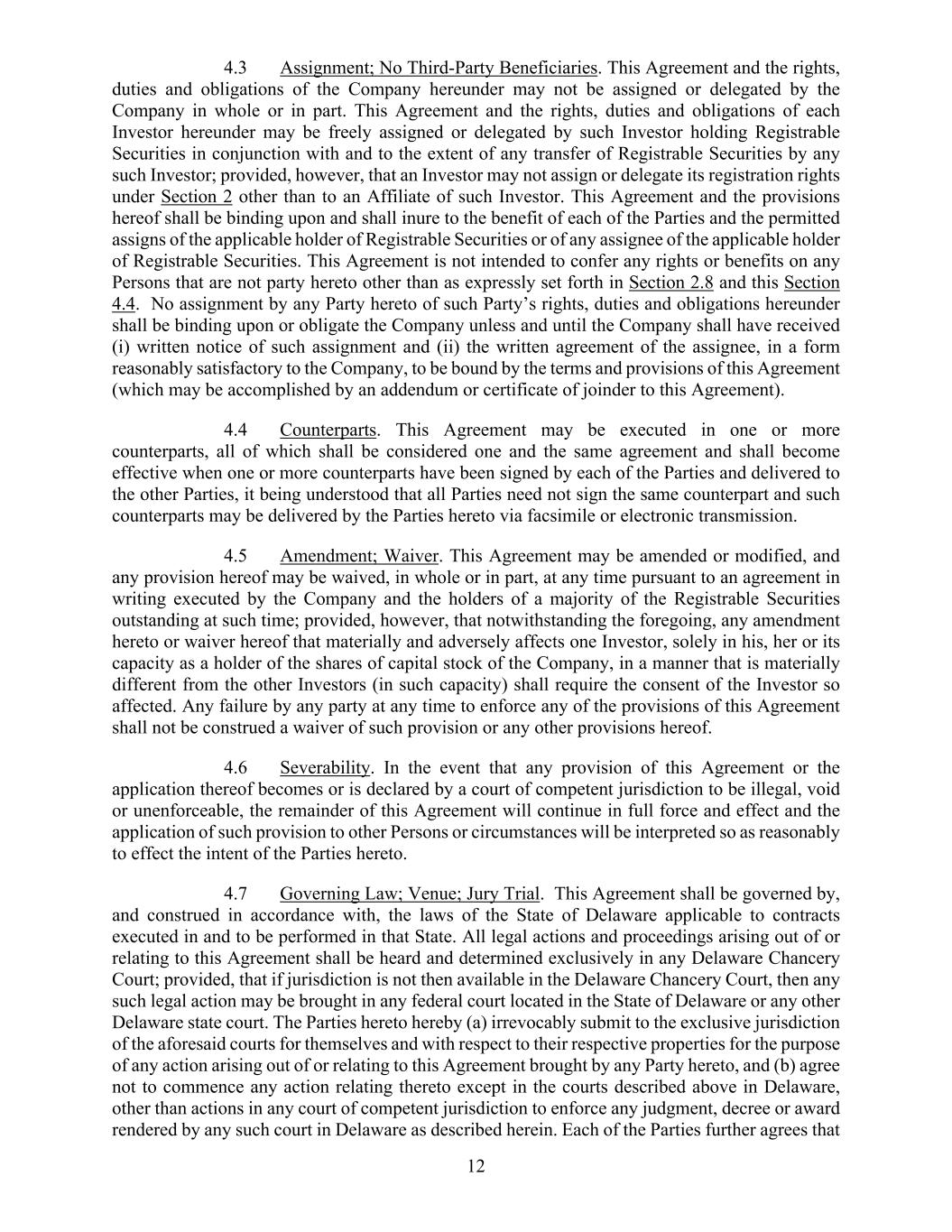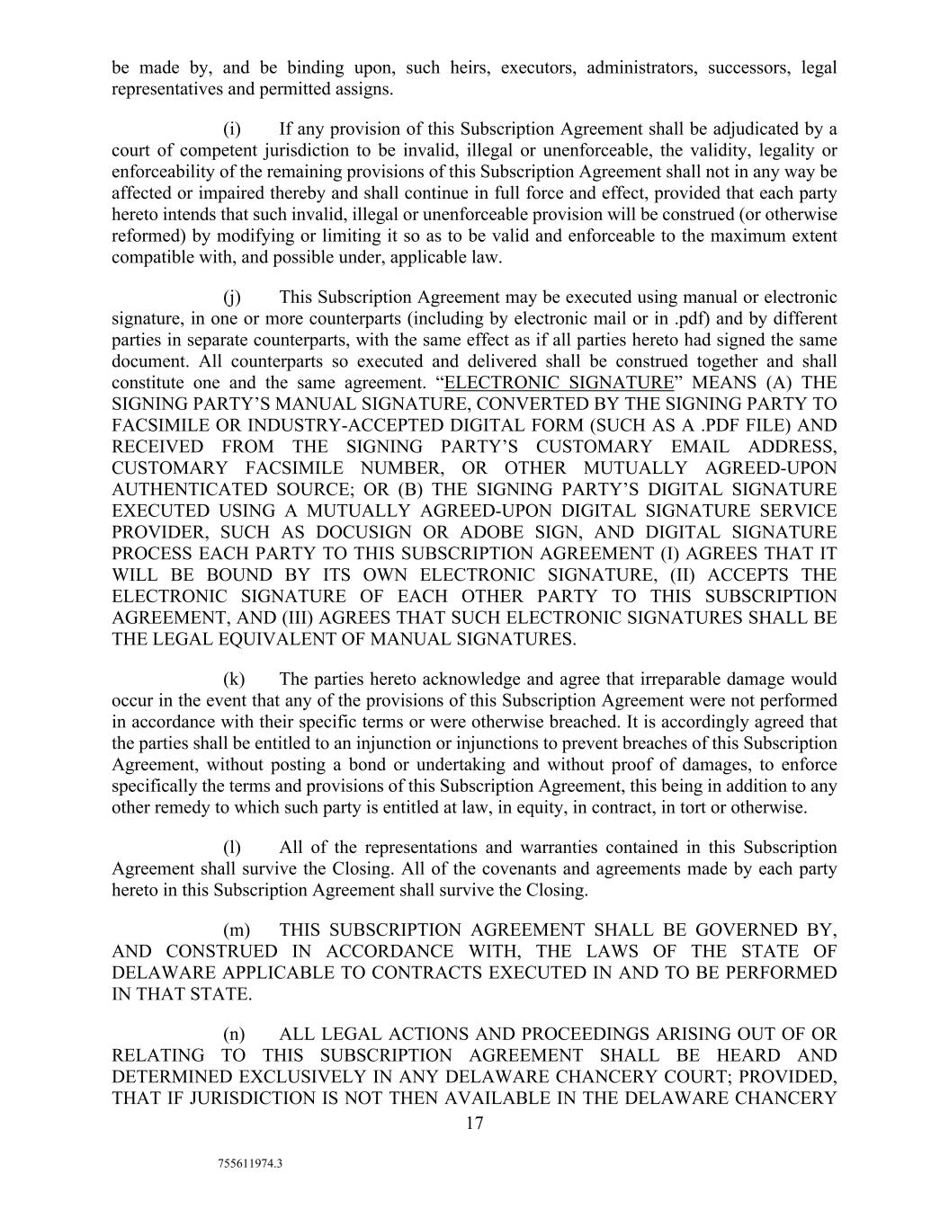 17 755611974.3 be made by, and be binding upon, such heirs, executors, administrators, successors, legal representatives and permitted assigns. (i) If any provision of this Subscription Agreement shall be adjudicated by a court of competent jurisdiction to be invalid, illegal or unenforceable, the validity, legality or enforceability of the remaining provisions of this Subscription Agreement shall not in any way be affected or impaired thereby and shall continue in full force and effect, provided that each party hereto intends that such invalid, illegal or unenforceable provision will be construed (or otherwise reformed) by modifying or limiting it so as to be valid and enforceable to the maximum extent compatible with, and possible under, applicable law. (j) This Subscription Agreement may be executed using manual or electronic signature, in one or more counterparts (including by electronic mail or in .pdf) and by different parties in separate counterparts, with the same effect as if all parties hereto had signed the same document. All counterparts so executed and delivered shall be construed together and shall constitute one and the same agreement. “ELECTRONIC SIGNATURE” MEANS (A) THE SIGNING PARTY’S MANUAL SIGNATURE, CONVERTED BY THE SIGNING PARTY TO FACSIMILE OR INDUSTRY-ACCEPTED DIGITAL FORM (SUCH AS A .PDF FILE) AND RECEIVED FROM THE SIGNING PARTY’S CUSTOMARY EMAIL ADDRESS, CUSTOMARY FACSIMILE NUMBER, OR OTHER MUTUALLY AGREED-UPON AUTHENTICATED SOURCE; OR (B) THE SIGNING PARTY’S DIGITAL SIGNATURE EXECUTED USING A MUTUALLY AGREED-UPON DIGITAL SIGNATURE SERVICE PROVIDER, SUCH AS DOCUSIGN OR ADOBE SIGN, AND DIGITAL SIGNATURE PROCESS EACH PARTY TO THIS SUBSCRIPTION AGREEMENT (I) AGREES THAT IT WILL BE BOUND BY ITS OWN ELECTRONIC SIGNATURE, (II) ACCEPTS THE ELECTRONIC SIGNATURE OF EACH OTHER PARTY TO THIS SUBSCRIPTION AGREEMENT, AND (III) AGREES THAT SUCH ELECTRONIC SIGNATURES SHALL BE THE LEGAL EQUIVALENT OF MANUAL SIGNATURES. (k) The parties hereto acknowledge and agree that irreparable damage would occur in the event that any of the provisions of this Subscription Agreement were not performed in accordance with their specific terms or were otherwise breached. It is accordingly agreed that the parties shall be entitled to an injunction or injunctions to prevent breaches of this Subscription Agreement, without posting a bond or undertaking and without proof of damages, to enforce specifically the terms and provisions of this Subscription Agreement, this being in addition to any other remedy to which such party is entitled at law, in equity, in contract, in tort or otherwise. (l) All of the representations and warranties contained in this Subscription Agreement shall survive the Closing. All of the covenants and agreements made by each party hereto in this Subscription Agreement shall survive the Closing. (m) THIS SUBSCRIPTION AGREEMENT SHALL BE GOVERNED BY, AND CONSTRUED IN ACCORDANCE WITH, THE LAWS OF THE STATE OF DELAWARE APPLICABLE TO CONTRACTS EXECUTED IN AND TO BE PERFORMED IN THAT STATE. (n) ALL LEGAL ACTIONS AND PROCEEDINGS ARISING OUT OF OR RELATING TO THIS SUBSCRIPTION AGREEMENT SHALL BE HEARD AND DETERMINED EXCLUSIVELY IN ANY DELAWARE CHANCERY COURT; PROVIDED, THAT IF JURISDICTION IS NOT THEN AVAILABLE IN THE DELAWARE CHANCERY