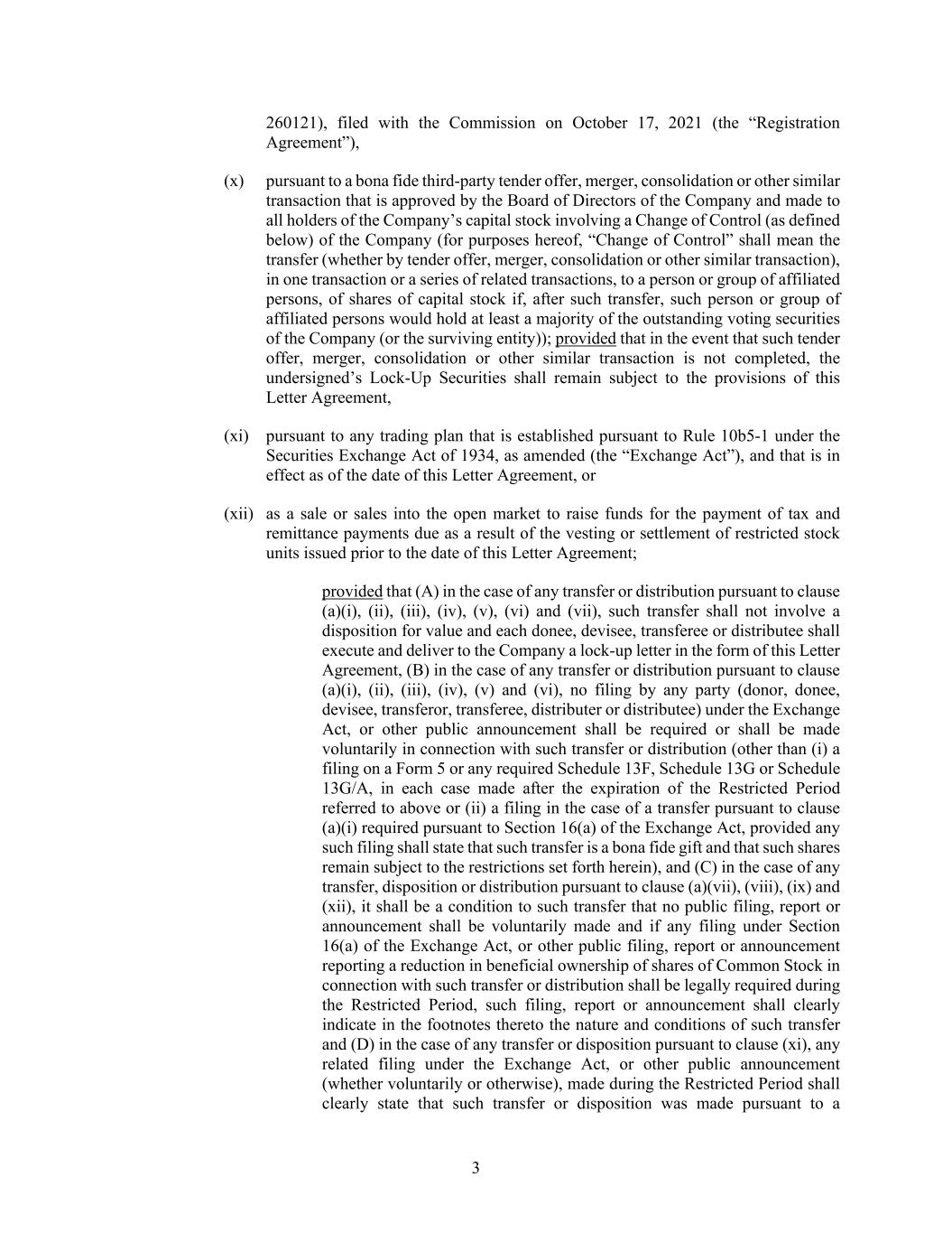 5 755611974.3 authority of the Company to comply with its obligations under the Subscription Agreements, the Registration Rights Agreement and the Other Investors Registration Rights Agreement. (e) As of their respective filing dates, all reports required to be filed by the Company with the U.S. Securities and Exchange Commission (the “SEC”) since September 17, 2021 (the “SEC Reports”) complied in all material respects with the applicable requirements of the Securities Exchange Act of 1934, as amended (the “Exchange Act”), and the rules and regulations of the SEC promulgated thereunder. None of the SEC Reports, when filed or, if amended, as of the date of such amendment with respect to those disclosures that are amended, contained any untrue statement of a material fact or omitted to state a material fact necessary to make the statements therein, in the light of the circumstances under which they were made, not misleading. The financial statements of the Company included in the SEC Reports comply in all material respects with applicable accounting requirements and the rules and regulations of the SEC with respect thereto as in effect at the time of filing and fairly present in all material respects the financial position of the Company as of and for the dates thereof and the results of operations and cash flows for the periods then ended, subject, in the case of unaudited financial statements, to normal, year-end audit adjustments. A copy of each SEC Report is available to the Investor via the SEC’s EDGAR system. There are no material outstanding or unresolved comments in comment letters received by the Company (or any affiliate or subsidiary thereof) from the staff of the Division of Corporation Finance of the SEC with respect to any of the SEC Reports. (f) The Company is not required to obtain any consent, waiver, authorization or order of, give any notice to, or make any filing or registration with, any court or other federal, state, local or other governmental authority, self-regulatory organization or other person in connection with the execution, delivery and performance by the Company of the Transaction Documents (including, without limitation, the issuance of the shares of Class A Common Stock pursuant to the Subscription Agreements and the Other Subscription Agreements), other than (i) filings with the SEC, (ii) filings required by applicable state securities laws, (iii) the filings required in accordance with Section 10 of this Subscription Agreement, and (iv) those required by the NYSE. (g) As of the date hereof, the authorized share capital of the Company consists of 1,010,000,000 shares of capital stock, consisting of (i) 1,000,000,000 shares of common stock, including (A) 700,000,000 shares of Class A Common Stock and (B) 300,000,000 shares of the Company’s Class B Common Stock, par value $0.0001 per share (the “Class B Common Stock”) and (ii) 10,000,000 shares of Company’s preferred stock, $0.0001 par value per share (“Preferred Stock”). As of close of business on the date immediately preceding the date hereof (the “Measurement Time”), (i) 319,446,565 shares of Class A Common Stock and 36,110,992 shares of Class B Common Stock, respectively, were issued and outstanding, all of which are validly issued, fully paid and non-assessable and not subject to any preemptive rights, (ii) no shares of Class A Common Stock or Class B Common Stock are held in the treasury of the Company, (iii) 54,851,453 warrants are issued and outstanding at a weighted-average exercise price of $5.33 per share, and (iv) no shares of Preferred Stock were issued and outstanding. Between the Measurement Time and the date hereof, the Company has not issued, or agreed to issue, any shares of Class A Common Stock, Class B Common Stock or Preferred Stock, other than (i) the issuance of (A) such number of shares of Class A Common Stock having an aggregate fair value of $6,000,000 pursuant to the securities purchase agreement, dated August 9, 2024, by and between the Company and an external vendor, (B) 57,050 shares of Class A Common Stock pursuant to a warrant to purchase shares of Class A Common Stock issued to an external vendor with an exercise