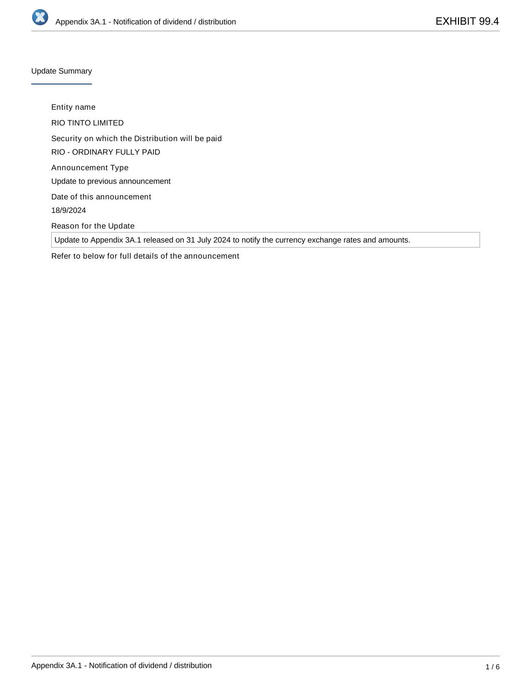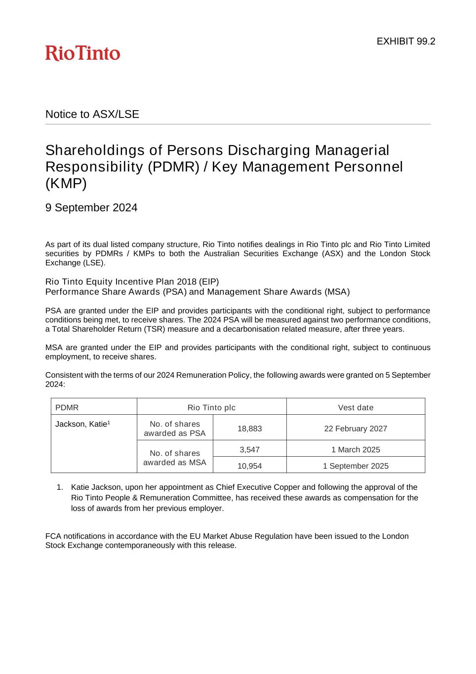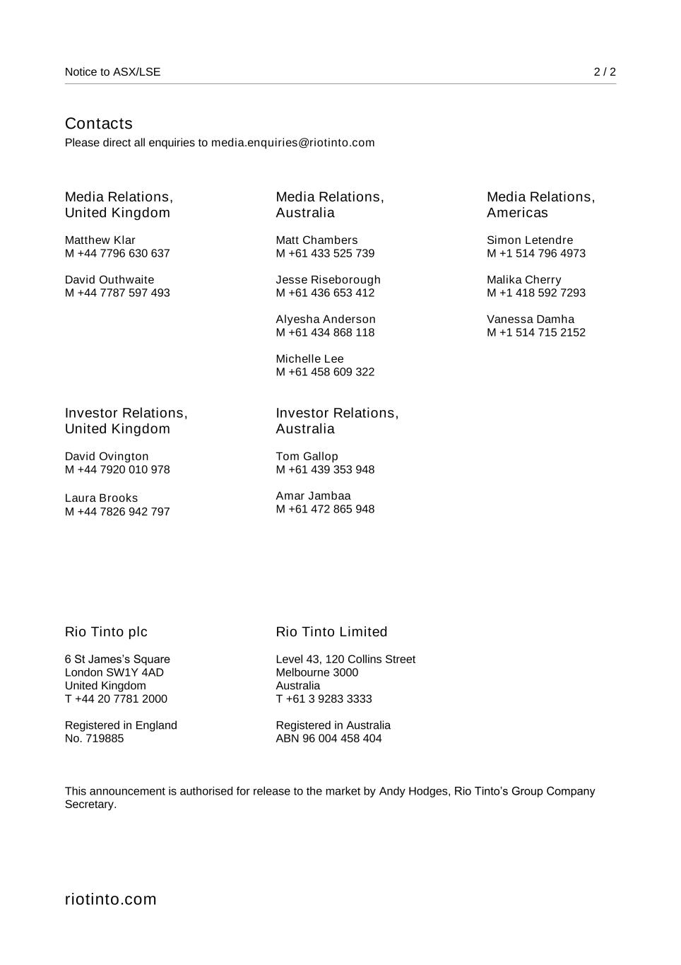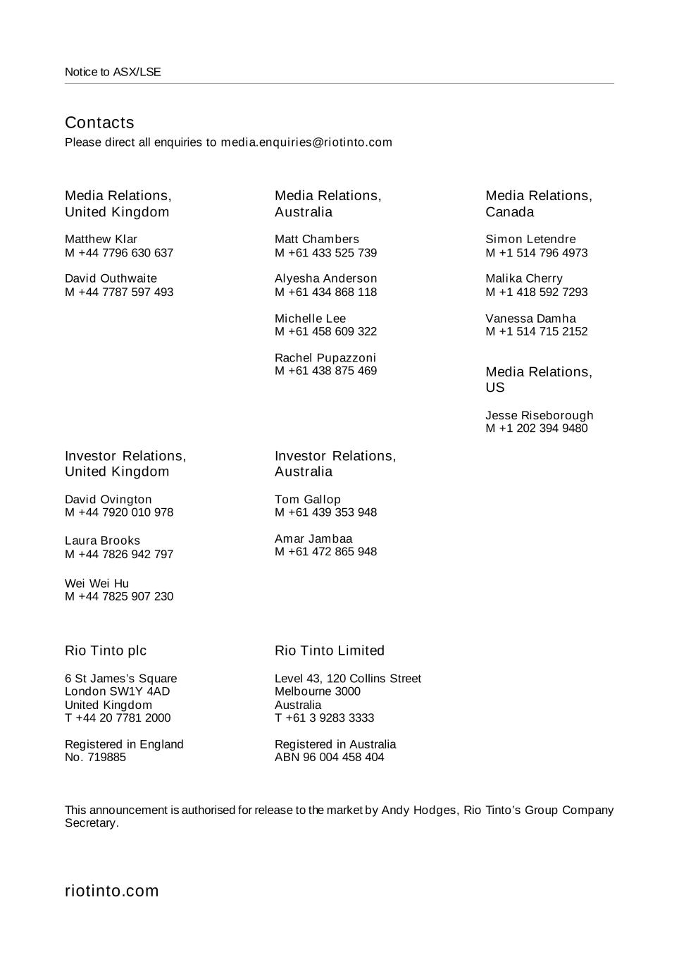 Notice to ASX/LSE Contacts Please direct all enquiries to media.enquiries@riotinto.com Media Relations, United Kingdom Matthew Klar M +44 7796 630 637 David Outhwaite M +44 7787 597 493 Media Relations, Australia Matt Chambers M +61 433 525 739 Alyesha Anderson M +61 434 868 118 Michelle Lee M +61 458 609 322 Rachel Pupazzoni M +61 438 875 469 Media Relations, Canada Simon Letendre M +1 514 796 4973 Malika Cherry M +1 418 592 7293 Vanessa Damha M +1 514 715 2152 Media Relations, US Jesse Riseborough M +1 202 394 9480 Investor Relations, United Kingdom David Ovington M +44 7920 010 978 Laura Brooks M +44 7826 942 797 Wei Wei Hu M +44 7825 907 230 Investor Relations, Australia Tom Gallop M +61 439 353 948 Amar Jambaa M +61 472 865 948 Rio Tinto plc 6 St James’s Square London SW1Y 4AD United Kingdom T +44 20 7781 2000 Registered in England No. 719885 Rio Tinto Limited Level 43, 120 Collins Street Melbourne 3000 Australia T +61 3 9283 3333 Registered in Australia ABN 96 004 458 404 This announcement is authorised for release to the market by Andy Hodges, Rio Tinto’s Group Company Secretary. riotinto.com