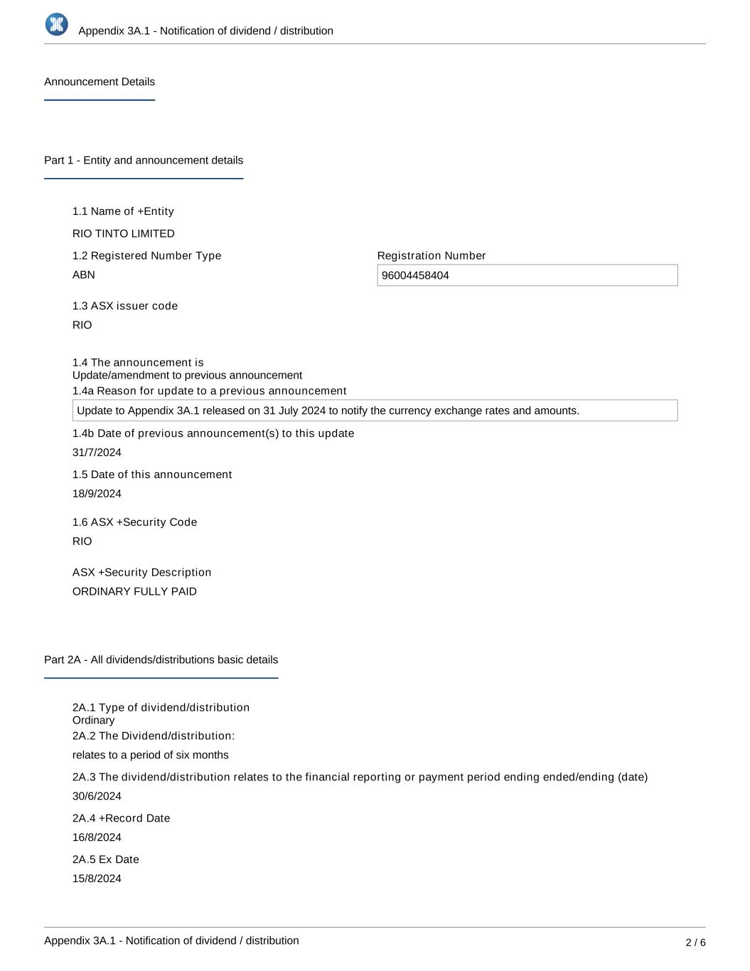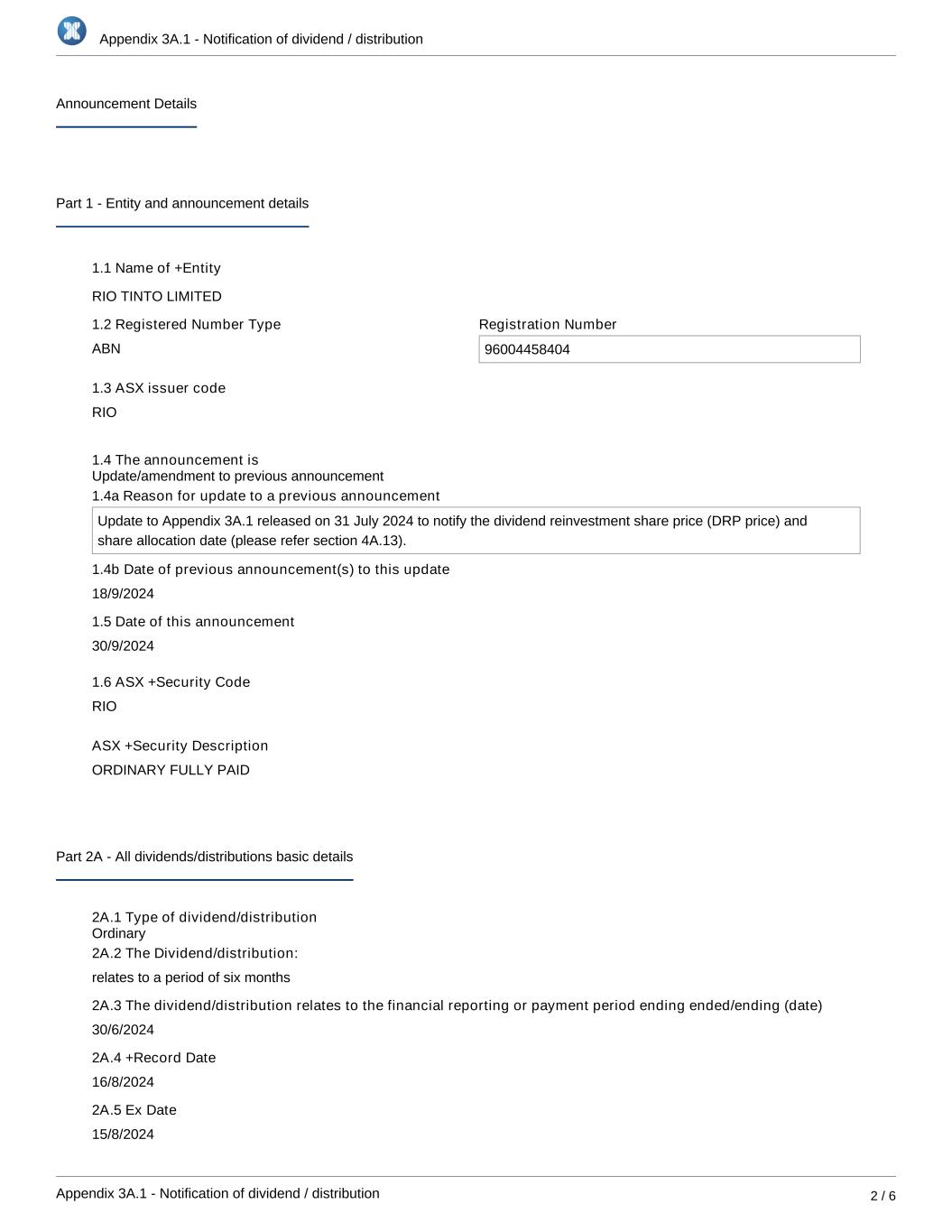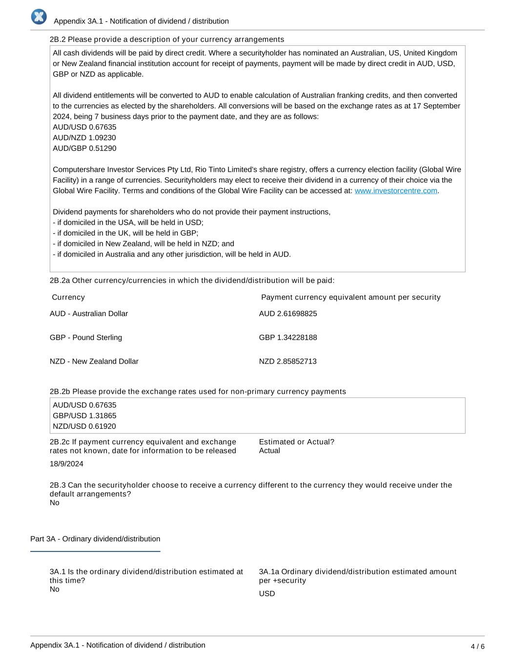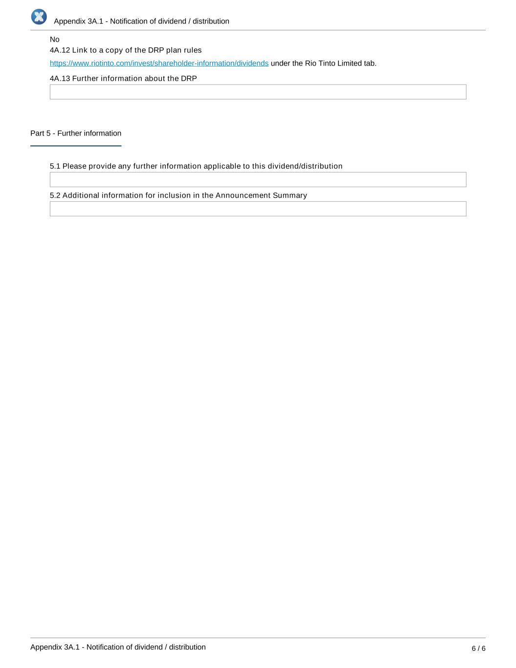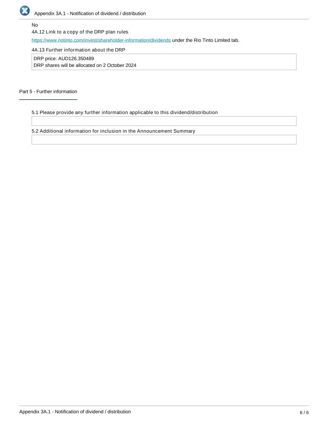 Notice to ASX/LSE Contacts Please direct all enquiries to media.enquiries@riotinto.com Media Relations, United Kingdom Matthew Klar M +44 7796 630 637 David Outhwaite M +44 7787 597 493 Media Relations, Australia Matt Chambers M +61 433 525 739 Alyesha Anderson M +61 434 868 118 Michelle Lee M +61 458 609 322 Rachel Pupazzoni M +61 438 875 469 Media Relations, Canada Simon Letendre M +1 514 796 4973 Malika Cherry M +1 418 592 7293 Vanessa Damha M +1 514 715 2152 Media Relations, US Jesse Riseborough M +1 202 394 9480 Investor Relations, United Kingdom David Ovington M +44 7920 010 978 Laura Brooks M +44 7826 942 797 Wei Wei Hu M +44 7825 907 230 Investor Relations, Australia Tom Gallop M +61 439 353 948 Amar Jambaa M +61 472 865 948 Rio Tinto plc 6 St James’s Square London SW1Y 4AD United Kingdom T +44 20 7781 2000 Registered in England No. 719885 Rio Tinto Limited Level 43, 120 Collins Street Melbourne 3000 Australia T +61 3 9283 3333 Registered in Australia ABN 96 004 458 404 This announcement is authorised for release to the market by Andy Hodges, Rio Tinto’s Group Company Secretary. riotinto.com