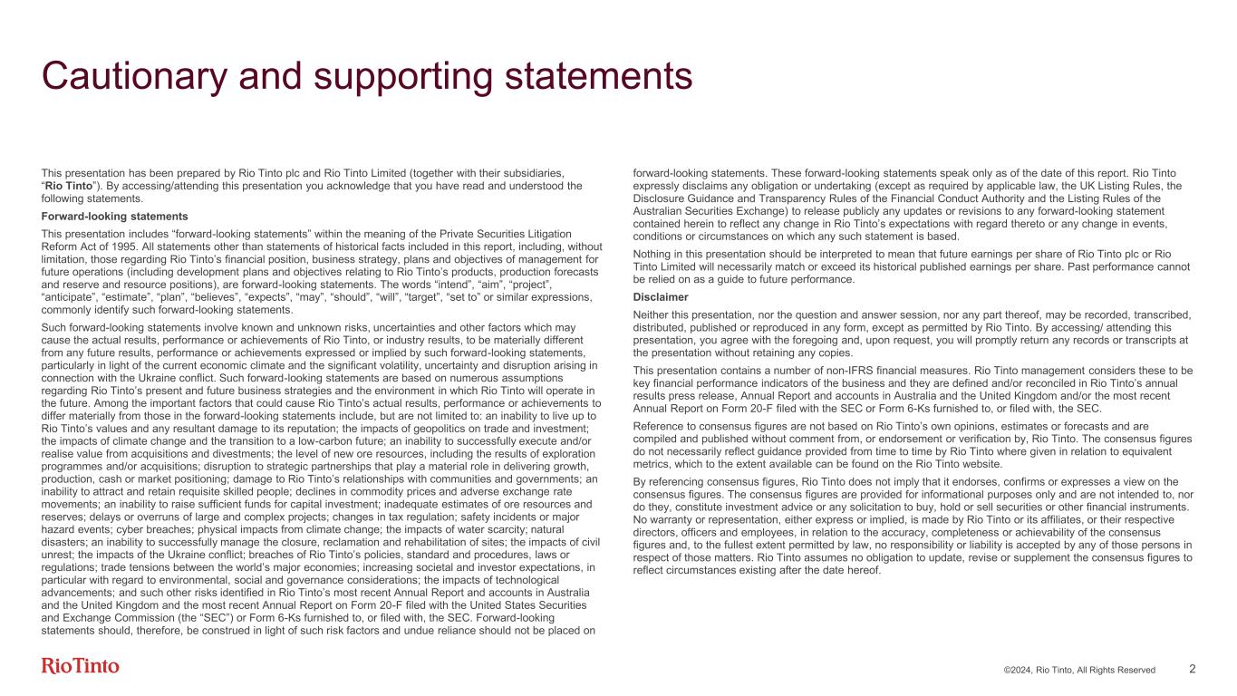 ©2024, Rio Tinto, All Rights Reserved 2 Cautionary and supporting statements This presentation has been prepared by Rio Tinto plc and Rio Tinto Limited (together with their subsidiaries, “Rio Tinto”). By accessing/attending this presentation you acknowledge that you have read and understood the following statements. Forward-looking statements This presentation includes “forward-looking statements” within the meaning of the Private Securities Litigation Reform Act of 1995. All statements other than statements of historical facts included in this report, including, without limitation, those regarding Rio Tinto’s financial position, business strategy, plans and objectives of management for future operations (including development plans and objectives relating to Rio Tinto’s products, production forecasts and reserve and resource positions), are forward-looking statements. The words “intend”, “aim”, “project”, “anticipate”, “estimate”, “plan”, “believes”, “expects”, “may”, “should”, “will”, “target”, “set to” or similar expressions, commonly identify such forward-looking statements. Such forward-looking statements involve known and unknown risks, uncertainties and other factors which may cause the actual results, performance or achievements of Rio Tinto, or industry results, to be materially different from any future results, performance or achievements expressed or implied by such forward-looking statements, particularly in light of the current economic climate and the significant volatility, uncertainty and disruption arising in connection with the Ukraine conflict. Such forward-looking statements are based on numerous assumptions regarding Rio Tinto’s present and future business strategies and the environment in which Rio Tinto will operate in the future. Among the important factors that could cause Rio Tinto’s actual results, performance or achievements to differ materially from those in the forward-looking statements include, but are not limited to: an inability to live up to Rio Tinto’s values and any resultant damage to its reputation; the impacts of geopolitics on trade and investment; the impacts of climate change and the transition to a low-carbon future; an inability to successfully execute and/or realise value from acquisitions and divestments; the level of new ore resources, including the results of exploration programmes and/or acquisitions; disruption to strategic partnerships that play a material role in delivering growth, production, cash or market positioning; damage to Rio Tinto’s relationships with communities and governments; an inability to attract and retain requisite skilled people; declines in commodity prices and adverse exchange rate movements; an inability to raise sufficient funds for capital investment; inadequate estimates of ore resources and reserves; delays or overruns of large and complex projects; changes in tax regulation; safety incidents or major hazard events; cyber breaches; physical impacts from climate change; the impacts of water scarcity; natural disasters; an inability to successfully manage the closure, reclamation and rehabilitation of sites; the impacts of civil unrest; the impacts of the Ukraine conflict; breaches of Rio Tinto’s policies, standard and procedures, laws or regulations; trade tensions between the world’s major economies; increasing societal and investor expectations, in particular with regard to environmental, social and governance considerations; the impacts of technological advancements; and such other risks identified in Rio Tinto’s most recent Annual Report and accounts in Australia and the United Kingdom and the most recent Annual Report on Form 20-F filed with the United States Securities and Exchange Commission (the “SEC”) or Form 6-Ks furnished to, or filed with, the SEC. Forward-looking statements should, therefore, be construed in light of such risk factors and undue reliance should not be placed on forward-looking statements. These forward-looking statements speak only as of the date of this report. Rio Tinto expressly disclaims any obligation or undertaking (except as required by applicable law, the UK Listing Rules, the Disclosure Guidance and Transparency Rules of the Financial Conduct Authority and the Listing Rules of the Australian Securities Exchange) to release publicly any updates or revisions to any forward-looking statement contained herein to reflect any change in Rio Tinto’s expectations with regard thereto or any change in events, conditions or circumstances on which any such statement is based. Nothing in this presentation should be interpreted to mean that future earnings per share of Rio Tinto plc or Rio Tinto Limited will necessarily match or exceed its historical published earnings per share. Past performance cannot be relied on as a guide to future performance. Disclaimer Neither this presentation, nor the question and answer session, nor any part thereof, may be recorded, transcribed, distributed, published or reproduced in any form, except as permitted by Rio Tinto. By accessing/ attending this presentation, you agree with the foregoing and, upon request, you will promptly return any records or transcripts at the presentation without retaining any copies. This presentation contains a number of non-IFRS financial measures. Rio Tinto management considers these to be key financial performance indicators of the business and they are defined and/or reconciled in Rio Tinto’s annual results press release, Annual Report and accounts in Australia and the United Kingdom and/or the most recent Annual Report on Form 20-F filed with the SEC or Form 6-Ks furnished to, or filed with, the SEC. Reference to consensus figures are not based on Rio Tinto’s own opinions, estimates or forecasts and are compiled and published without comment from, or endorsement or verification by, Rio Tinto. The consensus figures do not necessaril