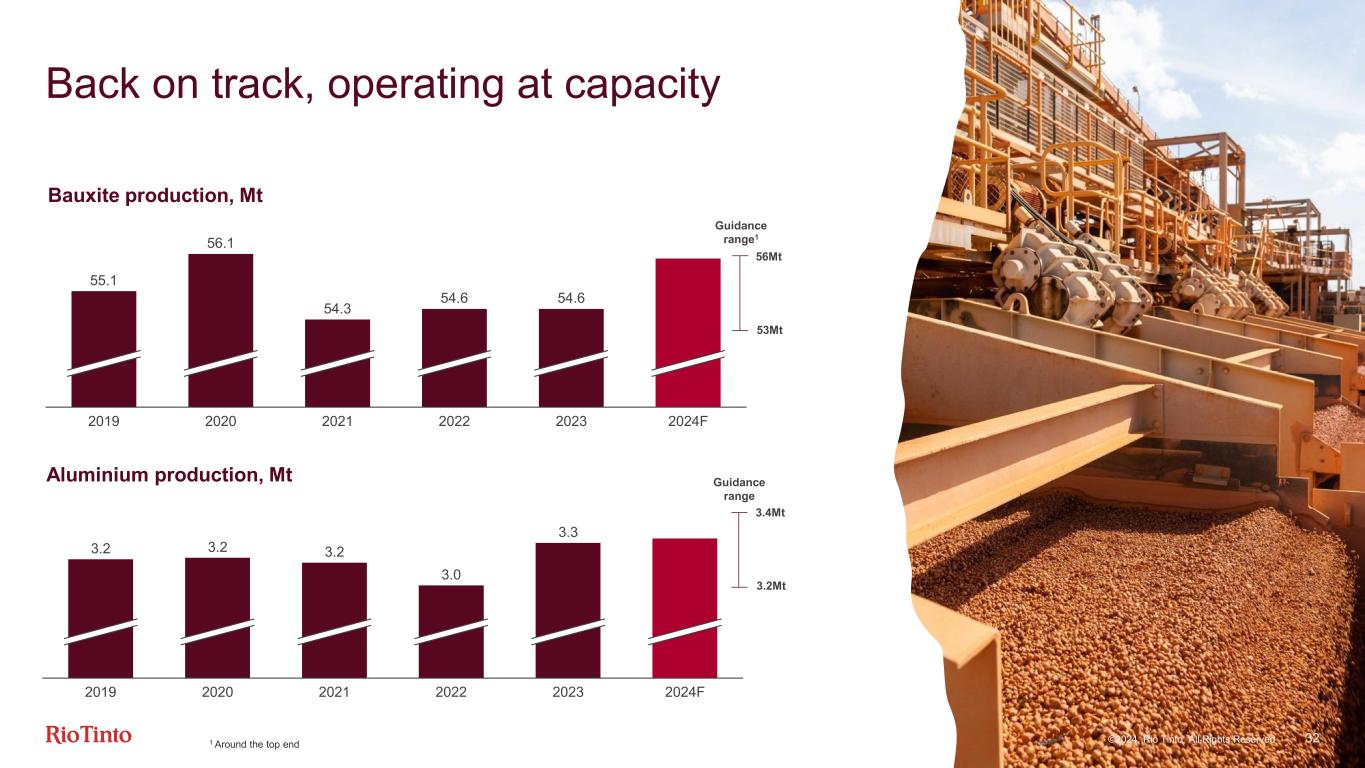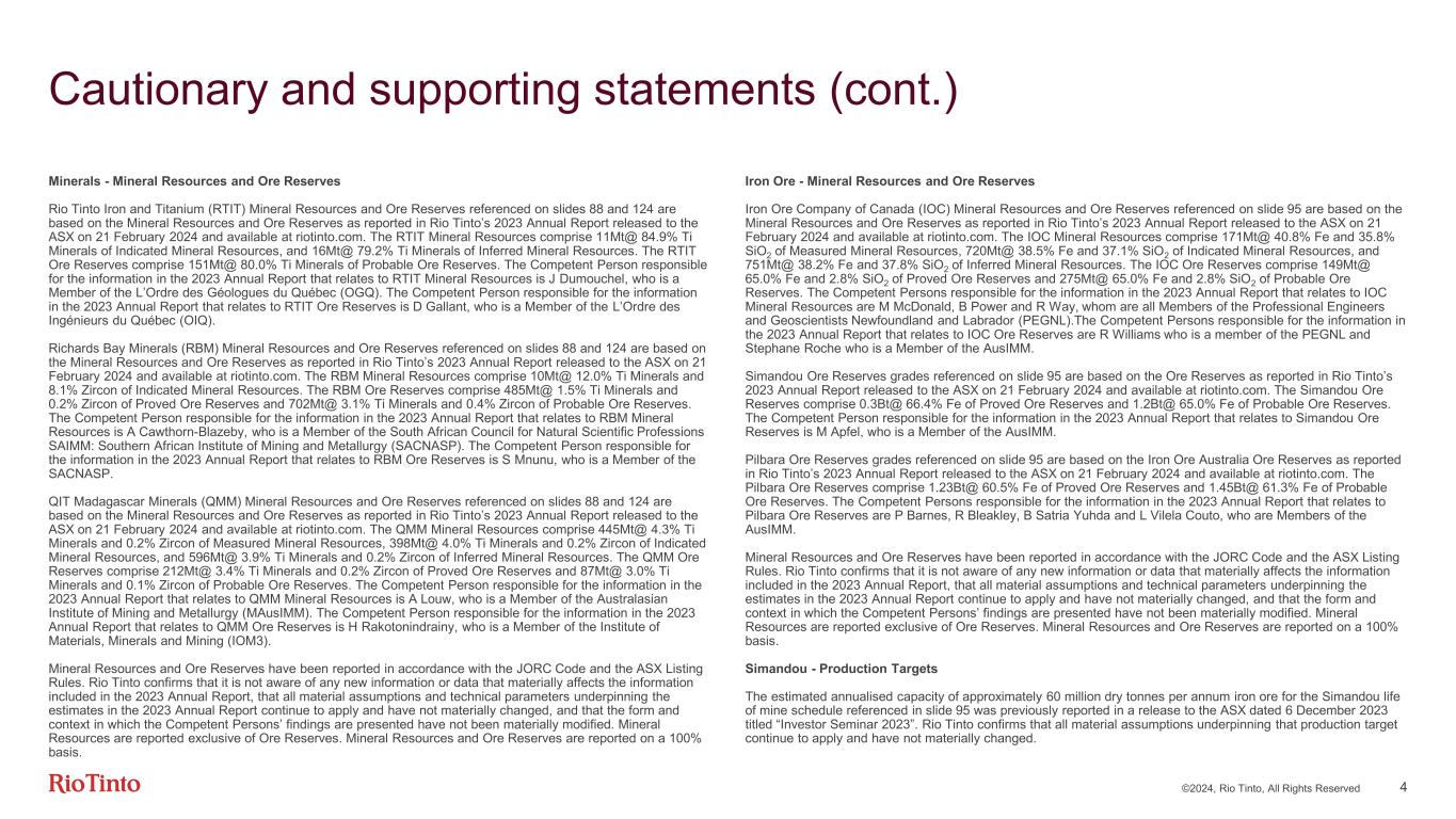 ©2024, Rio Tinto, All Rights Reserved 3 Cautionary and supporting statements (cont.) Aluminium - Mineral Resources and Ore Reserves Amrun Mineral Resources and Ore Reserves referenced on slide 45 are based on the Mineral Resources and Ore Reserves as reported in Rio Tinto’s 2023 Annual Report released to the Australian Securities Exchange (ASX) on 21 February 2024 and available at riotinto.com. The Amrun Mineral Resources comprise 115Mt@ 49.2% Al2O3 and 11.7% SiO2 of Measured Mineral Resources, 388Mt@ 49.7% Al2O3 and 11.7% SiO2 of Indicated Mineral Resources, and 285Mt@ 51.7% Al2O3 and 12.1% SiO2 of Inferred Mineral Resources. The Amrun Ore Reserves comprise 263Mt@ 53.9% Al2O3 and 9.2% SiO2 of Proved Ore Reserves and 688Mt@ 54.5% Al2O3 and 9.0% SiO2 of Probable Ore Reserves. Andoom/East Weipa Mineral Resources and Ore Reserves referenced on slide 45 are based on the Mineral Resources and Ore Reserves as reported in Rio Tinto’s 2023 Annual Report released to the ASX on 21 February 2024 and available at riotinto.com. The Andoom/East Weipa Mineral Resources comprise 43Mt@ 49.9% Al2O3 and 8.8% SiO2 of Measured Mineral Resources. The Andoom/East Weipa Ore Reserves comprise 69Mt@ 50.5% Al2O3 and 7.9% SiO2 of Proved Ore Reserves and 3 Mt@ 49.5% Al2O3 and 8.7% SiO2 of Probable Ore Reserves. North of Weipa Mineral Resources referenced on slide 45 are based on the Mineral Resources as reported in Rio Tinto’s 2023 Annual Report released to the ASX on 21 February 2024 and available at riotinto.com. The North of Weipa Mineral Resources comprise 202Mt@ 52.0% Al2O3 and 11.1% SiO2 of Indicated Mineral Resources, and 1,248Mt@ 51.8% Al2O3 and 11.4% SiO2 of Inferred Mineral Resources. Gove Mineral Resources and Ore Reserves referenced on slide 45 are based on the Mineral Resources and Ore Reserves as reported in Rio Tinto’s 2023 Annual Report released to the ASX on 21 February 2024 and available at riotinto.com. The Gove Mineral Resources comprise 9Mt@ 48.1% Al2O3 and 8.9% SiO2 of Measured Mineral Resources, 0.4Mt@ 47.8% Al2O3 and 8.9% SiO2 of Indicated Mineral Resources, and 0.01Mt@ 46.9% Al2O3 and 8.1% SiO2 of Inferred Mineral Resources. The Gove Ore Reserves comprise 57Mt@ 50.2% Al2O3 and 6.4% SiO2 of Proved Ore Reserves and 0.7Mt@ 50.5% Al2O3 and 5.0% SiO2 of Probable Ore Reserves. The Competent Person responsible for the information in the 2023 Annual Report that relates to Amrun, Andoom/East Weipa, North of Weipa and Gove Mineral Resources is A McIntyre, who is a Member of the AusIMM. The Competent Person responsible for the information in the 2023 Annual Report that relates to Amrun Ore Reserves is W Saba, who is a Member of the AusIMM. Sangaredi Mineral Resources and Ore Reserves referenced on slide 45 are based on the Mineral Resources and Ore Reserves as reported in Rio Tinto’s 2023 Annual Report released to the ASX on 21 February 2024 and available at riotinto.com. The Sangaredi Mineral Resources comprise 323Mt@ 43.7% Al2O3 and 2.1% SiO2 of Measured Mineral Resources, 5,961Mt@ 46.6% Al2O3 and 2.3% SiO2 of Indicated Mineral Resources, and 737Mt@ 45.8% Al2O3 and 2.4% SiO2 of Inferred Mineral Resources. The Sangaredi Ore Reserves comprise 333Mt@ 47.0% Al2O3 and 1.9% SiO2 of Proved Ore Reserves and 17Mt@ 48.9% Al2O3 and 2.5% SiO2 of Probable Ore Reserves. The Competent Person responsible for the information in the 2023 Annual Report that relates to Sangaredi Mineral Resources is M Alpha Diallo, who is a Member of the European Federation of Geologists (EFG).The Competent Person responsible for the information in the 2023 Annual Report that relates to Sangaredi Ore Reserves is M Keersemaker, who is a Member of the AusIMM. Porto Trombetas Mineral Resources and Ore Reserves referenced on slide 45 are based on the Mineral Resources and Ore Reserves as reported in Rio Tinto’s 2023 Annual Report released to the ASX on 21 February 2024 and available at riotinto.com. The Porto Trombetas Mineral Resources comprise 422Mt@ 47.3% Al2O3 and 5.3% SiO2 of Measured Mineral Resources, 3Mt@ 48.9% Al2O3 and 2.5% SiO2 of Indicated Mineral Resources, and 146Mt@ 49.5% Al2O3 and 4.0% SiO2 of Inferred Mineral Resources. The Porto Trombetas Ore Reserves comprise 43Mt@ 48.9.0% Al2O3 and 4.9% SiO2 of Proved Ore Reserves and 3Mt@ 49.0% Al2O3 and 4.9% SiO2 of Probable Ore Reserves. The Competent Person responsible for the information in the 2023 Annual Report that relates to Porto Trombetas Mineral Resources is R Aglinskas, who is a Member of the AusIMM. The Competent Person responsible for the information in the 2023 Annual Report that relates to Porto Trombetas Ore Reserves is L H Costa, who is a Member of the AusIMM. Mineral Resources and Ore Reserves have been reported in accordance with the JORC Code and the ASX Listing Rules. Rio Tinto confirms that it is not aware of any new information or data that materially affects the information included in the 2023 Annual Report, that all material assumptions and technical parameters underpinning the estimates in the 2023 Annual Report continue to apply and have not materially changed, and that the form and context in which the Competent Persons’ findings are presented have not been materially modified. Mineral Resources are reported exclusive of Ore Reserves. Mineral Resources and Ore Reserves are reported on a 100% basis.