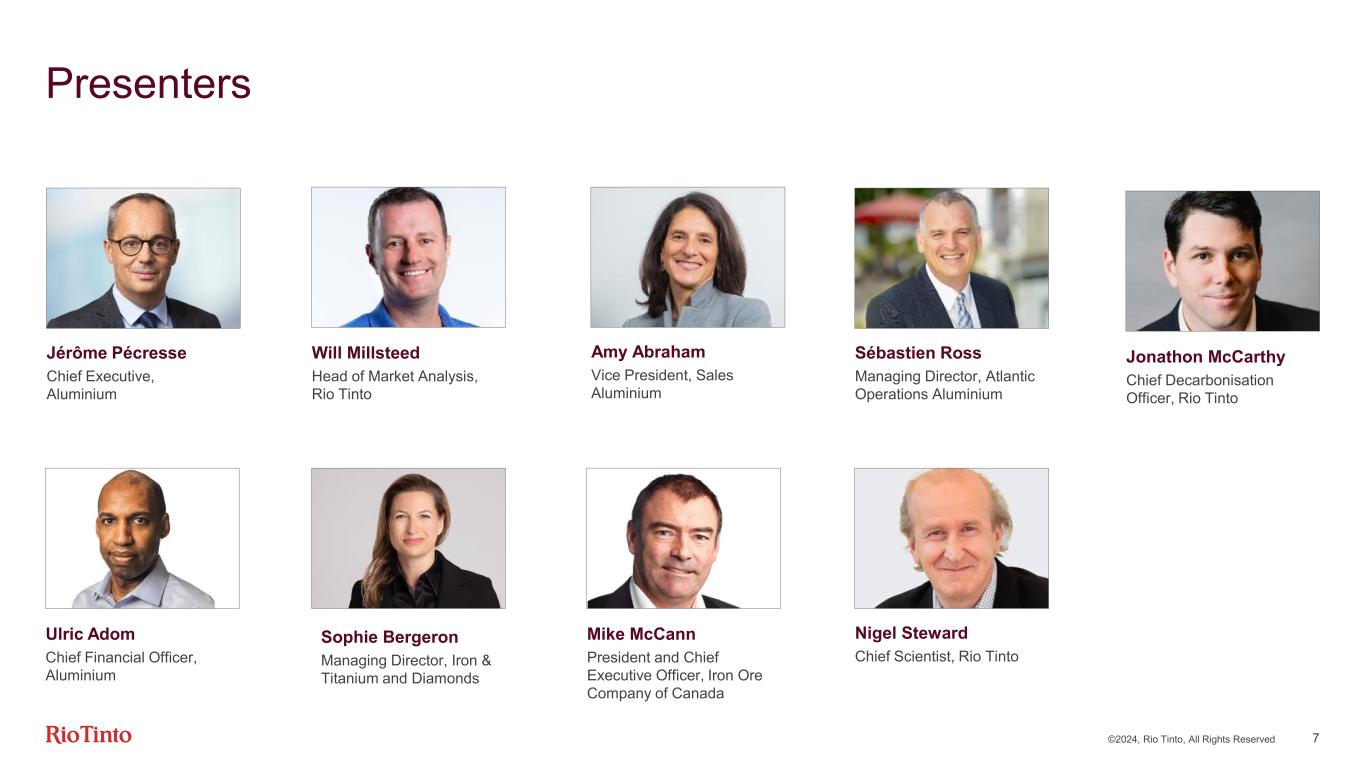 Topic Presenters Safety share Mike McCann, President and Chief Executive Officer, Iron Ore Company of Canada Our North American footprint Jérôme Pécresse, Chief Executive, Aluminium Market update Will Millsteed, Head of Market Analysis, Rio Tinto Aluminium update Jérôme Pécresse, Chief Executive, Aluminium Amy Abraham, Vice President, Sales, Aluminium Sébastien Ross, Managing Director, Atlantic Operations Aluminium Jonathon McCarthy, Chief Decarbonisation Officer, Rio Tinto Ulric Adom, Chief Financial Officer, Aluminium Q&A Lunch break Iron & Titanium Sophie Bergeron, Managing Director, Iron & Titanium and Diamonds Iron Ore Company of Canada Mike McCann, President and Chief Executive Officer, Iron Ore Company of Canada Break Technology update Nigel Steward, Chief Scientist, Rio Tinto Q&A ©2024, Rio Tinto, All Rights Reserved 6 Overview of presentations