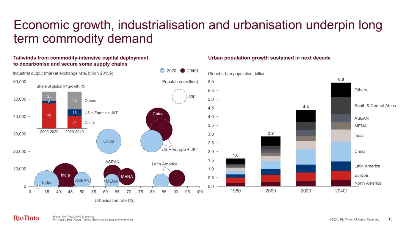 ©2024, Rio Tinto, All Rights Reserved 13 Economic growth, industrialisation and urbanisation underpin long term commodity demand 0 10,000 20,000 30,000 40,000 50,000 60,000 40 45 50 55 60 65 70 75 80 85 90 950 10035 Urbanisation rate (%) Industrial output (market exchange rate, billion 2015$) US + Europe + JKT China India ASEAN Latin America MENA China India ASEAN MENA 2020 2040 500 Population (million) Tailwinds from commodity-intensive capital deployment to decarbonise and secure some supply chains Urban population growth sustained in next decade 0.0 0.5 1.0 1.5 2.0 2.5 3.0 3.5 4.0 4.5 5.0 5.5 6.0 Global urban population, billion 1980 2000 2020 2040f Others South & Central Africa ASEAN MENA India China Latin America Europe North America 1.6 2.9 4.4 6.0 70 34 18 25 48 Share of global IP growth, % 5 2000-2020 2020-2040 Others US + Europe + JKT China f Source: Rio Tinto, Oxford Economics JKT: Japan, South Korea, Taiwan; MENA: Middle East and North Africa