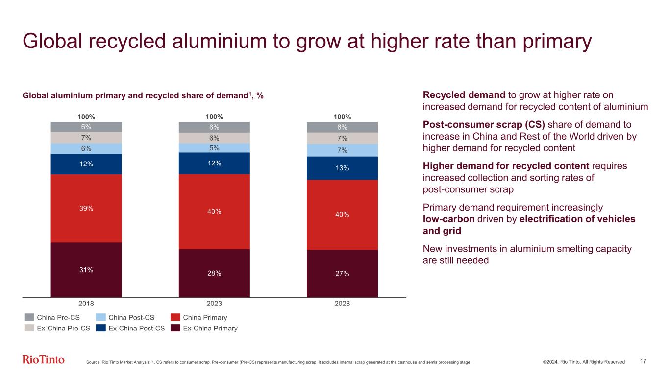 ©2024, Rio Tinto, All Rights Reserved 16 Aluminium demand growth driven by energy transition 2018 Global aluminium semis demand growth is driven by electrification of vehicles and grid1 Global regional demand2 2028 Mt 85232-5-1 EVsElectricalOther transportOtherPackagingICEConstruction 14 11% 14% 12% 17% 24% 22% 1% 91Mt 2023-2028 change by end-use sector, Mt Other transport EVs Electrical Packaging ICE Construction Other 10% 7% 17% 12% 11% 21% 22% 98Mt 10% 13% 19% 13% 5% 17% 22% 112Mt 2023 2028Shares of end-use sectors Source: Rio Tinto Market Analysis; Note: 1. Other end-use sector includes consumer durables, machinery & equipment. Electrical sector includes power grid, solar, onshore wind, offshore wind and other electrical. 2. Global South includes China, India, the Middle East, Africa, Central & South America and the Rest of Asia. Global North represents Europe, North America, Australasia and the developed parts of Asia. 12 25 75 North America Other Global North Global South 4 2 3 North America Other Global North Global South 2023-2028 CAGR %