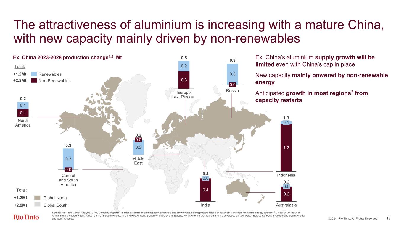 ©2024, Rio Tinto, All Rights Reserved 19 The attractiveness of aluminium is increasing with a mature China, with new capacity mainly driven by non-renewables 0.0 0.4 India 0.4 0.1 1.2 Indonesia 1.3 0.2 0.3 Europe ex. Russia 0.5 0.3 0.0 Russia 0.3 0.1 0.1 North America 0.2 0.0 0.2 Australasia 0.2 0.3 0.0 Central and South America 0.3 0.0 0.2 Middle East 0.2 Renewables Non-Renewables Total: +1.2Mt +2.2Mt Ex. China 2023-2028 production change1,2, Mt Global North Global South Total: +1.2Mt +2.2Mt Source: Rio Tinto Market Analysis, CRU, Company Reports 1 Includes restarts of idled capacity, greenfield and brownfield smelting projects based on renewable and non-renewable energy sources. 2 Global South includes China, India, the Middle East, Africa, Central & South America and the Rest of Asia. Global North represents Europe, North America, Australasia and the developed parts of Asia. 3 Europe ex. Russia, Central and South America and North America. Ex. China’s aluminium supply growth will be limited even with China’s cap in place New capacity mainly powered by non-renewable energy Anticipated growth in most regions3 from capacity restarts