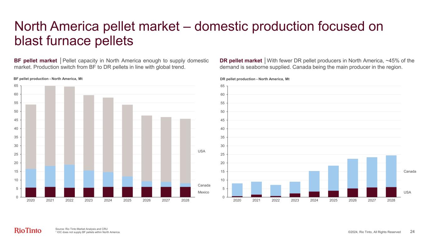 ©2024, Rio Tinto, All Rights Reserved 24 North America pellet market – domestic production focused on blast furnace pellets BF pellet market │Pellet capacity in North America enough to supply domestic market. Production switch from BF to DR pellets in line with global trend. 0 5 10 15 20 25 30 35 40 45 50 55 60 65 BF pellet production - North America, Mt 2020 2021 2022 2023 2024 2025 2026 2027 2028 USA Canada Mexico DR pellet market │With fewer DR pellet producers in North America, ~45% of the demand is seaborne supplied. Canada being the main producer in the region. 0 5 10 15 20 25 30 35 40 45 50 55 60 65 DR pellet production - North America, Mt 2020 2021 2022 2023 2024 2025 2026 2027 2028 Canada USA Source: Rio Tinto Market Analysis and CRU 1 IOC does not supply BF pellets within North America.