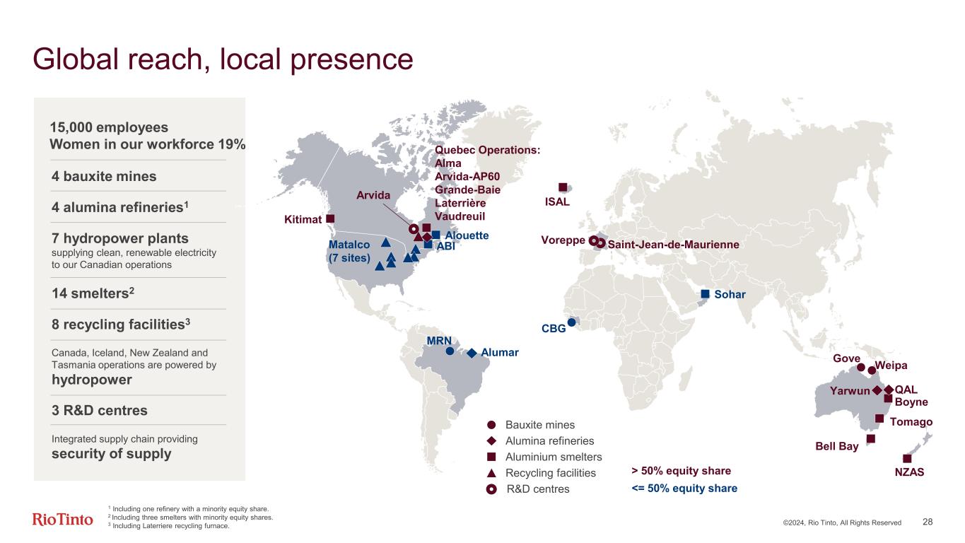 ©2024, Rio Tinto, All Rights Reserved 27 Aluminium is a key differentiator for Rio Tinto We have a global footprint of world-class primarily low-carbon, aluminium assets We have stabilised our assets and have a clear pathway to deliver greater returns • Repowering of Pacific Operations • Operational excellence • Access into most attractive market with a strong commercial position in North America • Robust technology foundation We have strong relationships with governments and communities where we operate