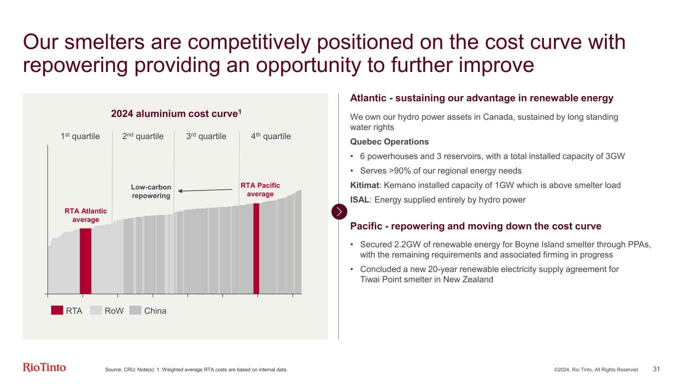 ©2024, Rio Tinto, All Rights Reserved 30 Our impeccable ESG vision is anchored around 4 dimensions Zero Harm Operate in a way that does not harm people and minimises the impact on the environment. Reduce the carbon footprint of our operations and value chain. Empowered People Empower and develop people through a culture of diversity and inclusion. Create a psychologically safe, diverse, and inclusive environment, where people feel empowered to speak up and bring their true selves to work each day. Preferred Partner Be a reliable and attractive partner to governments, Indigenous Peoples, communities, suppliers and other key stakeholders. Form a wide range of partnerships with Indigenous Peoples and Traditional Owners. Responsible Aluminium Be recognised as the leading Responsible Aluminium business, resulting in our aluminium being the material of choice for our customers and end-users thanks to its low-carbon, circularity, and low-environmental impact.