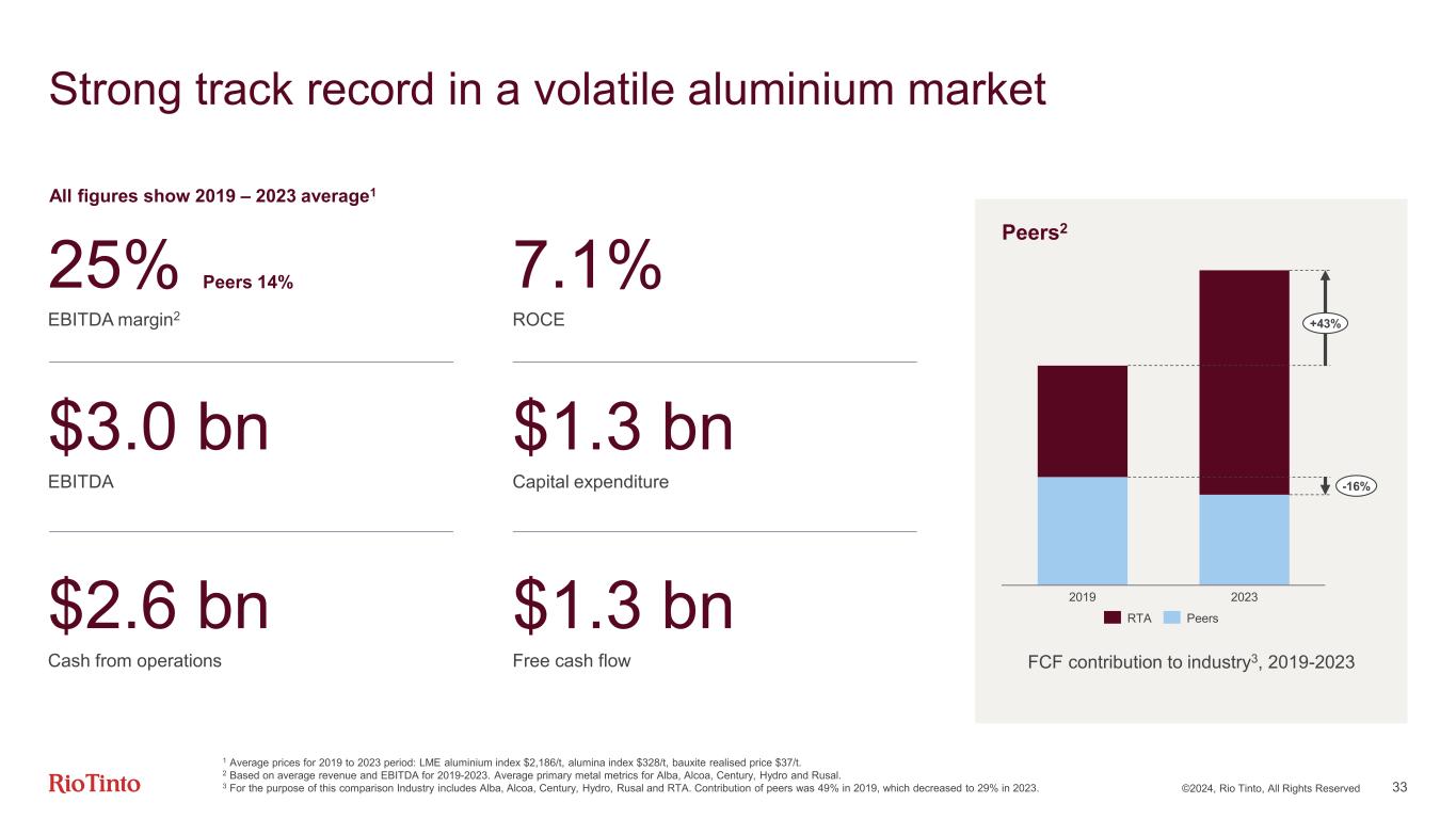 ©2024, Rio Tinto, All Rights Reserved Strong track record in a volatile aluminium market 25% $1.3 bn EBITDA margin2 $3.0 bn Capital expenditureEBITDA $2.6 bn Cash from operations $1.3 bn Free cash flow 7.1% ROCE 1 Average prices for 2019 to 2023 period: LME aluminium index $2,186/t, alumina index $328/t, bauxite realised price $37/t. 2 Based on average revenue and EBITDA for 2019-2023. Average primary metal metrics for Alba, Alcoa, Century, Hydro and Rusal. 3 For the purpose of this comparison Industry includes Alba, Alcoa, Century, Hydro, Rusal and RTA. Contribution of peers was 49% in 2019, which decreased to 29% in 2023. FCF contribution to industry3, 2019-2023 Peers2 2019 2023 +43% -16% RTA Peers Peers 14% 33 All figures show 2019 – 2023 average1