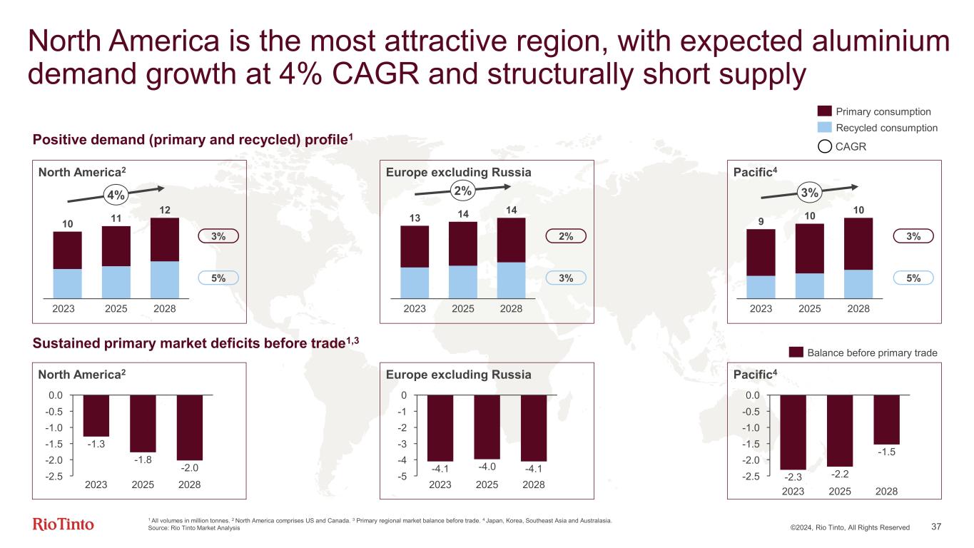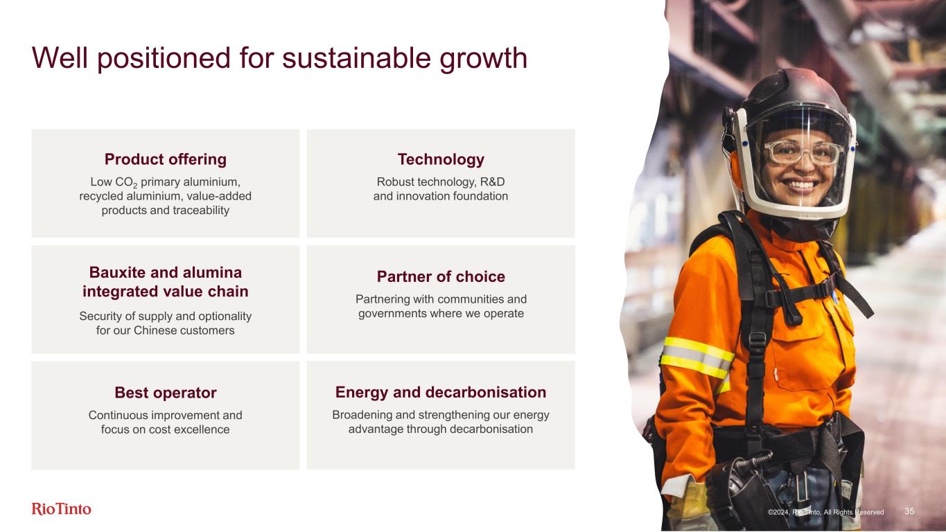 34©2024, Rio Tinto, All Rights Reserved Aluminium demand driven by electrification and requirement for low-carbon supply Source: Rio Tinto Market Analysis. Notes: 1 Total primary and recycled aluminium metal requirement excluding melt loss. 2 CAGR . 3 Aluminium semis demand. Electrical includes power grid, solar, onshore wind, offshore wind and other electrical. Transport excludes autos Energy transition drives global aluminium demand3, change from 2023 to 2028, Mt • Strong outlook for aluminium demand driven by global energy transition • World aluminium demand will outpace increase in primary production resulting in deficits. Competition for scrap units will intensify • China is close to reaching its capacity cap, resulting in higher primary imports. Few low-carbon aluminium smelting projects outside China • Low level of aluminium inventories and market deficit is expected to result in higher prices and premiums Global aluminium demand1, Mt 65 27 2018 71 28 2023 77 35 2028 92 98 112+1%2 +3%2 Primary Recycled 2018 2023 2028 64 71 76+2%2 +1%2 Primary Global aluminium primary production, Mt 2 Packaging 1 Durables 2 Machinery 1 Other 20282023 2 Construction 3 Autos 2 Transport 5 Electrical 98 112