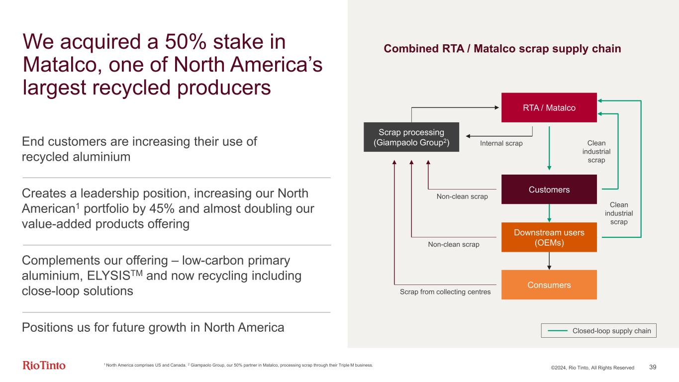 ©2024, Rio Tinto, All Rights Reserved 39 We acquired a 50% stake in Matalco, one of North America’s largest recycled producers End customers are increasing their use of recycled aluminium Creates a leadership position, increasing our North American1 portfolio by 45% and almost doubling our value-added products offering Complements our offering – low-carbon primary aluminium, ELYSISTM and now recycling including close-loop solutions Positions us for future growth in North America 1 North America comprises US and Canada. 2 Giampaolo Group, our 50% partner in Matalco, processing scrap through their Triple M business. RTA / Matalco Scrap processing (Giampaolo Group2) Customers Consumers Downstream users (OEMs) Internal scrap Scrap from collecting centres Non-clean scrap Non-clean scrap Clean industrial scrap Clean industrial scrap Combined RTA / Matalco scrap supply chain Closed-loop supply chain