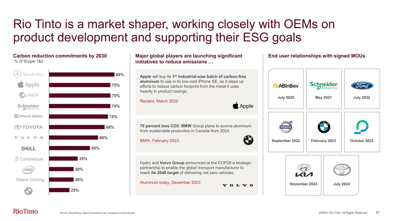 70 percent less CO2: BMW Group plans to source aluminum from sustainable production in Canada from 2024. BMW, February 2023 Apple will buy its 1st industrial-size batch of carbon-free aluminum to use in its low-cost iPhone SE, as it steps up efforts to reduce carbon footprint from the metal it uses heavily in product casings. Reuters, March 2022 Source: Bloomberg; https://zerotracker.net/, company annual reports ©2024, Rio Tinto, All Rights Reserved 41 Rio Tinto is a market shaper, working closely with OEMs on product development and supporting their ESG goals Mercedes Apple Pepsi Schneider General Motors 2035 Toyota Volvo Dell Constellium Intel Owens Corning BMW 80% 75% 75% 75% 72% 68% 60% 50% 35% 30% 30% 25% Carbon reduction commitments by 2030 % of Scope 1&2 Hydro and Volvo Group announced at the COP28 a strategic partnership to enable the global transport manufacturer to reach its 2040 target of delivering net zero vehicles. Aluminum today, December 2023 Major global players are launching significant initiatives to reduce emissions … July 2022 September 2022 October 2023 November 2023 May 2021 July 2024 July 2020 February 2023 End user relationships with signed MOUs