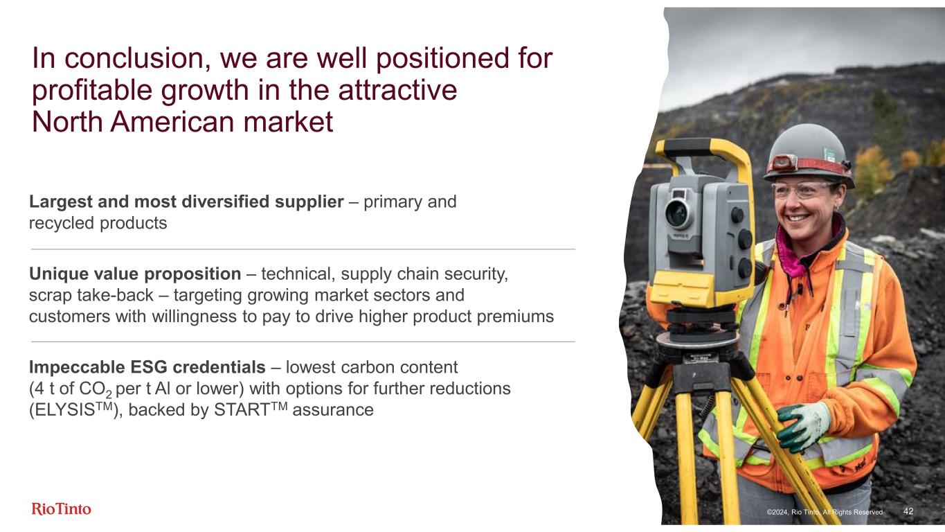 ©2024, Rio Tinto, All Rights Reserved 42 In conclusion, we are well positioned for profitable growth in the attractive North American market Largest and most diversified supplier – primary and recycled products Unique value proposition – technical, supply chain security, scrap take-back – targeting growing market sectors and customers with willingness to pay to drive higher product premiums Impeccable ESG credentials – lowest carbon content (4 t of CO2 per t Al or lower) with options for further reductions (ELYSISTM), backed by STARTTM assurance