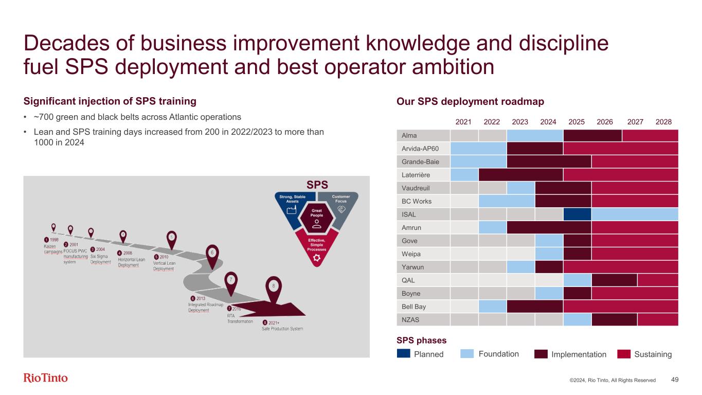 ©2024, Rio Tinto, All Rights Reserved 49 Decades of business improvement knowledge and discipline fuel SPS deployment and best operator ambition Significant injection of SPS training • ~700 green and black belts across Atlantic operations • Lean and SPS training days increased from 200 in 2022/2023 to more than 1000 in 2024 2021 2022 2023 2024 2025 2026 2027 2028 Alma Arvida-AP60 Grande-Baie Laterrière Vaudreuil BC Works ISAL Amrun Gove Weipa Yarwun QAL Boyne Bell Bay NZAS Our SPS deployment roadmap Planned SPS phases SPS SustainingImplementationFoundation