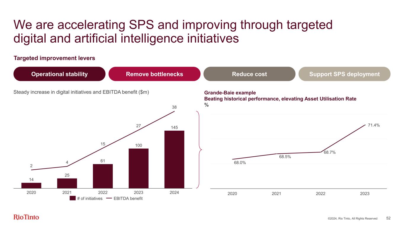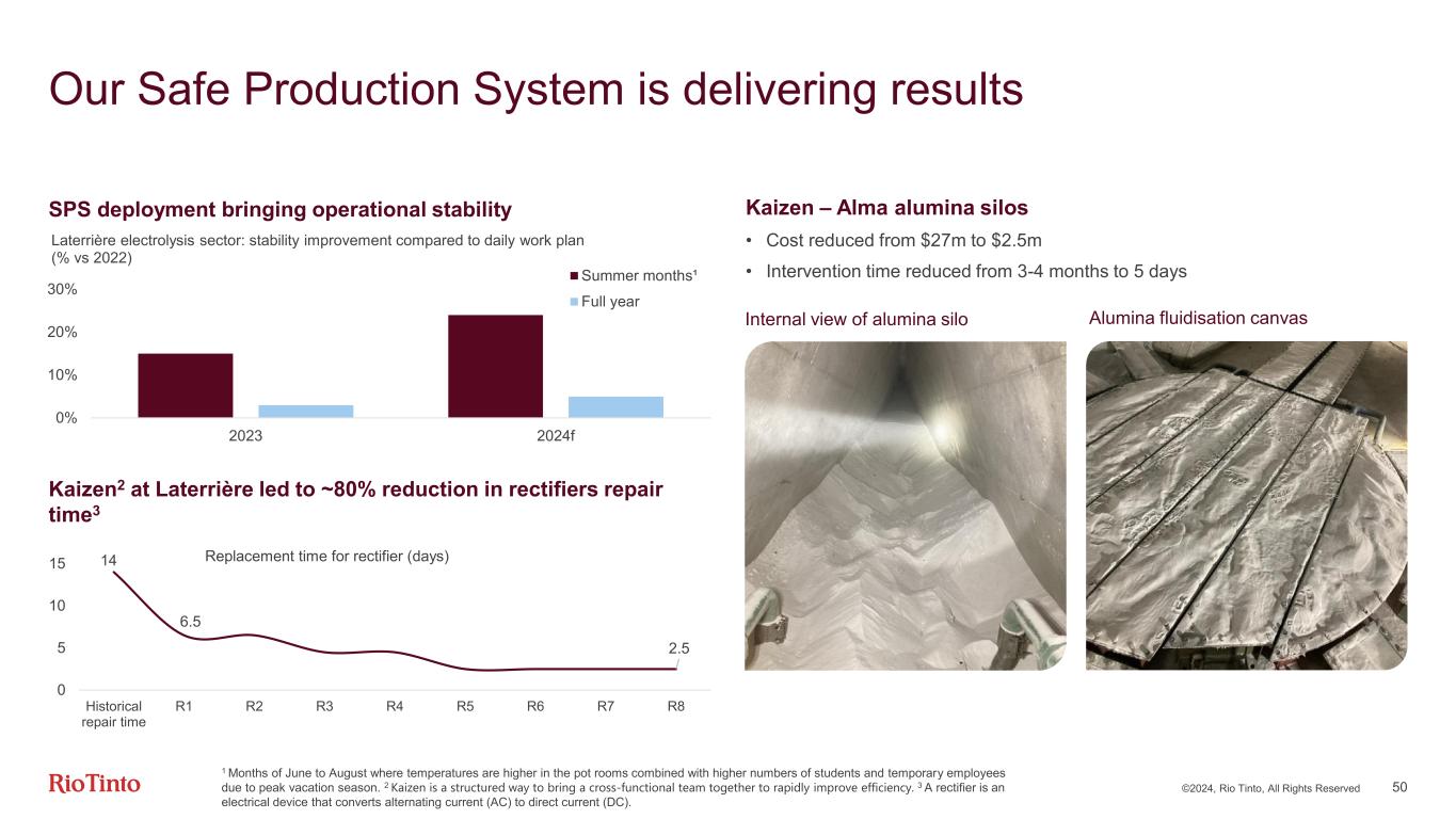 ©2024, Rio Tinto, All Rights Reserved 50 Our Safe Production System is delivering results SPS deployment bringing operational stability 0% 10% 20% 30% 2023 2024f Laterrière electrolysis sector: stability improvement compared to daily work plan (% vs 2022) Summer months¹ Full year Kaizen2 at Laterrière led to ~80% reduction in rectifiers repair time3 Kaizen – Alma alumina silos • Cost reduced from $27m to $2.5m • Intervention time reduced from 3-4 months to 5 days 1 Months of June to August where temperatures are higher in the pot rooms combined with higher numbers of students and temporary employees due to peak vacation season. 2 Kaizen is a structured way to bring a cross-functional team together to rapidly improve efficiency. 3 A rectifier is an electrical device that converts alternating current (AC) to direct current (DC). 14 6.5 2.5 0 5 10 15 Historical repair time R1 R2 R3 R4 R5 R6 R7 R8 Replacement time for rectifier (days) Internal view of alumina silo Alumina fluidisation canvas