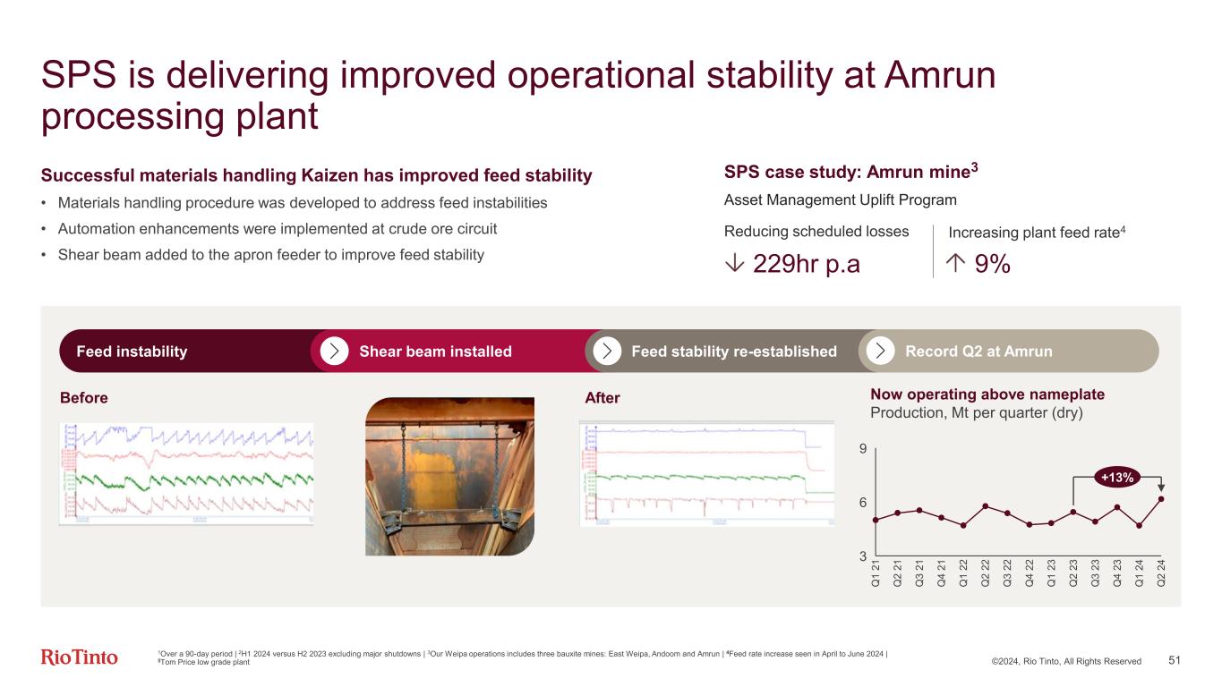 ©2024, Rio Tinto, All Rights Reserved 51 SPS is delivering improved operational stability at Amrun processing plant Successful materials handling Kaizen has improved feed stability • Materials handling procedure was developed to address feed instabilities • Automation enhancements were implemented at crude ore circuit • Shear beam added to the apron feeder to improve feed stability Before After 3 6 9 Q 1 21 Q 2 21 Q 3 21 Q 4 21 Q 1 22 Q 2 22 Q 3 22 Q 4 22 Q 1 23 Q 2 23 Q 3 23 Q 4 23 Q 1 24 Q 2 24 +13% Now operating above nameplate Production, Mt per quarter (dry) Feed instability Shear beam installed Feed stability re-established Record Q2 at Amrun SPS case study: Amrun mine3 Asset Management Uplift Program 9% Increasing plant feed rate4 229hr p.a Reducing scheduled losses 1Over a 90-day period | 2H1 2024 versus H2 2023 excluding major shutdowns | 3Our Weipa operations includes three bauxite mines: East Weipa, Andoom and Amrun | 4Feed rate increase seen in April to June 2024 | 5Tom Price low grade plant