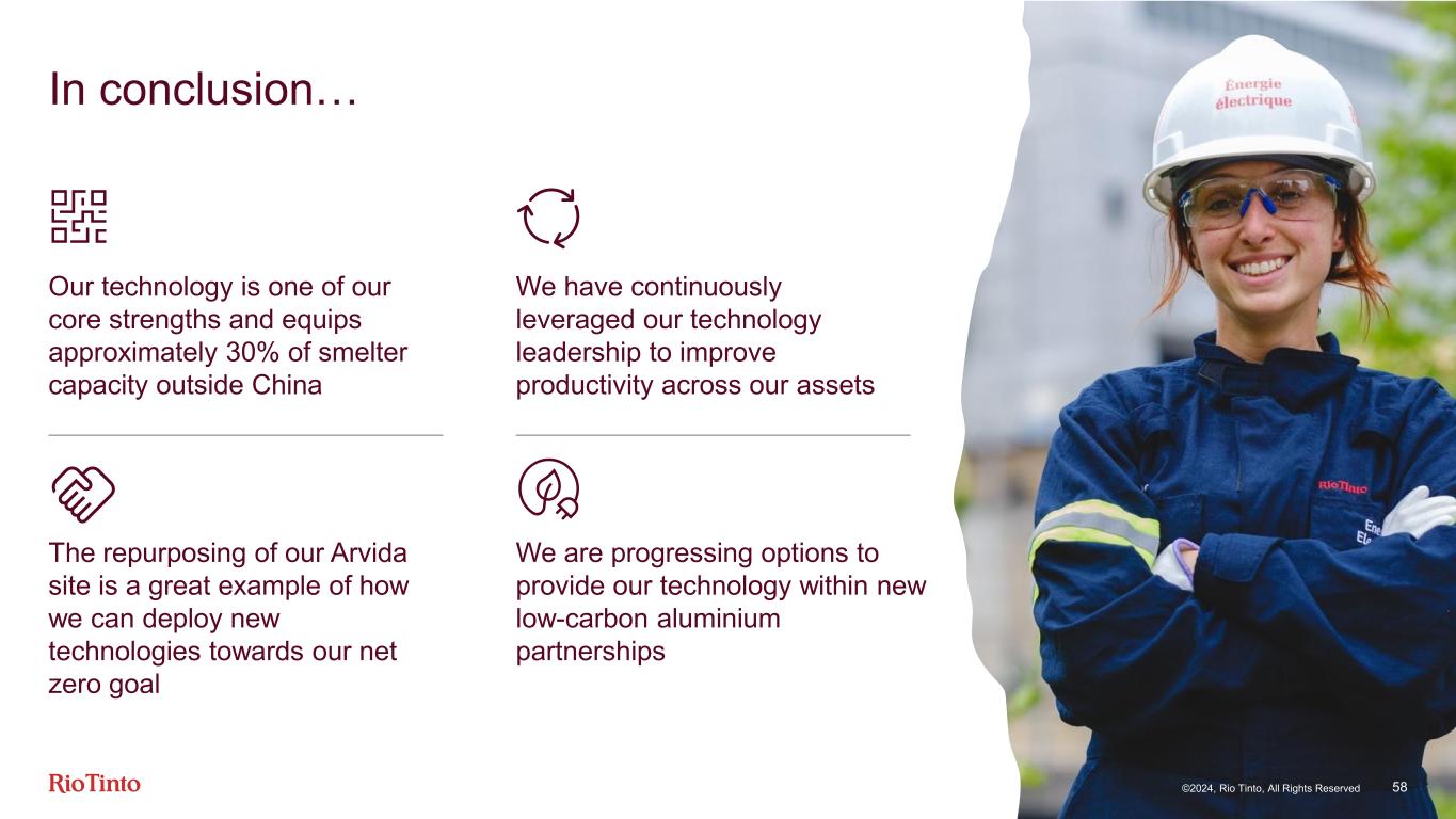 ©2024, Rio Tinto, All Rights Reserved 58 In conclusion… We have continuously leveraged our technology leadership to improve productivity across our assets Our technology is one of our core strengths and equips approximately 30% of smelter capacity outside China The repurposing of our Arvida site is a great example of how we can deploy new technologies towards our net zero goal We are progressing options to provide our technology within new low-carbon aluminium partnerships