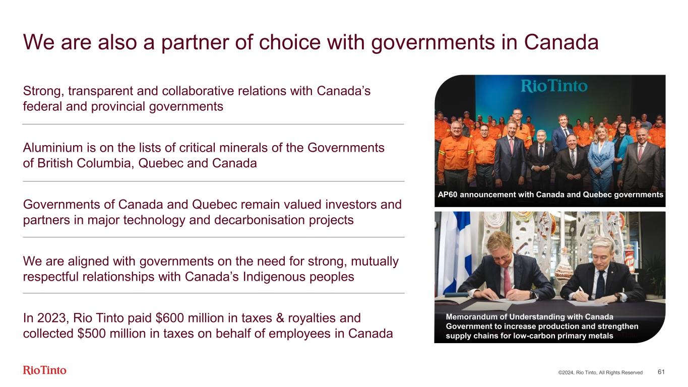 AP60 announcement with Canada and Quebec governments Memorandum of Understanding with Canada Government to increase production and strengthen supply chains for low-carbon primary metals ©2024, Rio Tinto, All Rights Reserved 61 We are also a partner of choice with governments in Canada Strong, transparent and collaborative relations with Canada’s federal and provincial governments Aluminium is on the lists of critical minerals of the Governments of British Columbia, Quebec and Canada Governments of Canada and Quebec remain valued investors and partners in major technology and decarbonisation projects We are aligned with governments on the need for strong, mutually respectful relationships with Canada’s Indigenous peoples In 2023, Rio Tinto paid $600 million in taxes & royalties and collected $500 million in taxes on behalf of employees in Canada