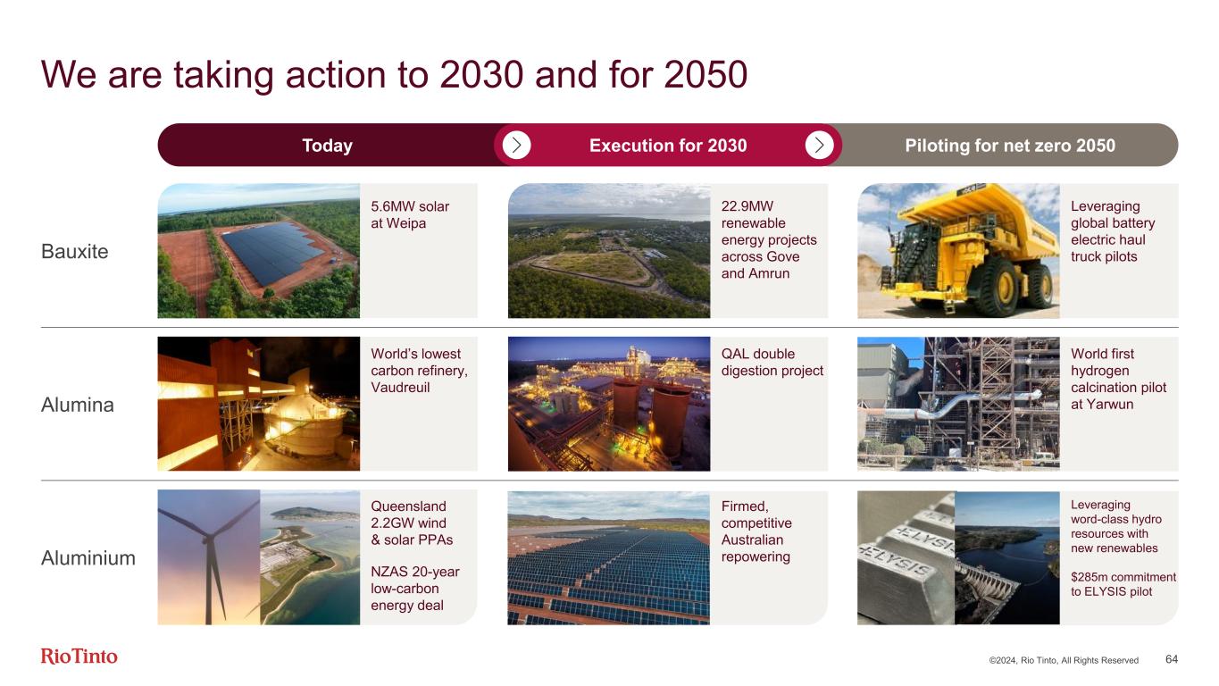Bauxite ©2024, Rio Tinto, All Rights Reserved 63 Our aluminium business is at the core of a net zero Rio Tinto Advancing renewable power and low-carbon mining fleets Progressing industry breakthroughs towards zero-carbon alumina Rest of Rio Tinto Other1 Anodes Pacific electricity supply Alumina Equity basis Rio Tinto Scope 1&2 emissions in 2023 Taking action to transform the full value chain toward net zero Aluminium represents 74% of group emissions Bauxite Transitioning to net zero through a fully renewable global portfolio and innovative smelting processes Aluminium Alumina 1 Other includes electricity emissions from Sohar and ISAL.