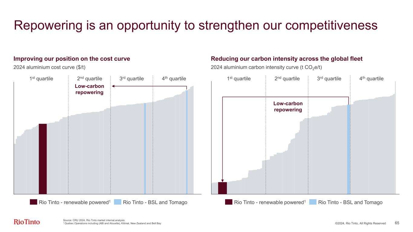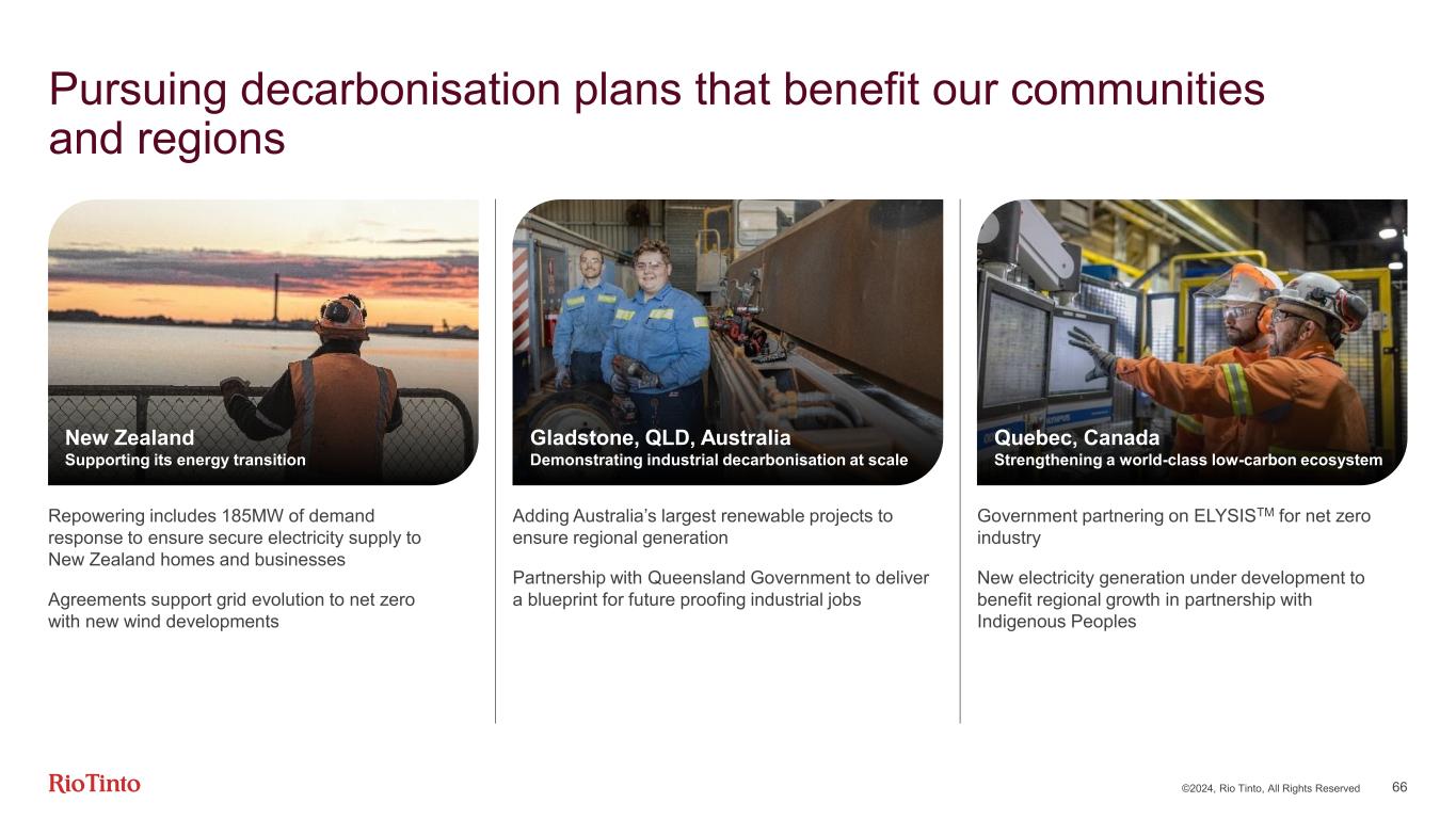 ©2024, Rio Tinto, All Rights Reserved 65 Repowering is an opportunity to strengthen our competitiveness Reducing our carbon intensity across the global fleet 2024 aluminium cost curve ($/t) Rio Tinto - renewable powered1 Rio Tinto - BSL and Tomago 1st quartile 2nd quartile 3rd quartile 4th quartile Low-carbon repowering 2024 aluminium carbon intensity curve (t CO2e/t) Source: CRU 2024, Rio Tinto market internal analysis 1 Quebec Operations including (ABI and Alouette), Kitimat, New Zealand and Bell Bay Rio Tinto - renewable powered1 Rio Tinto - BSL and Tomago Low-carbon repowering Improving our position on the cost curve 1st quartile 2nd quartile 3rd quartile 4th quartile