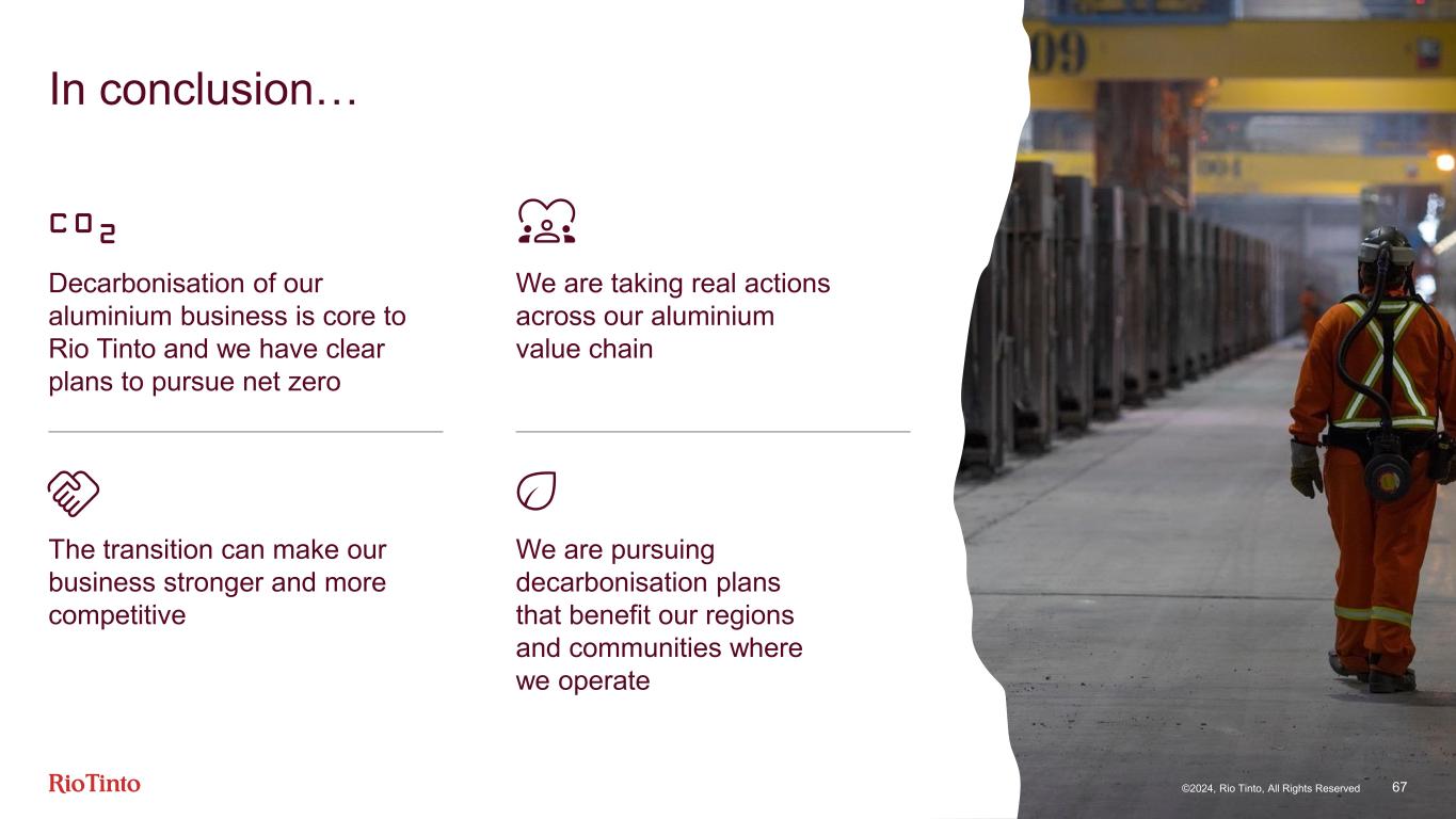 ©2024, Rio Tinto, All Rights Reserved 67 In conclusion… We are taking real actions across our aluminium value chain Decarbonisation of our aluminium business is core to Rio Tinto and we have clear plans to pursue net zero The transition can make our business stronger and more competitive We are pursuing decarbonisation plans that benefit our regions and communities where we operate