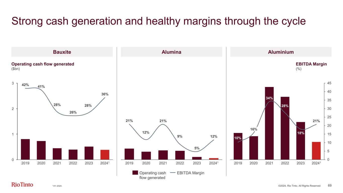 Aluminium ©2024, Rio Tinto, All Rights Reserved 69 Strong cash generation and healthy margins through the cycle 21% 2019 12% 2020 21% 2021 9% 2022 5% 2023 12% 20241 0 5 10 15 20 25 30 35 40 45 2019 16% 2020 34% 2021 2022 2023 21% 20241 0 1 2 3 42% 2019 41% 2020 28% 2021 26% 2022 28% 2023 36% 20241 Operating cash flow generated ($bn) AluminaBauxite EBITDA Margin (%) Operating cash flow generated EBITDA Margin 1 H1 2024. 10% 28% 18%