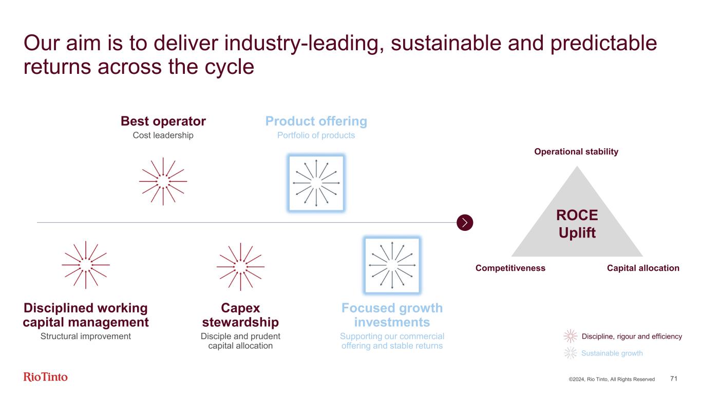 ©2024, Rio Tinto, All Rights Reserved 71 Our aim is to deliver industry-leading, sustainable and predictable returns across the cycle Best operator Cost leadership Product offering Portfolio of products Disciplined working capital management Structural improvement Capex stewardship Disciple and prudent capital allocation Focused growth investments Supporting our commercial offering and stable returns ROCE Uplift Operational stability Capital allocationCompetitiveness Discipline, rigour and efficiency Sustainable growth