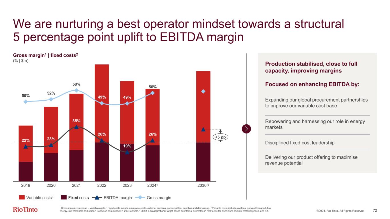 ©2024, Rio Tinto, All Rights Reserved 72 We are nurturing a best operator mindset towards a structural 5 percentage point uplift to EBITDA margin 22% 50% 2019 23% 52% 2020 35% 58% 2021 26% 49% 2022 19% 49% 2023 26% 56% 20244 2030f5 +5 pp Gross margin1 | fixed costs2 (% | $m) Variable costs3 Fixed costs EBITDA margin Gross margin Production stabilised, close to full capacity, improving margins Focused on enhancing EBITDA by: 1 Gross margin = revenue – variable costs. 2 Fixed costs include employee costs, external services, consumables, supplies and demurrage. 3 Variable costs include royalties, outward transport, fuel energy, raw materials and other. 4 Based on annualised H1 2024 actuals. 5 2030f is an aspirational target based on internal estimates in real terms for aluminium and raw material prices, and FX. Delivering our product offering to maximise revenue potential Expanding our global procurement partnerships to improve our variable cost base Repowering and harnessing our role in energy markets Disciplined fixed cost leadership