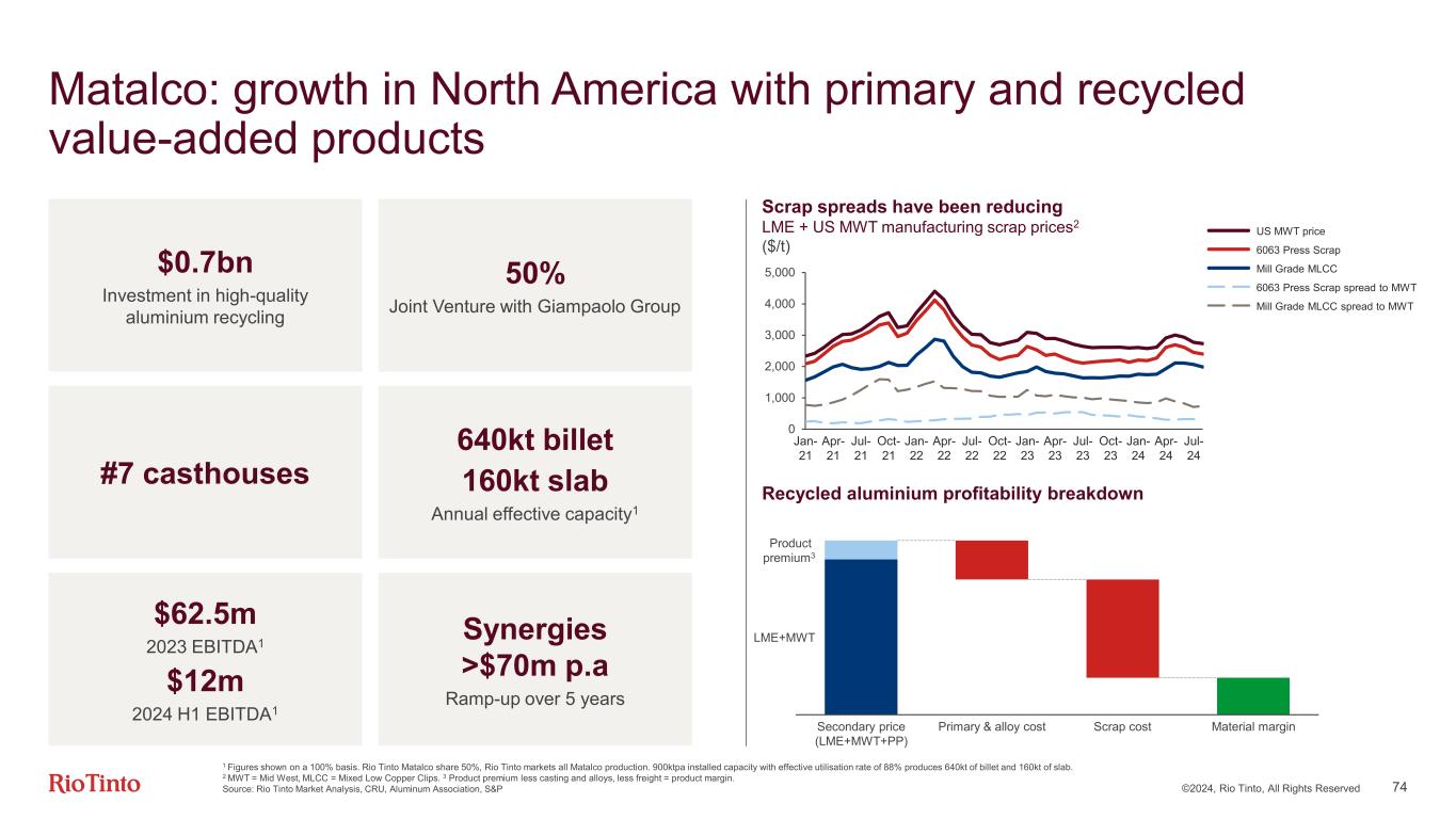©2024, Rio Tinto, All Rights Reserved 73 Our product offering - exceeded LME by ~20% over the last 5 years, with Matalco to provide further upside 1,801 1,685 2,441 2,703 2,258220 177 401 470 356 78 2019 63 2020 70 2021 109 2022 110 2023 Average (2019-2023) including premiums 2,600 Average (2019-2023) LME 2,150 2,099 1,925 2,912 3,282 2,724 Product premium Market premium LME Price realisation $/t 1.8 1.7 2019 1.4 1.9 2020 1.7 1.7 2021 1.6 1.6 2022 1.5 1.8 2023 2030F 3.5 3.4 3.3 3.2 3.3 Full Potential Portfolio production Mt Matalco further reinforces our value offering with 100% recycled value-added products Capacity to ramp up and optimise combined primary and secondary portfolios Secondary VAP Primary VAP Remelt Expect product premiums (averaging $86/t in the last five years) to continue to expand and with our portfolio we are best placed to benefit Our geographic proximity to markets is a differentiator Our share of value added products is increasing