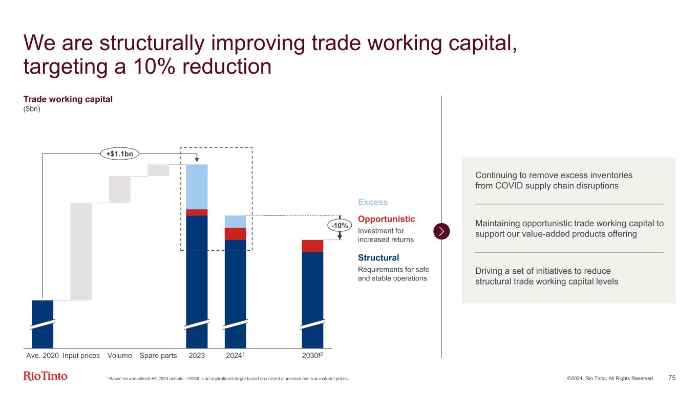 ©2024, Rio Tinto, All Rights Reserved 75 We are structurally improving trade working capital, targeting a 10% reduction Input prices Volume Spare parts 2023 20241 2030f2Ave. 2020 -10% +$1.1bn Excess Opportunistic Investment for increased returns Structural Requirements for safe and stable operations Trade working capital ($bn) Continuing to remove excess inventories from COVID supply chain disruptions Maintaining opportunistic trade working capital to support our value-added products offering Driving a set of initiatives to reduce structural trade working capital levels 1 Based on annualised H1 2024 actuals. 2 2030f is an aspirational target based on current aluminium and raw material prices.