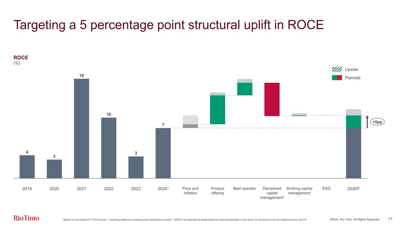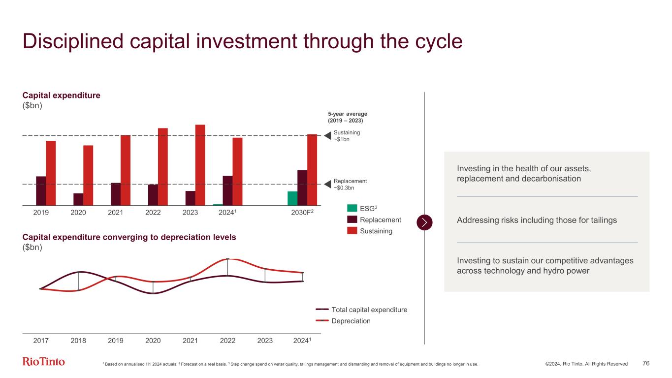 ©2024, Rio Tinto, All Rights Reserved 76 Disciplined capital investment through the cycle 2019 2020 2021 2022 2023 20241 2030F2 Sustaining ~$1bn Replacement ~$0.3bn ESG3 Replacement Sustaining Capital expenditure ($bn) 2017 2018 2019 2020 2021 2022 2023 20241 Capital expenditure converging to depreciation levels ($bn) Total capital expenditure Depreciation 5-year average (2019 – 2023) 1 Based on annualised H1 2024 actuals. 2 Forecast on a real basis. 3 Step change spend on water quality, tailings management and dismantling and removal of equipment and buildings no longer in use. Investing in the health of our assets, replacement and decarbonisation Addressing risks including those for tailings Investing to sustain our competitive advantages across technology and hydro power