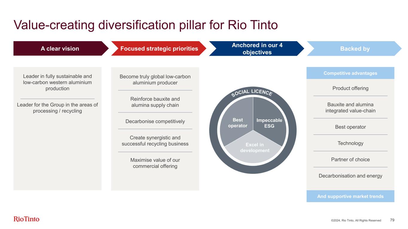 A clear vision Focused strategic priorities ©2024, Rio Tinto, All Rights Reserved 79 Value-creating diversification pillar for Rio Tinto Product offering Bauxite and alumina integrated value-chain Best operator Technology Partner of choice Decarbonisation and energy Competitive advantages Become truly global low-carbon aluminium producer Reinforce bauxite and alumina supply chain Decarbonise competitively Create synergistic and successful recycling business Maximise value of our commercial offering Leader in fully sustainable and low-carbon western aluminium production Leader for the Group in the areas of processing / recycling Anchored in our 4 objectives Backed by And supportive market trends