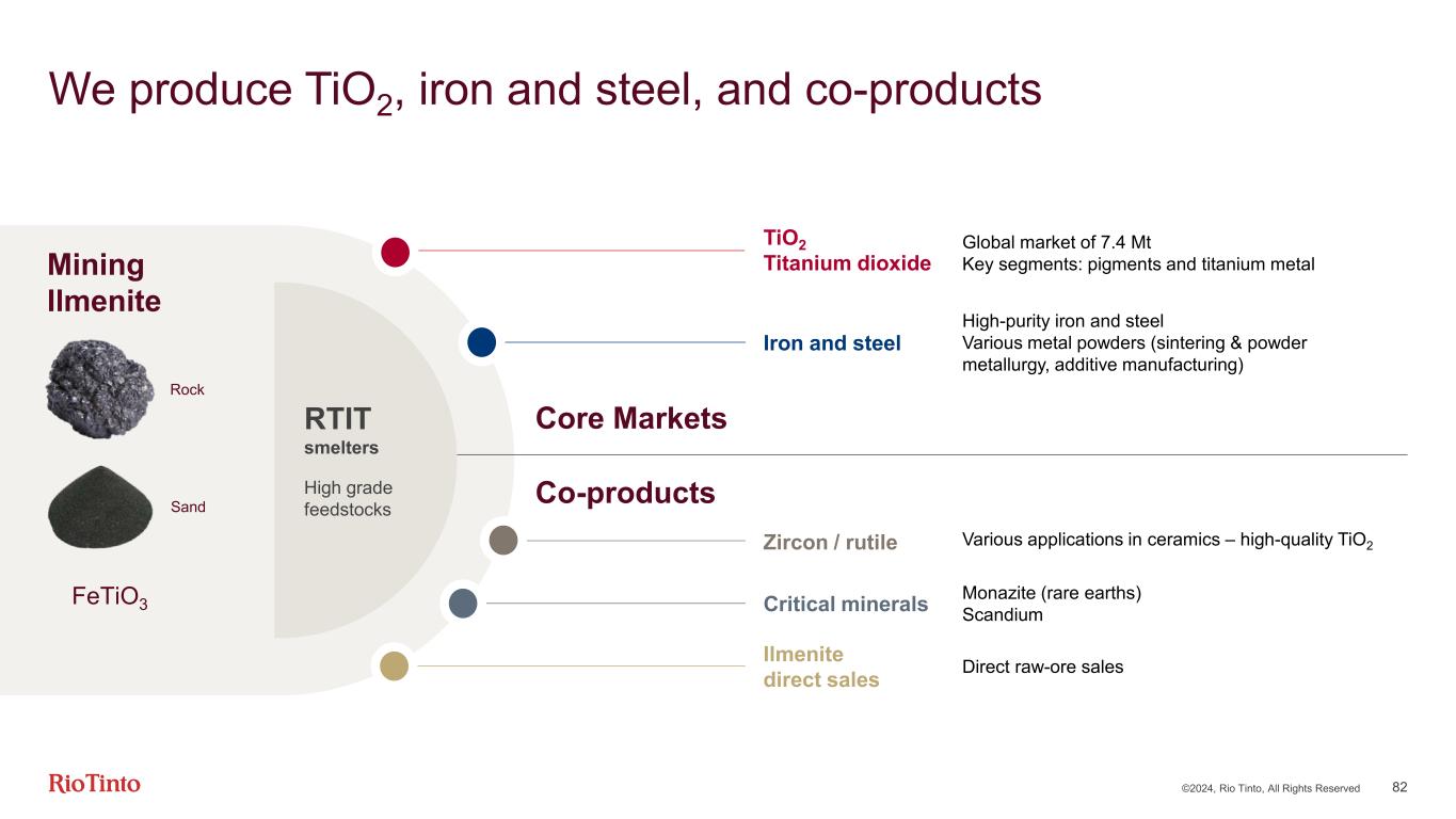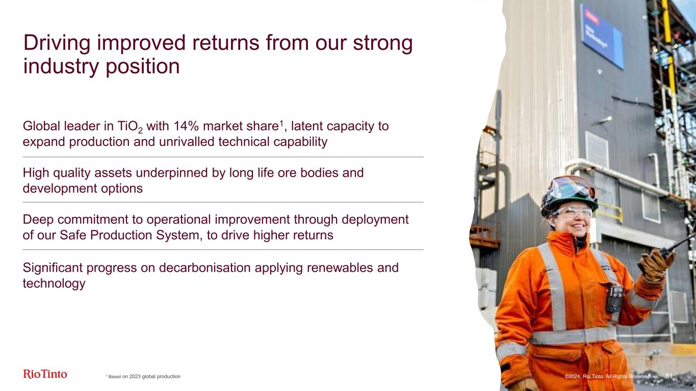 ©2024, Rio Tinto, All Rights Reserved 81 Driving improved returns from our strong industry position 1 Based on 2023 global production High quality assets underpinned by long life ore bodies and development options Significant progress on decarbonisation applying renewables and technology Global leader in TiO2 with 14% market share1, latent capacity to expand production and unrivalled technical capability Deep commitment to operational improvement through deployment of our Safe Production System, to drive higher returns