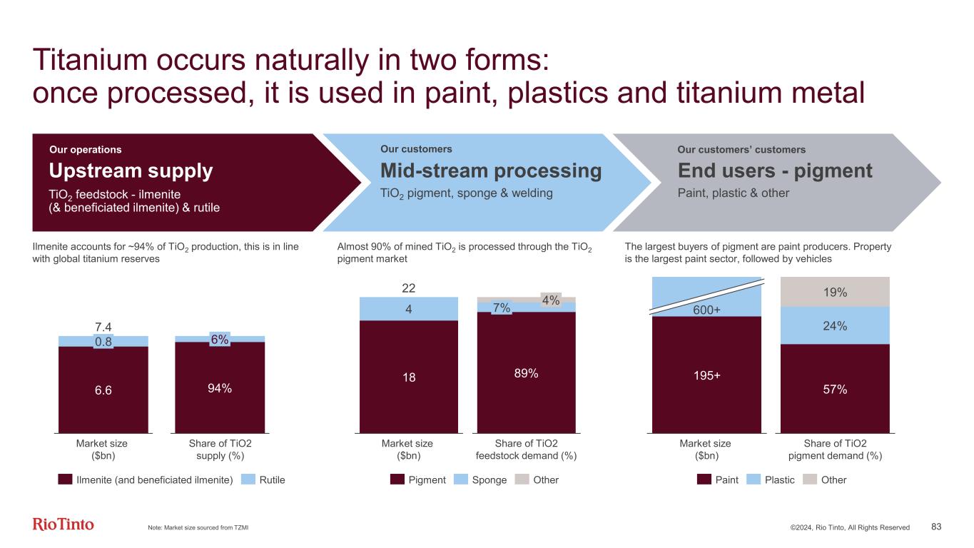 Co-products ©2024, Rio Tinto, All Rights Reserved 82 We produce TiO2, iron and steel, and co-products Global market of 7.4 Mt Key segments: pigments and titanium metal TiO2 Titanium dioxide High-purity iron and steel Various metal powders (sintering & powder metallurgy, additive manufacturing) Iron and steel Various applications in ceramics – high-quality TiO2 Monazite (rare earths) Scandium Direct raw-ore sales FeTiO3 Mining Ilmenite Rock Sand RTIT smelters High grade feedstocks Core Markets Zircon / rutile Critical minerals Ilmenite direct sales