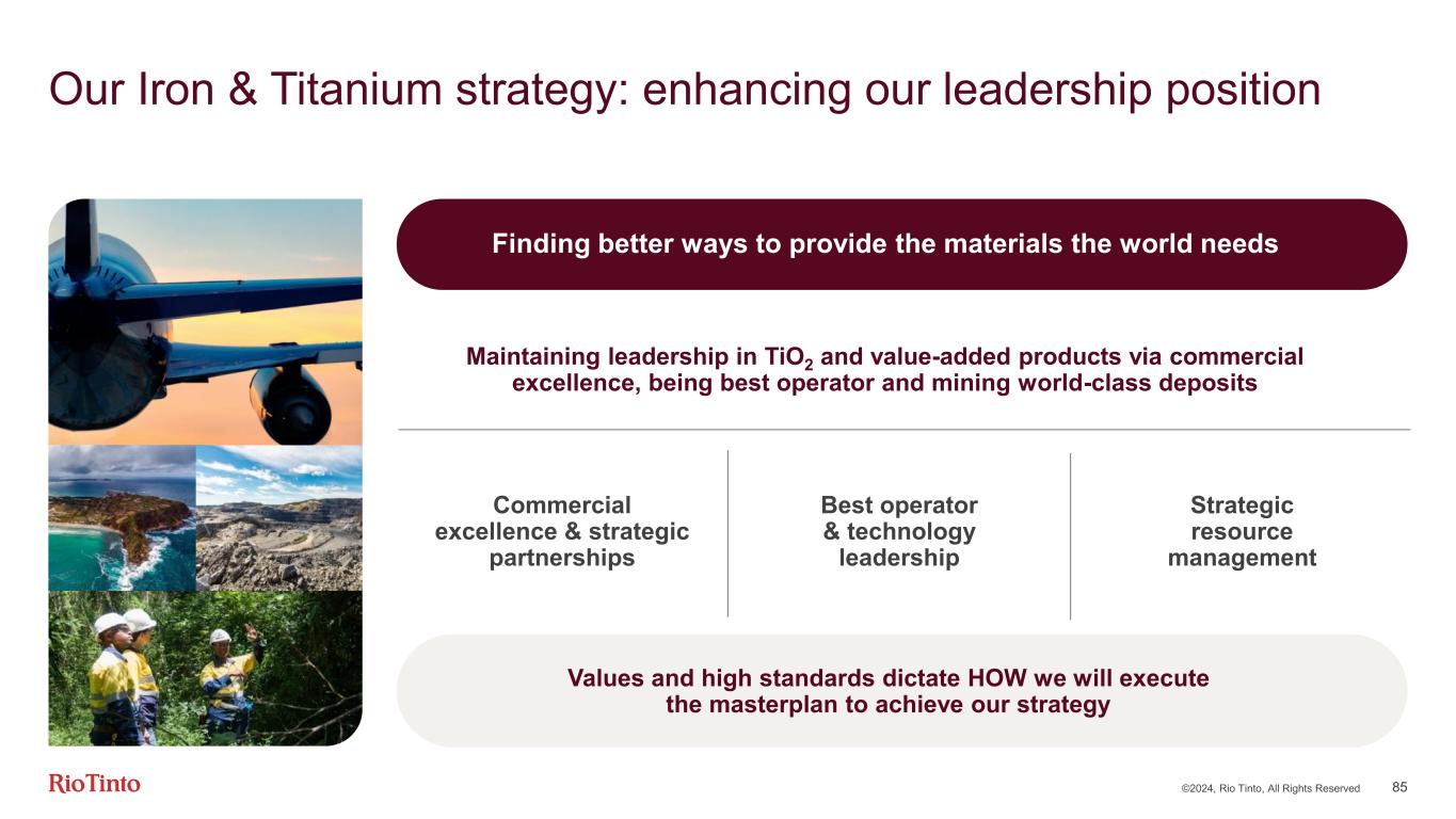 Values and high standards dictate HOW we will execute the masterplan to achieve our strategy ©2024, Rio Tinto, All Rights Reserved 85 Our Iron & Titanium strategy: enhancing our leadership position Commercial excellence & strategic partnerships Best operator & technology leadership Maintaining leadership in TiO2 and value-added products via commercial excellence, being best operator and mining world-class deposits Strategic resource management Finding better ways to provide the materials the world needs