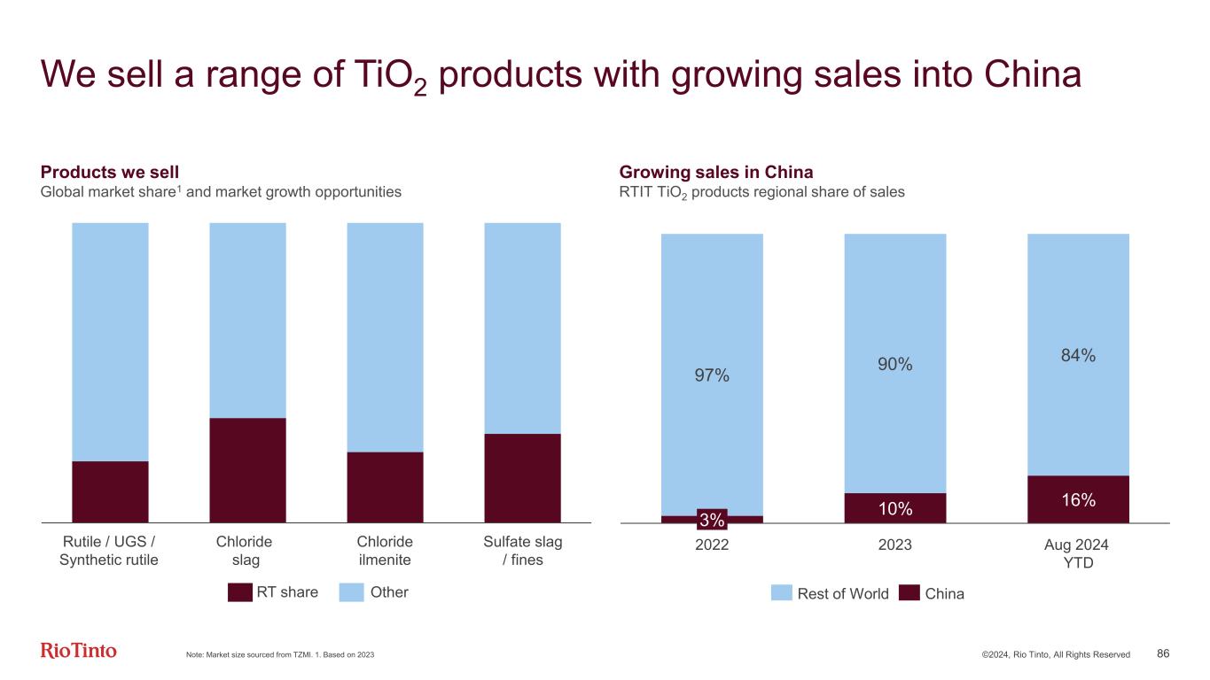 ©2024, Rio Tinto, All Rights Reserved 86 We sell a range of TiO2 products with growing sales into China Rutile / UGS / Synthetic rutile Chloride slag Chloride ilmenite Sulfate slag / fines Products we sell Global market share1 and market growth opportunities Growing sales in China RTIT TiO2 products regional share of sales 10% 16% 97% 90% 84% 3% 2022 2023 Aug 2024 YTD OtherRT share Rest of World China Note: Market size sourced from TZMI. 1. Based on 2023